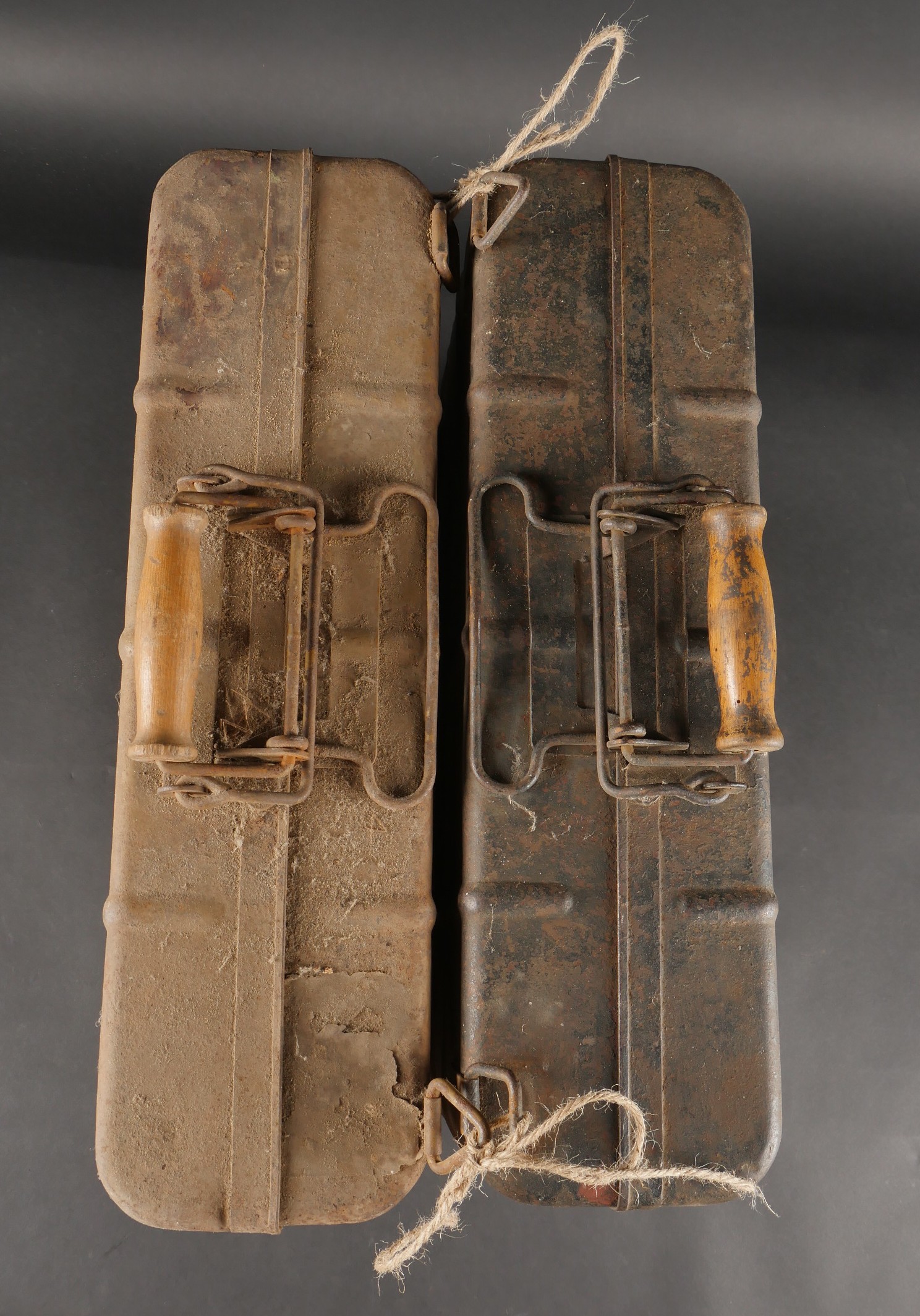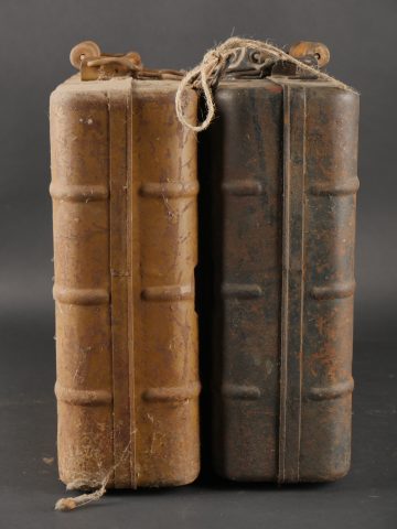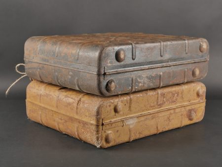 Détails de la vente >Lot de 2 valises pour grenades à manche. Une peinte couleur sable, à nettoyer, bel intérieur avec marquage für Tropen et étiquette. L’autre vert foncé, intérieur bleu. Les deux sans... en savoir plus