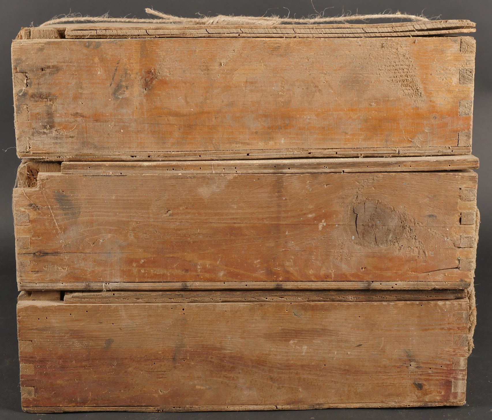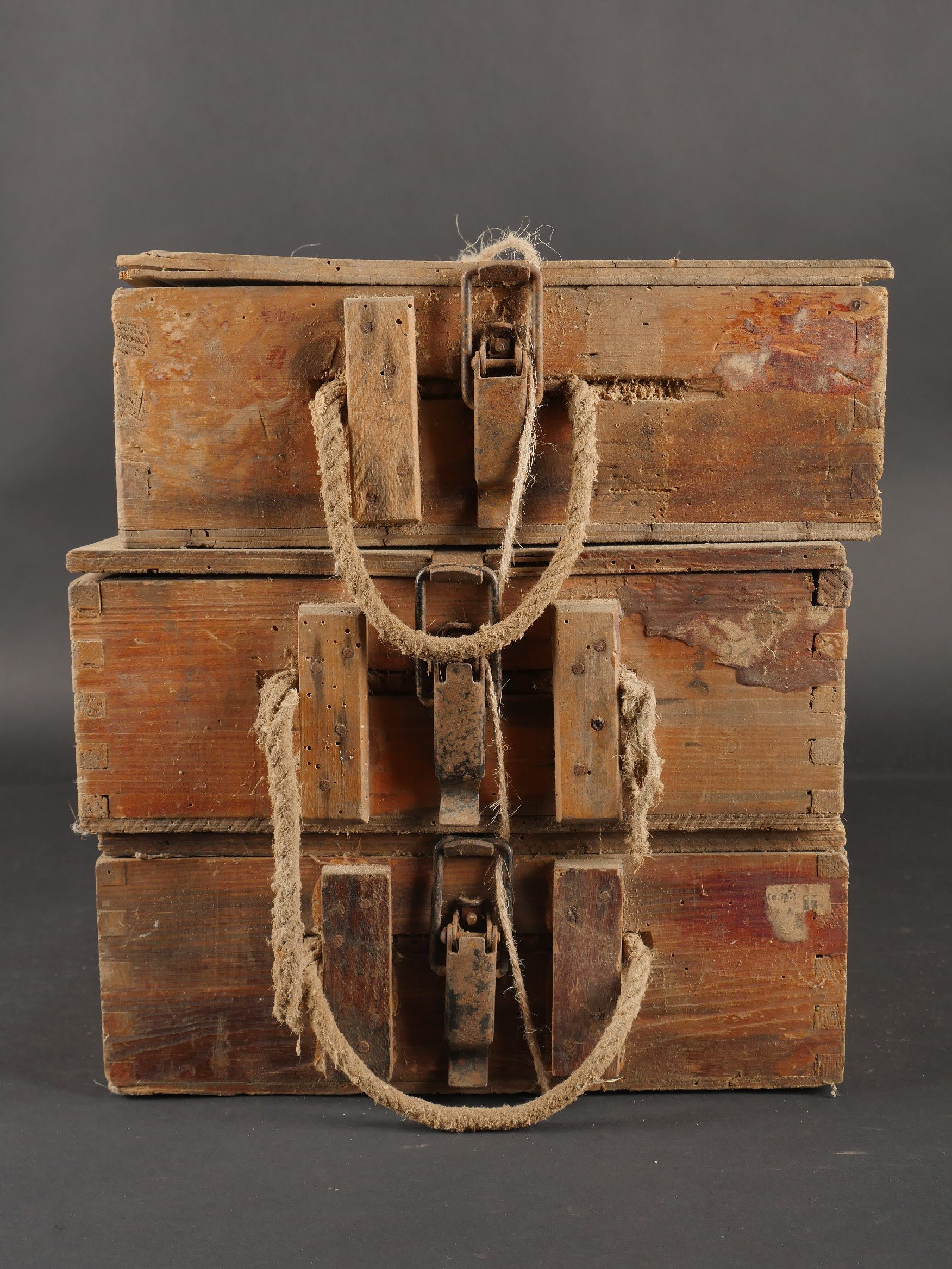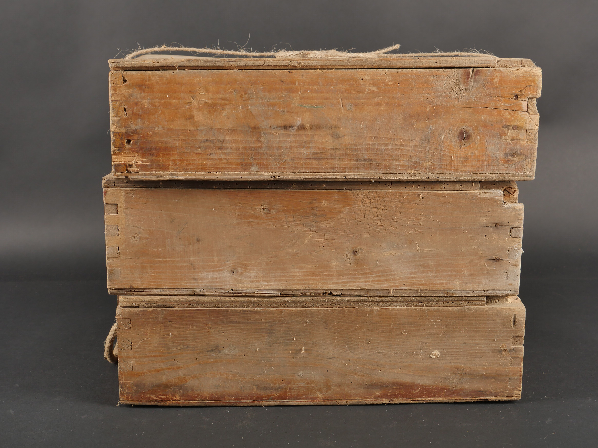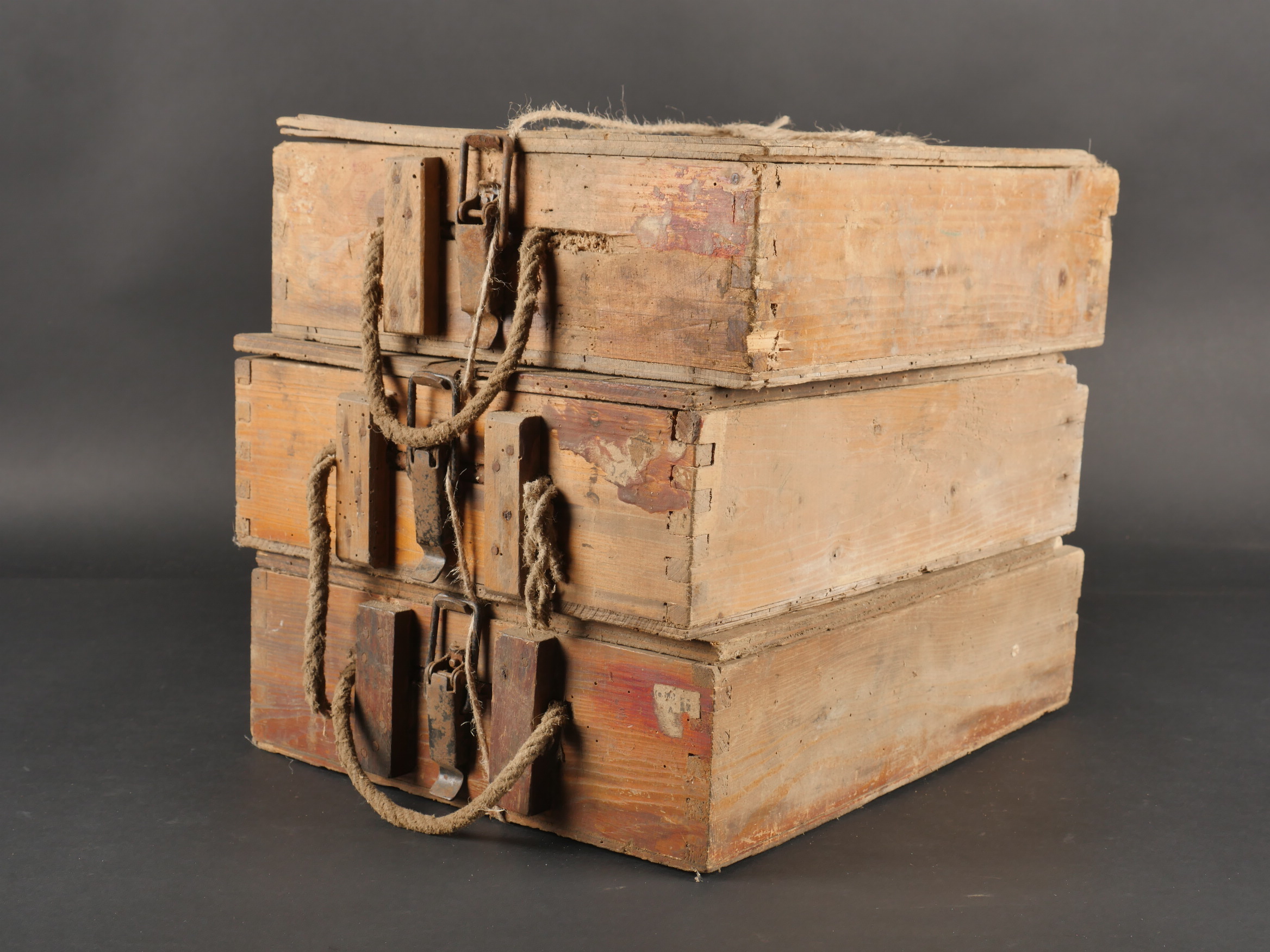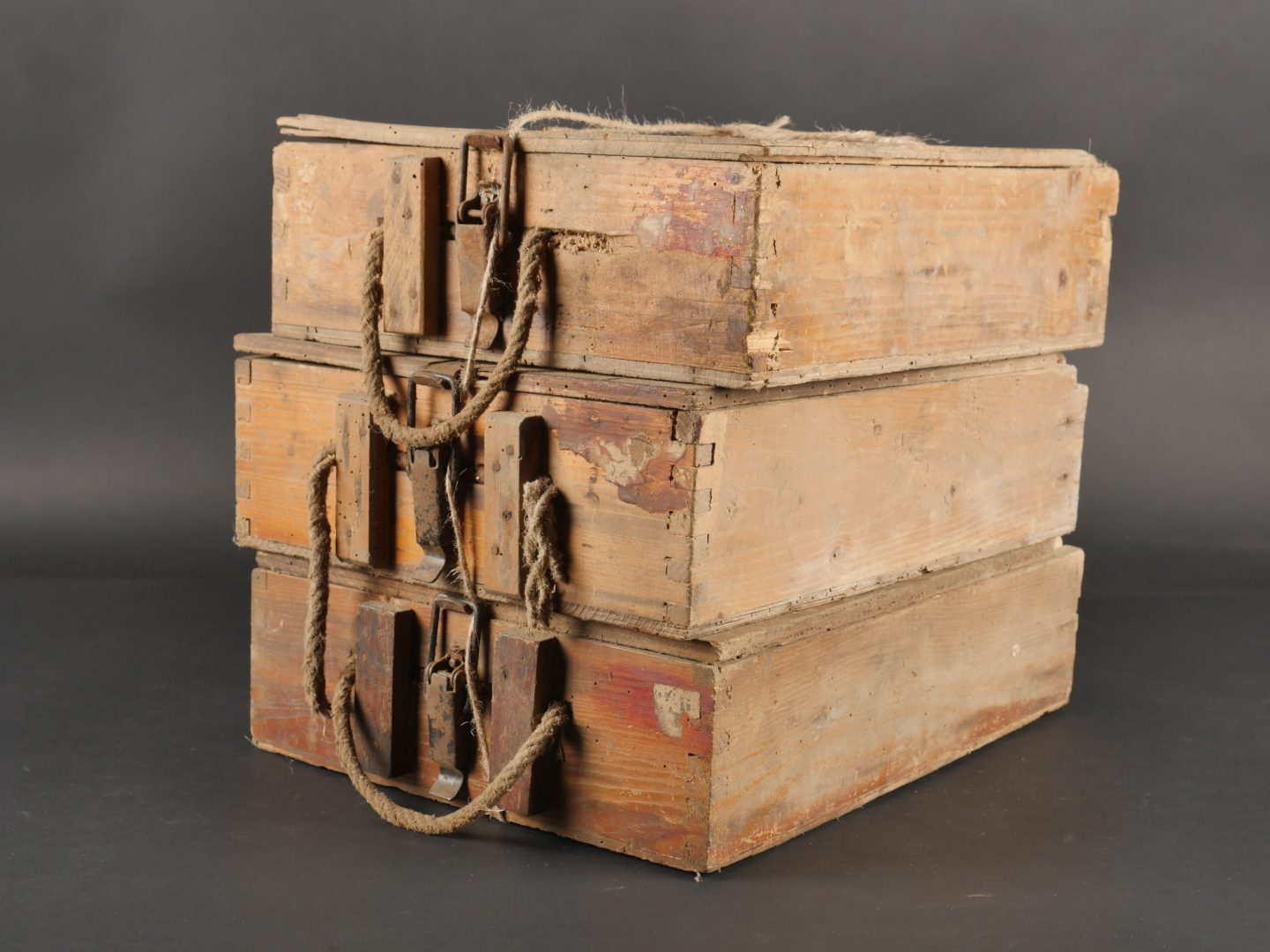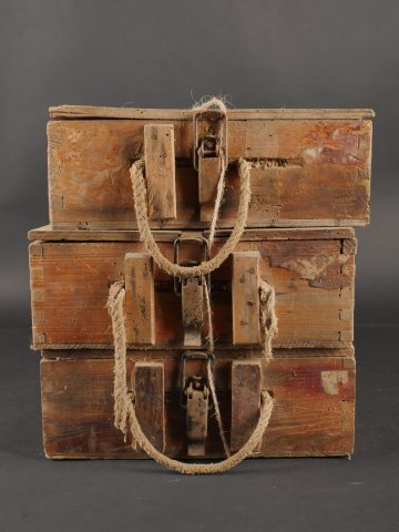 Lot de 3 caisses allemandes 8cm Wurfgranaten 34. Caisses en bois naturel, cales internes, restes d’étiquette, en l’état