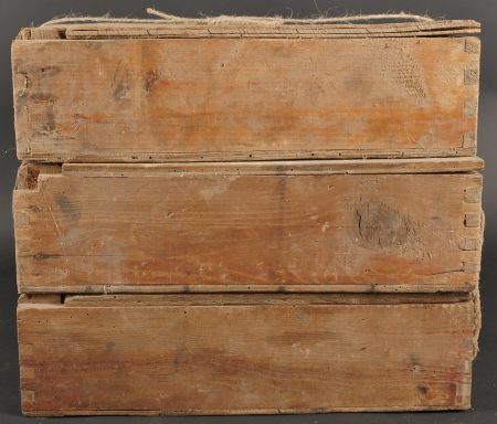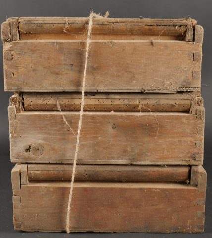 Détails de la vente >Lot de 3 caisses allemandes 8cm Wurfgranaten 34. Caisses en bois naturel, cales internes, restes d’étiquette, en l’état