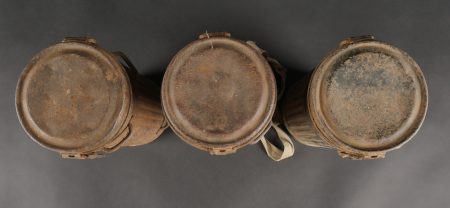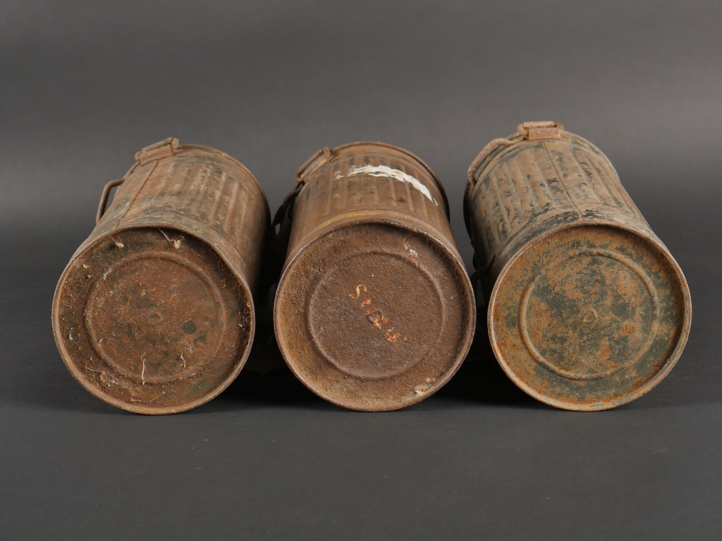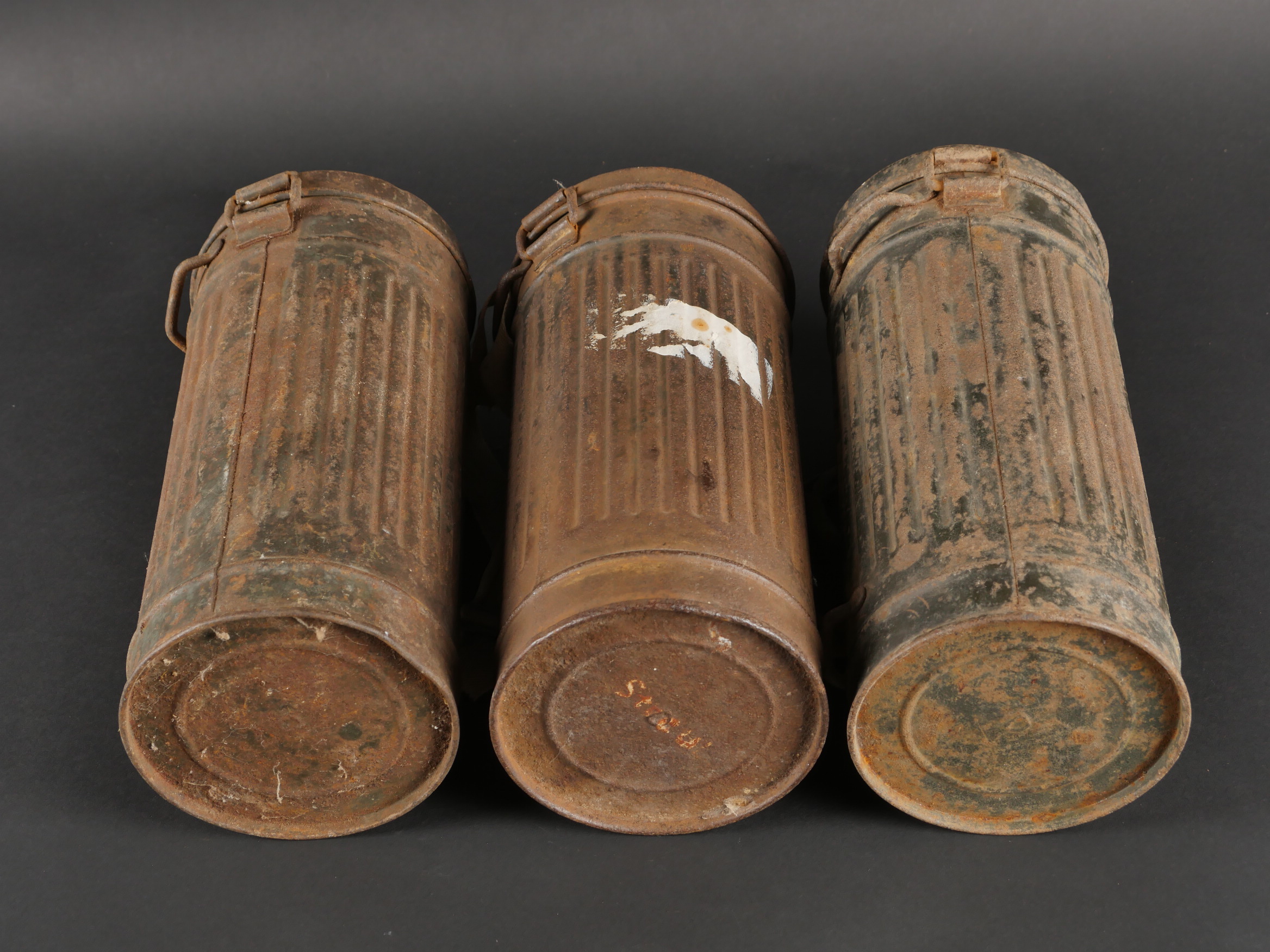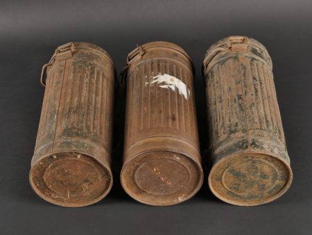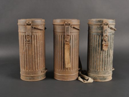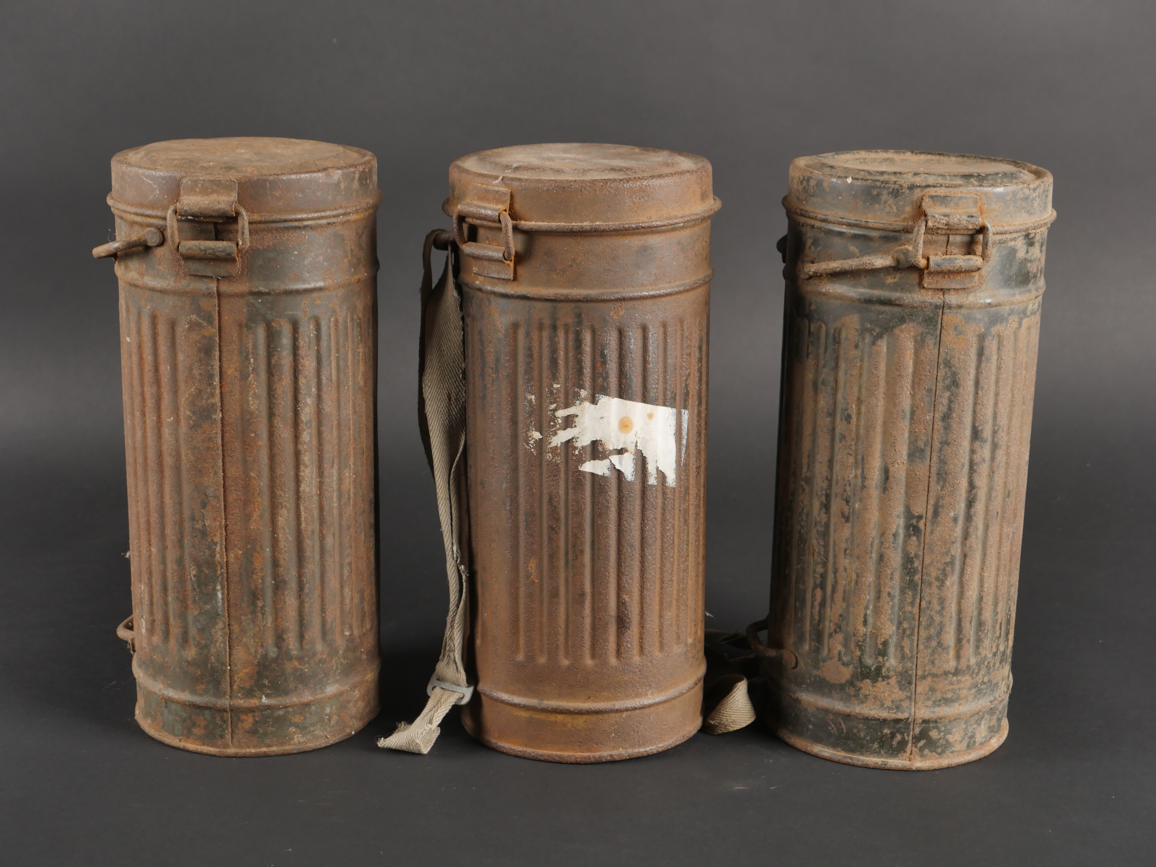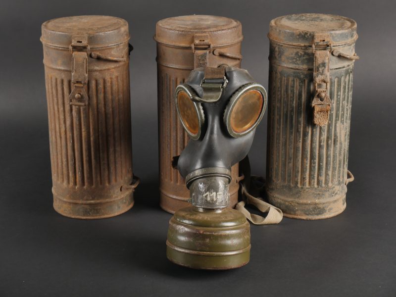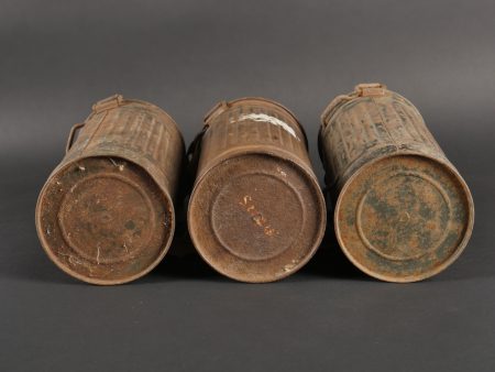 Détails de la vente >Lot de 3 masques anti-gaz allemands. Un boitier rouillé avec reste de sangle, masque et filtre, 2 boîtiers vides dont 1 en mauvais état