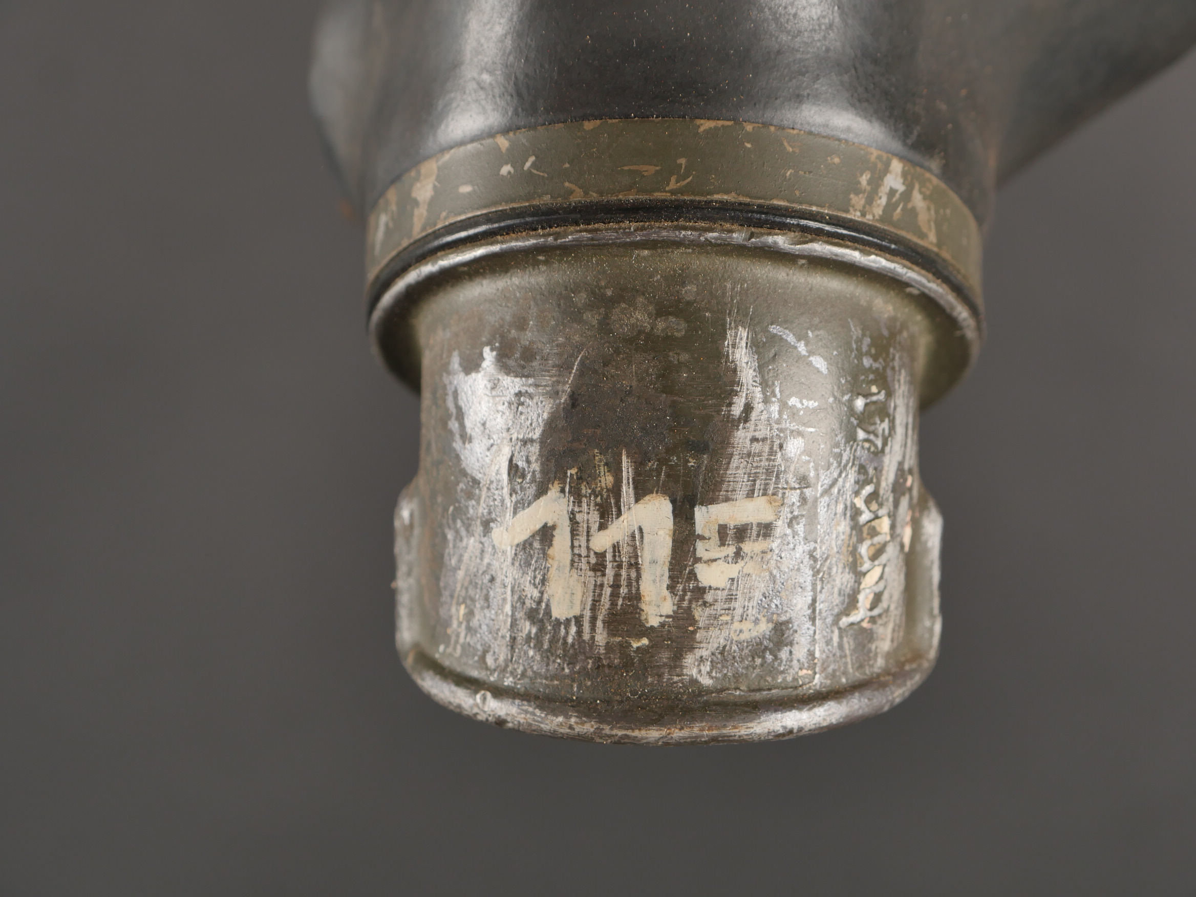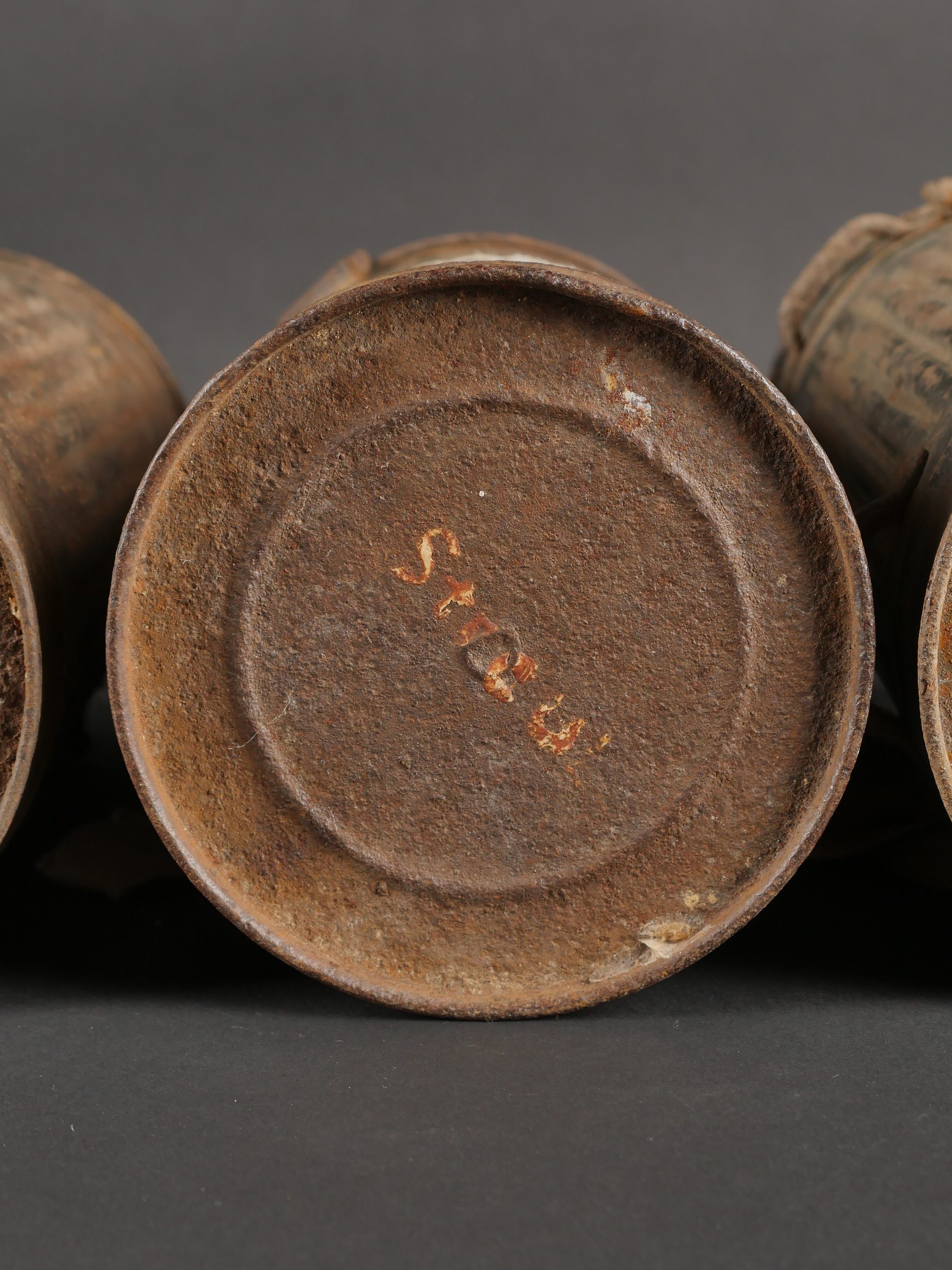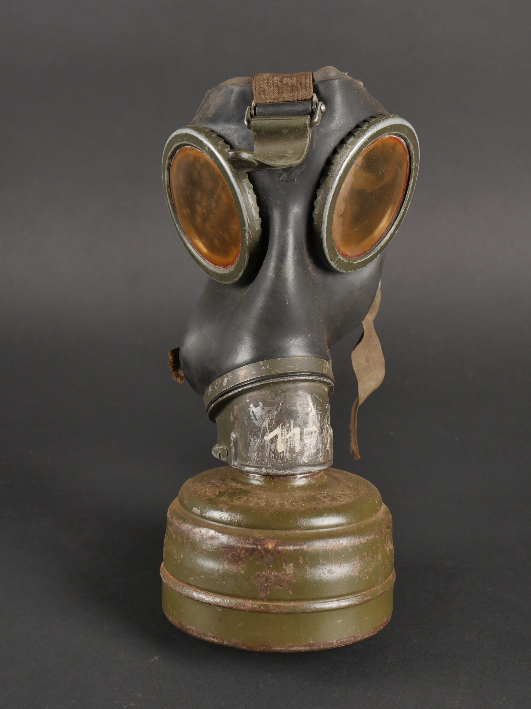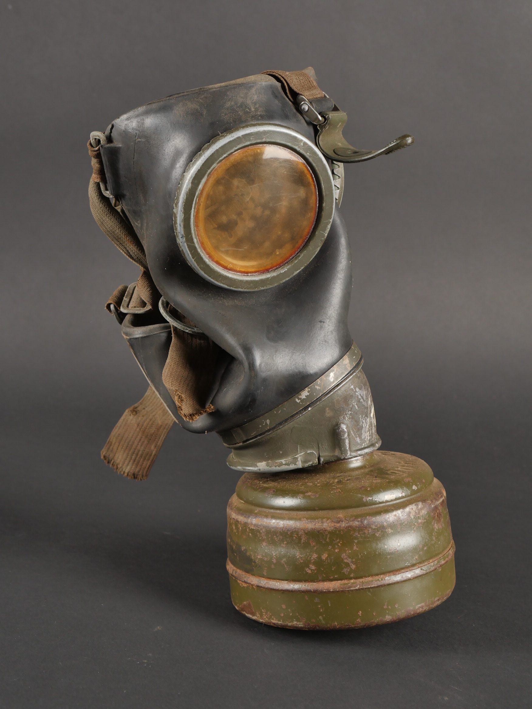 Détails de la vente >Lot de 3 masques anti-gaz allemands. Un boitier rouillé avec reste de sangle, masque et filtre, 2 boîtiers vides dont 1 en mauvais état