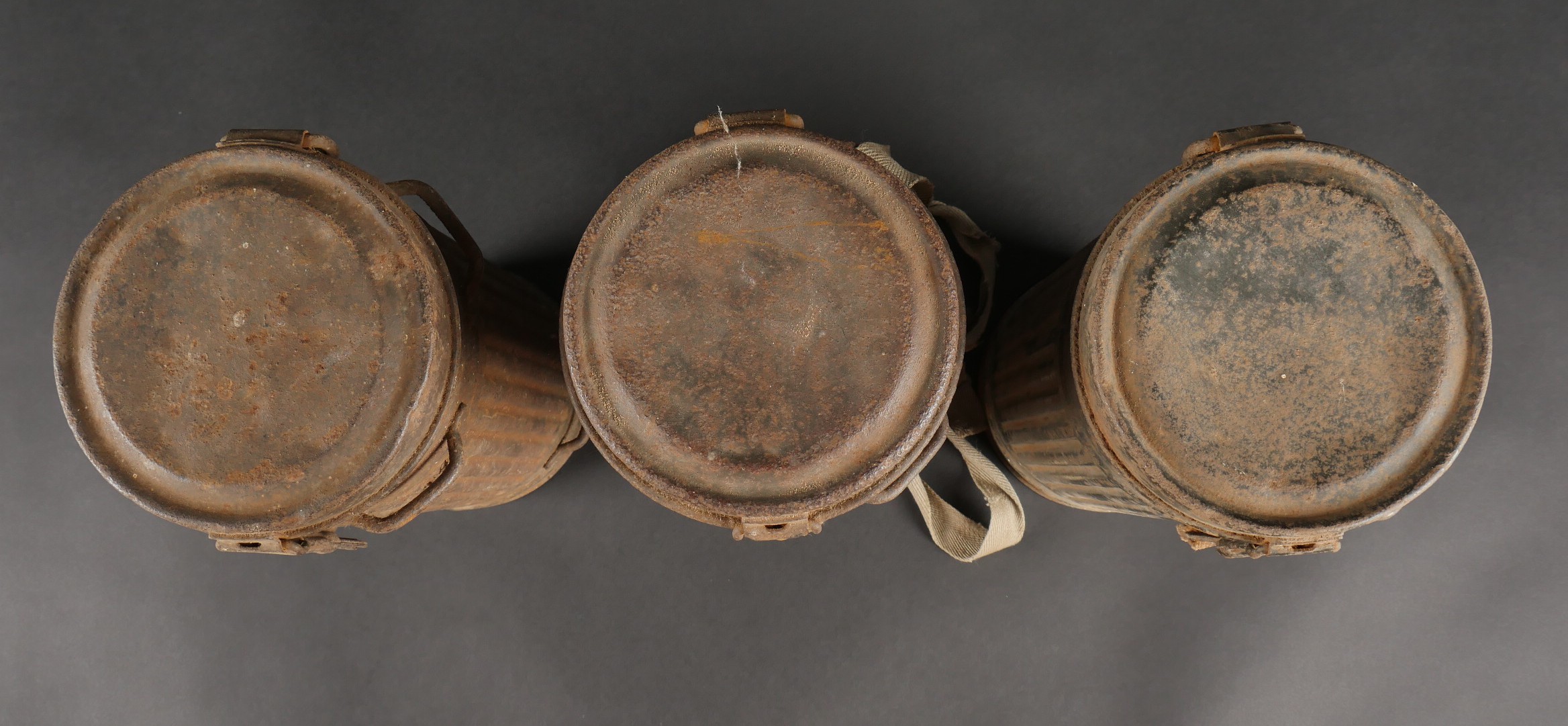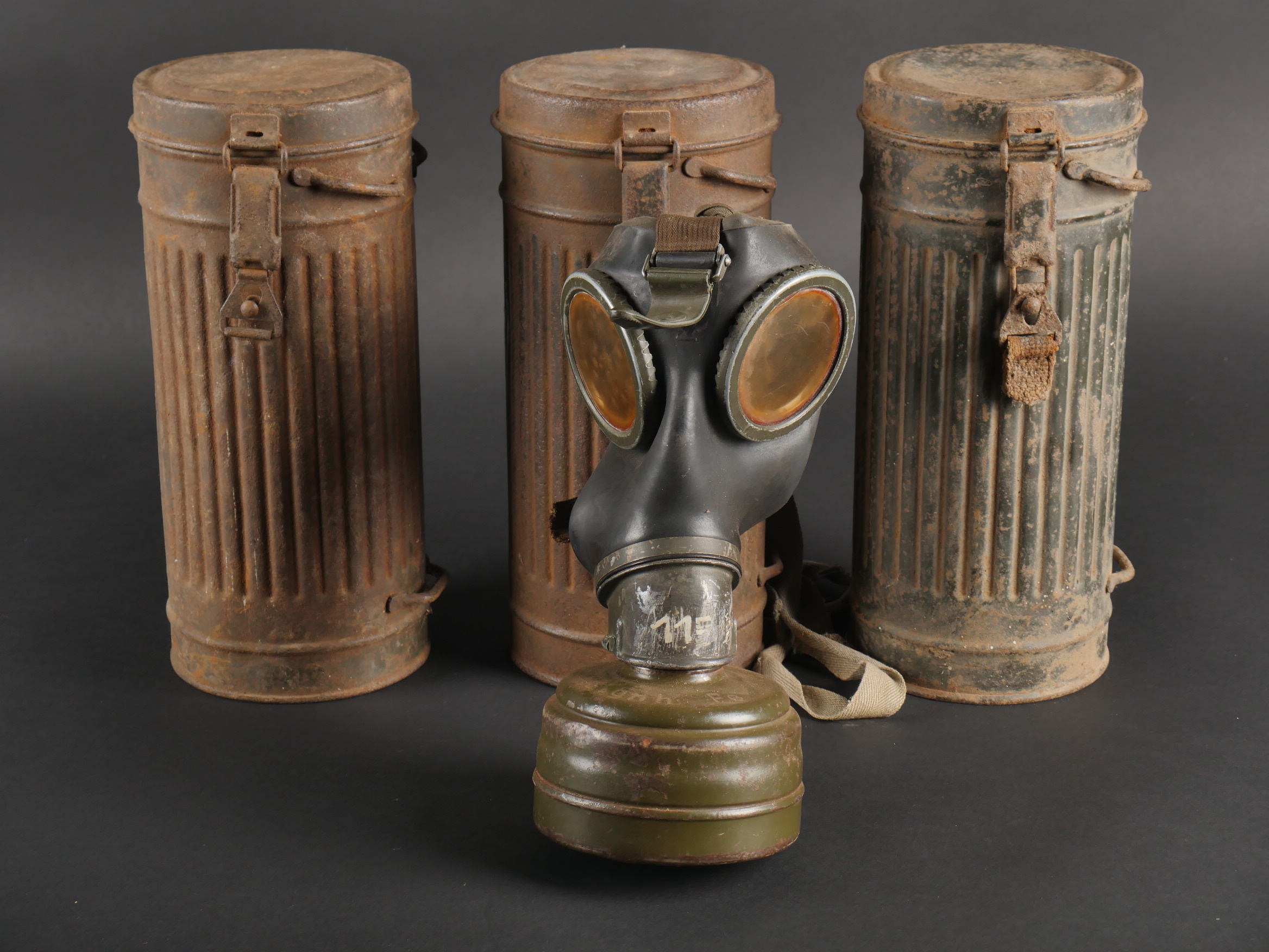 Lot de 3 masques anti-gaz allemands. Un boitier rouillé avec reste de sangle, masque et filtre, 2 boîtiers vides dont 1 en mauvais état