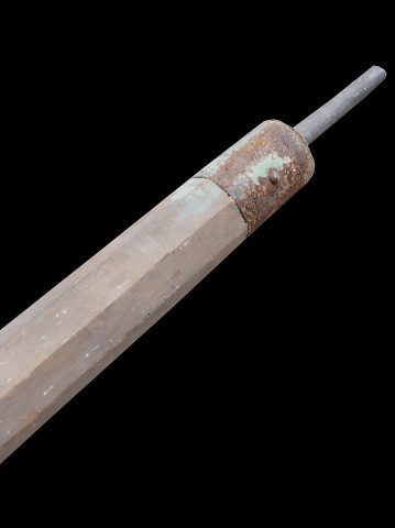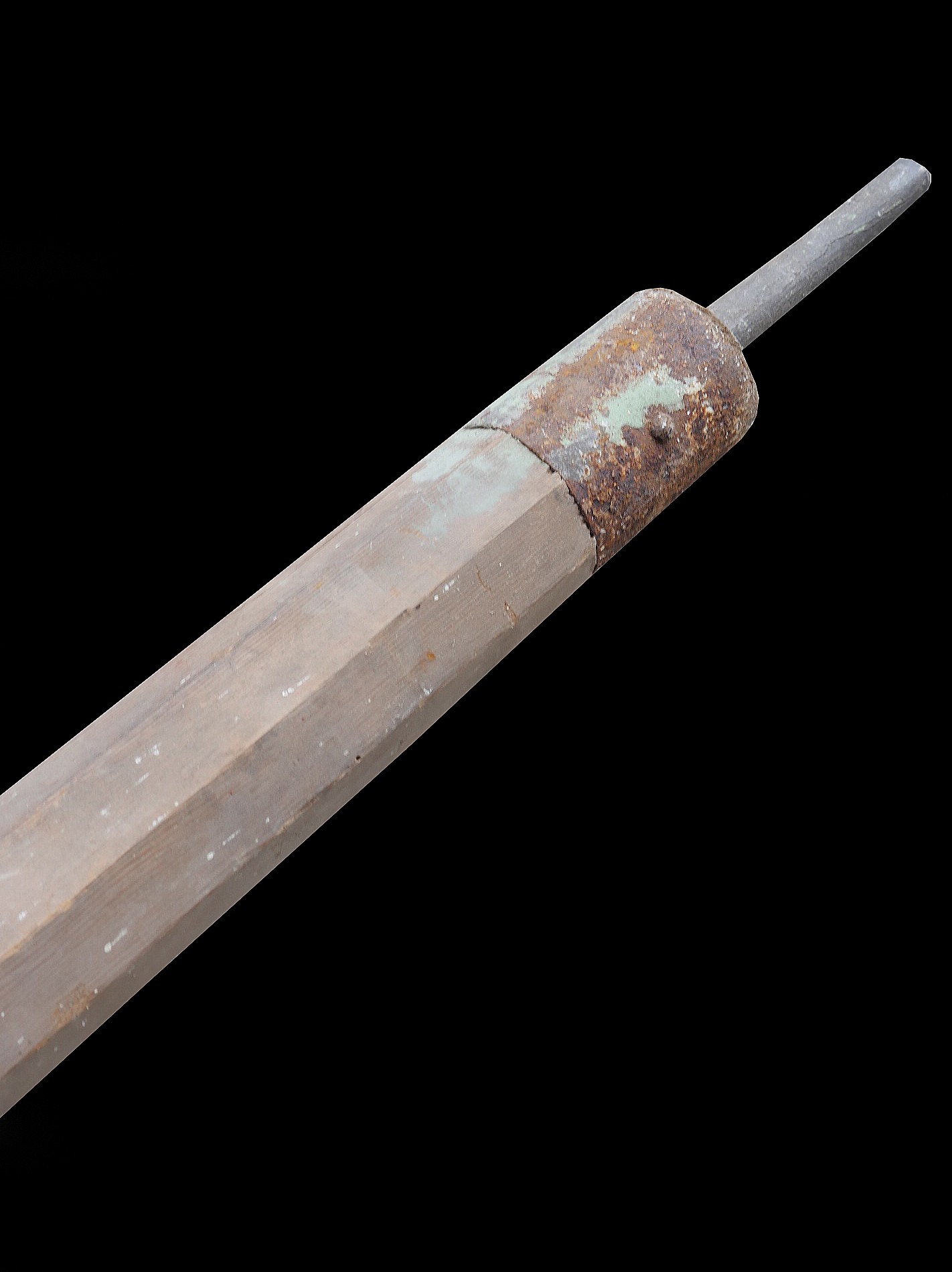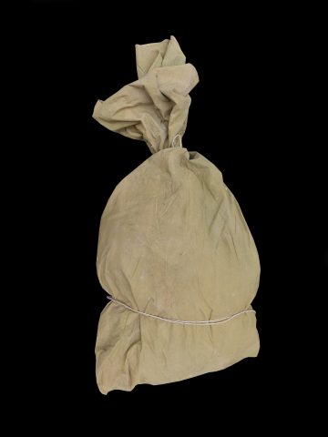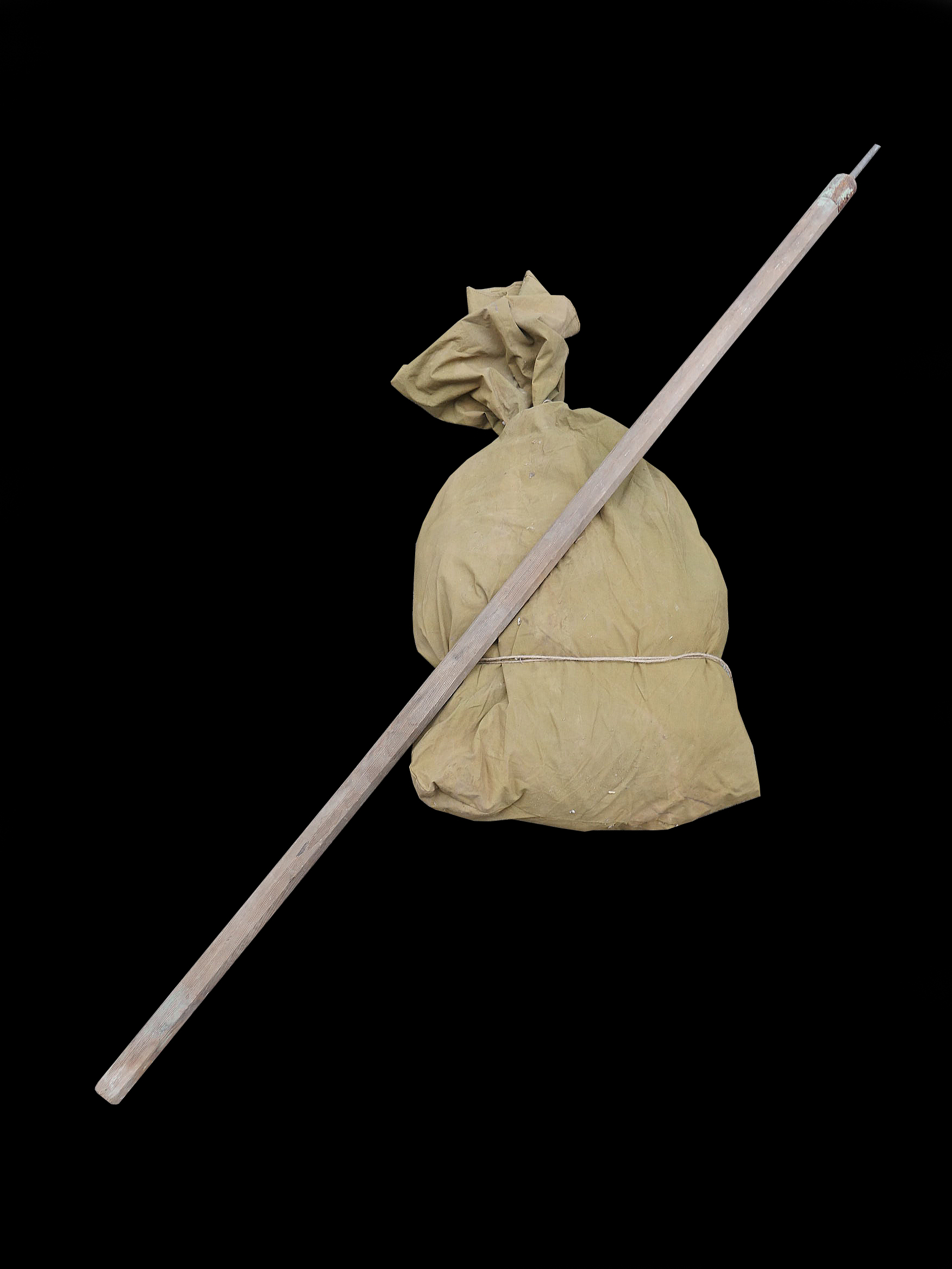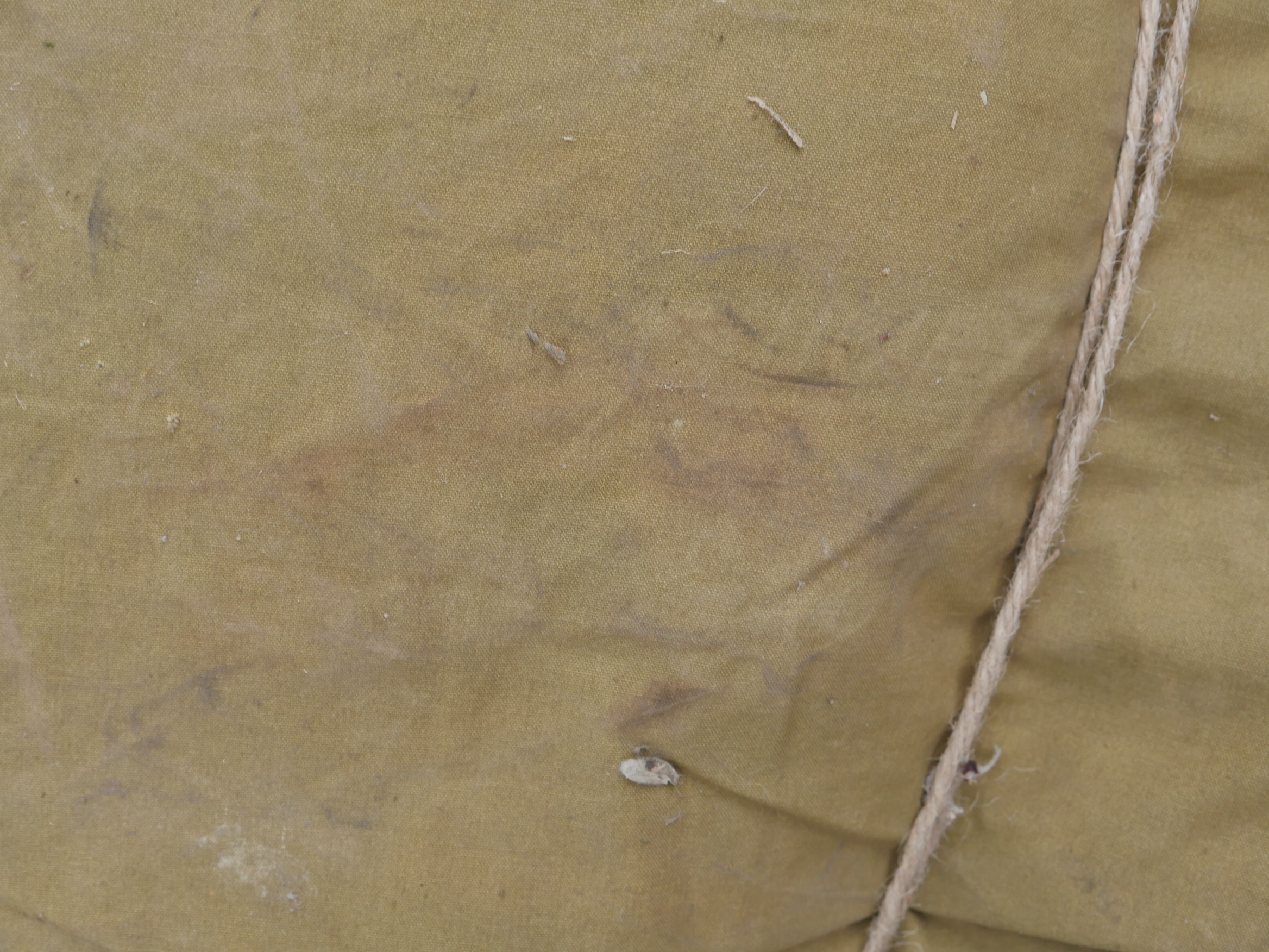 Détails de la vente >Lot de campement US. Mât de tente en bois, toile de tente datée Juin 1944 en mauvais état, toile matelassée, housse de traversin et divers
