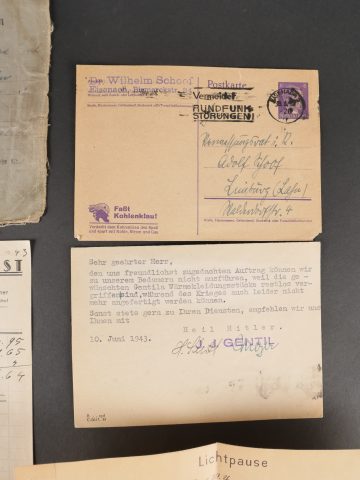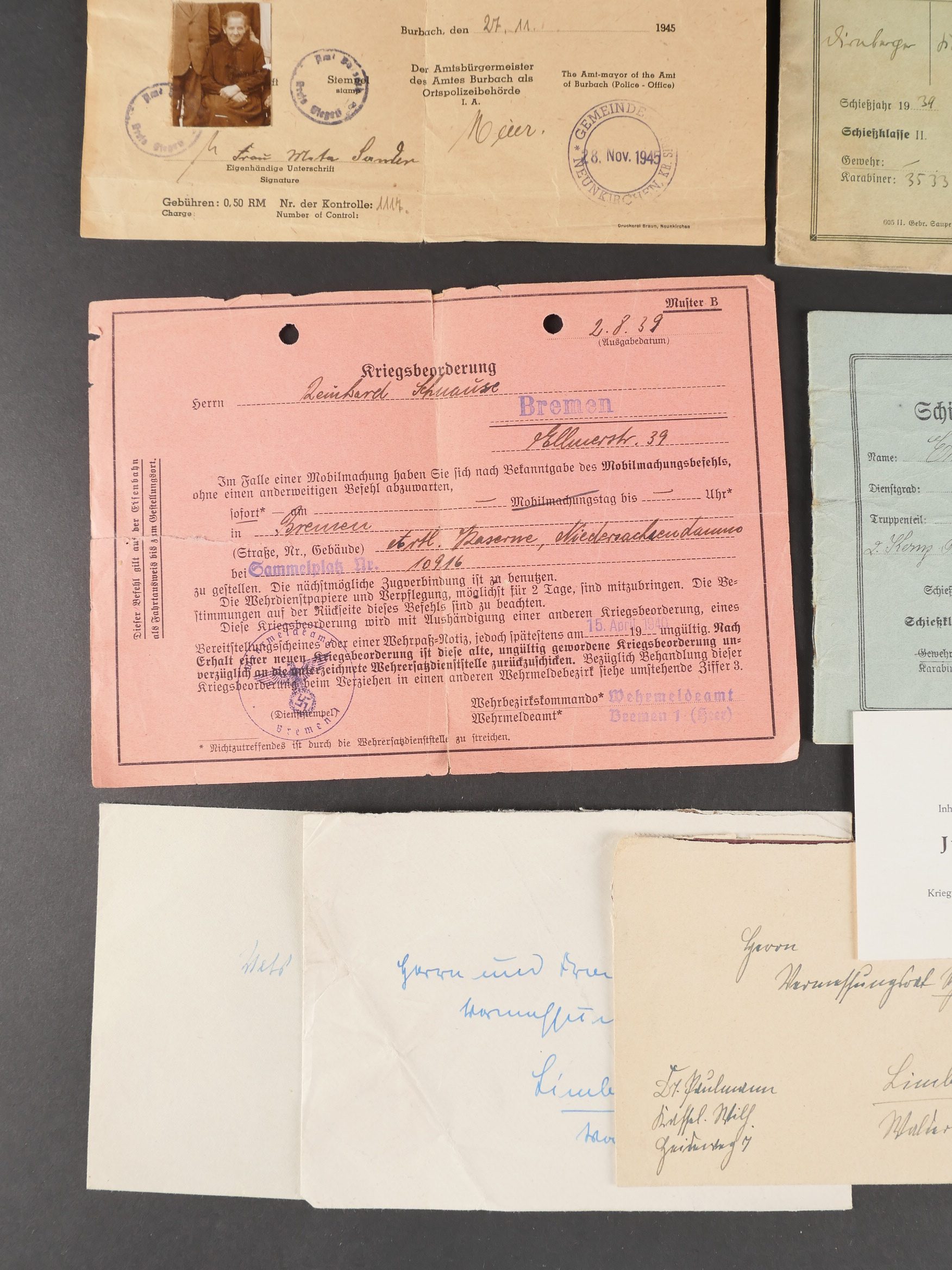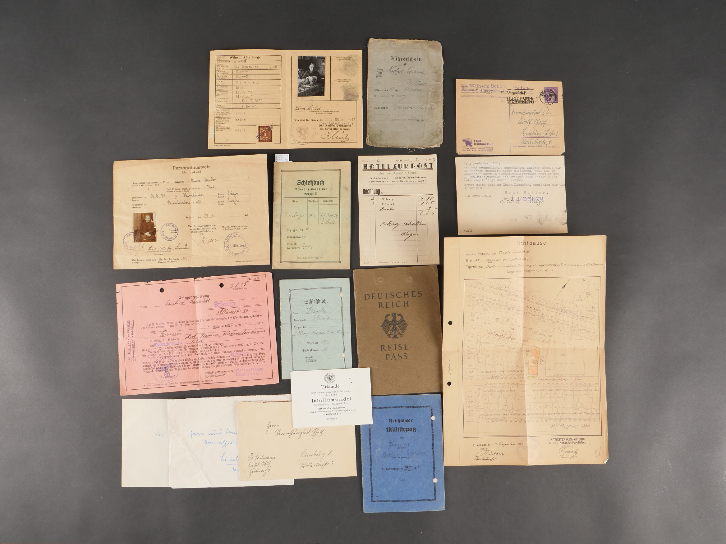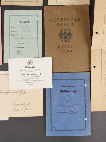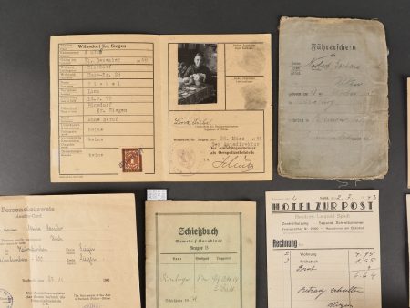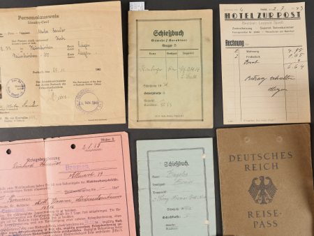 Lot de documents civils et militaires du IIIe Reich. Comprenant Militärpass et Schiessbuch d’un Pionnier de 1934, Schiessbuch d’un artilleur de 1939, ordre de mobilisation, cartes d’identité, permis de conduire, Reise Pass, Enveloppes et lettres avec timbres à l’effigie du chancelier allemand…