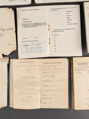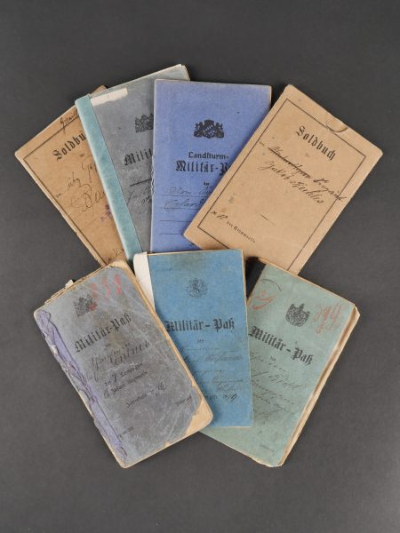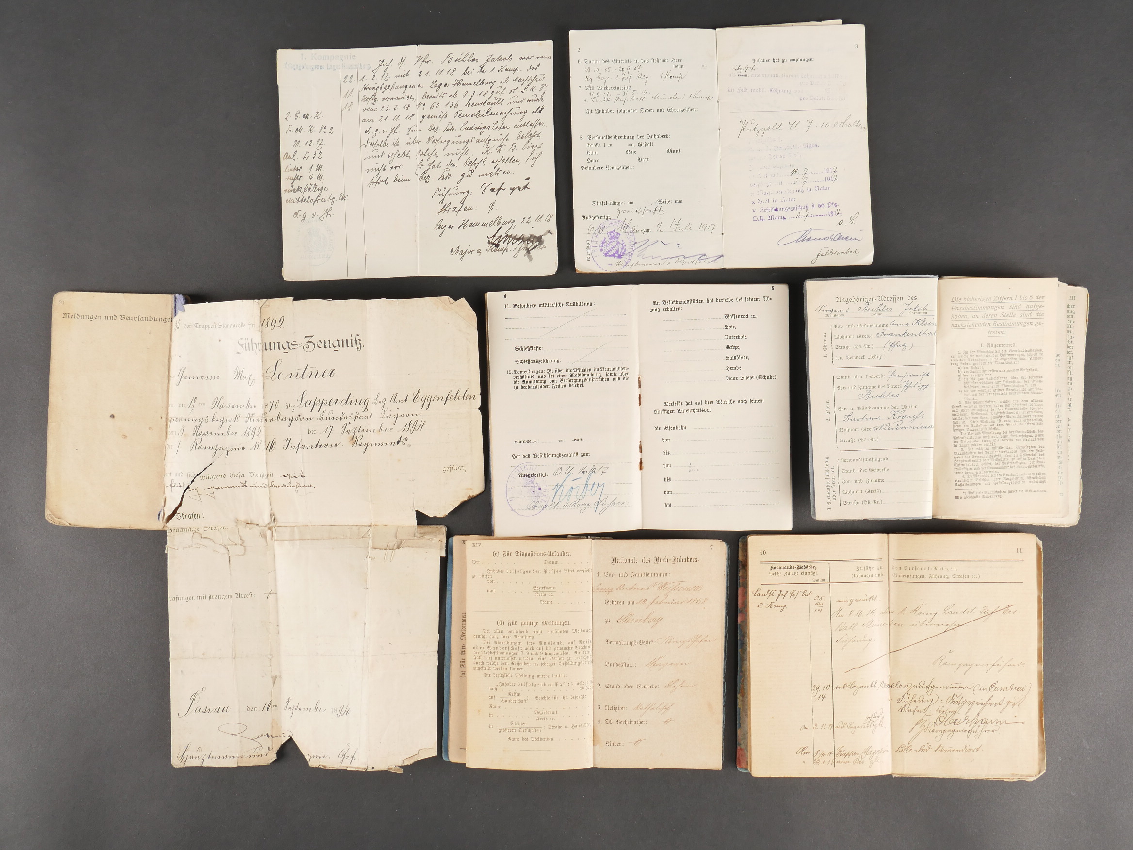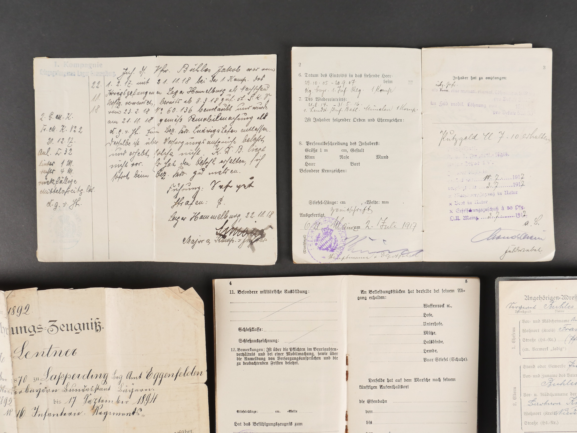 Lot de documents individuels bavarois WW1. Comprenant 4 Militärpass et 2 Soldbuch. Marquages au 1 Infanterie Regiment, Landwehr, Landsturm, Armierung Bataillon et divers