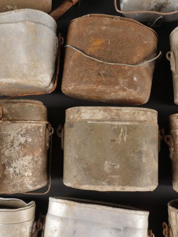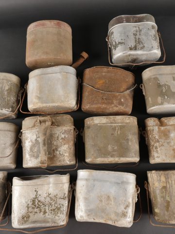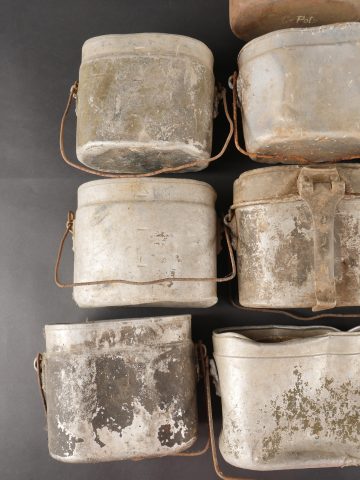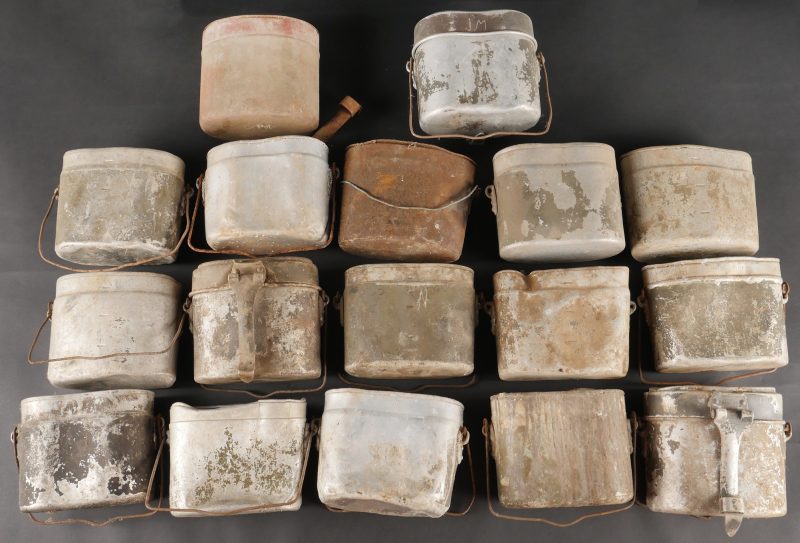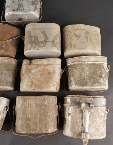 Détails de la vente >Lot de gamelles allemandes. En aluminium et fer, certaines complètes. Divers états de conservation.