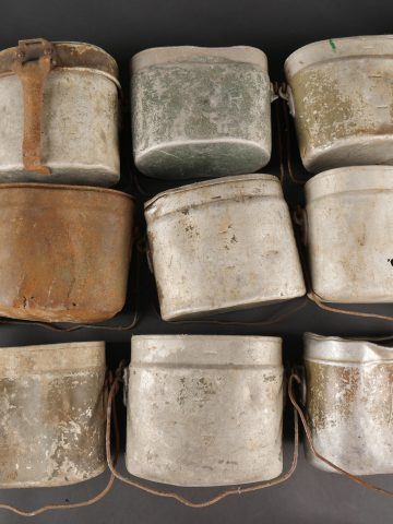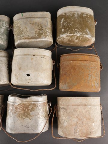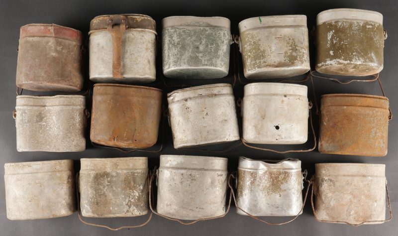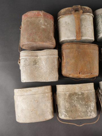 Détails de la vente >Lot de gamelles allemandes. En aluminium et fer, certaines complètes, d’autres avec marquage nominatif. Divers états de conservation.