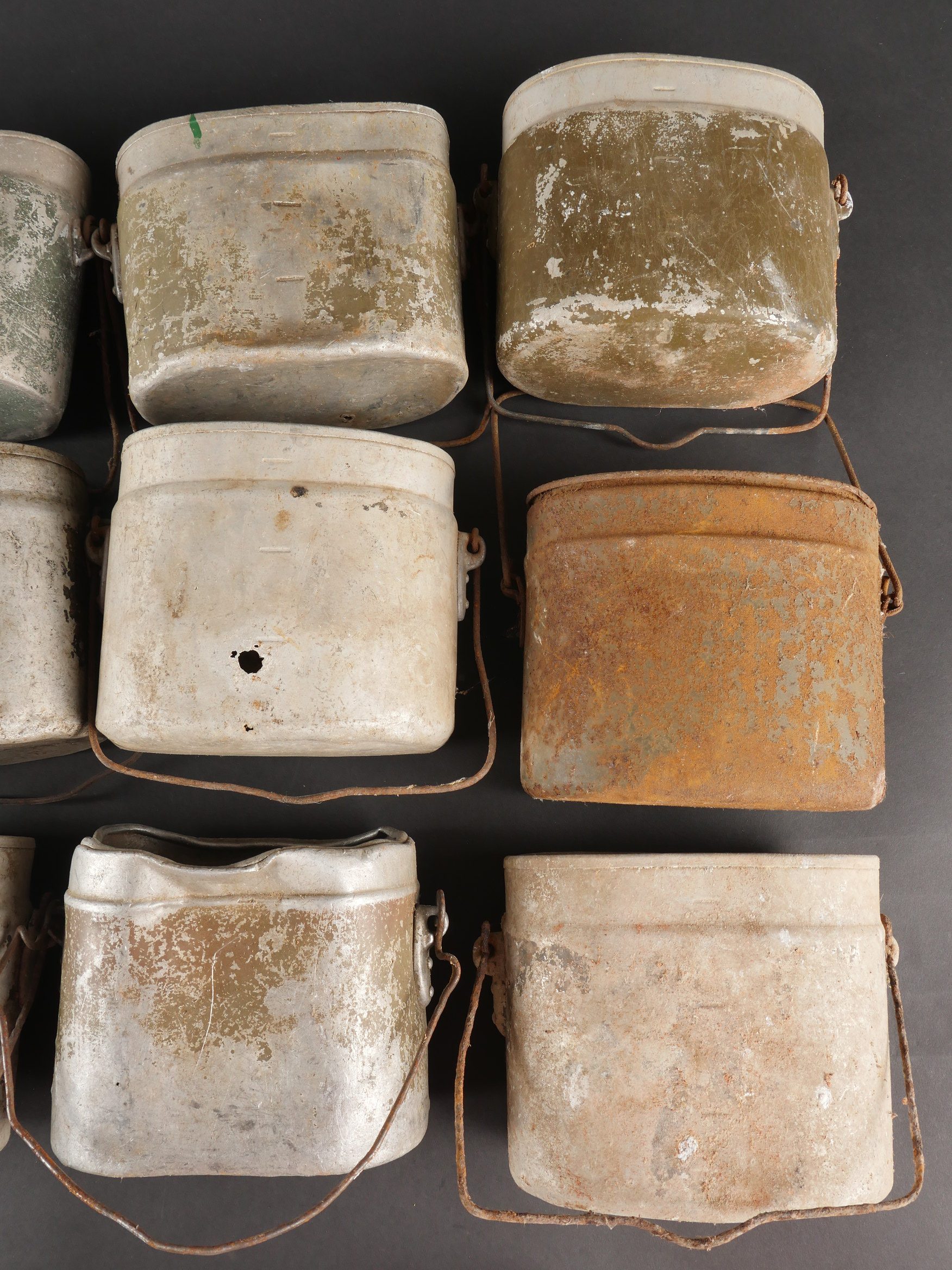 Lot de gamelles allemandes. En aluminium et fer, certaines complètes, d’autres avec marquage nominatif. Divers états de conservation.