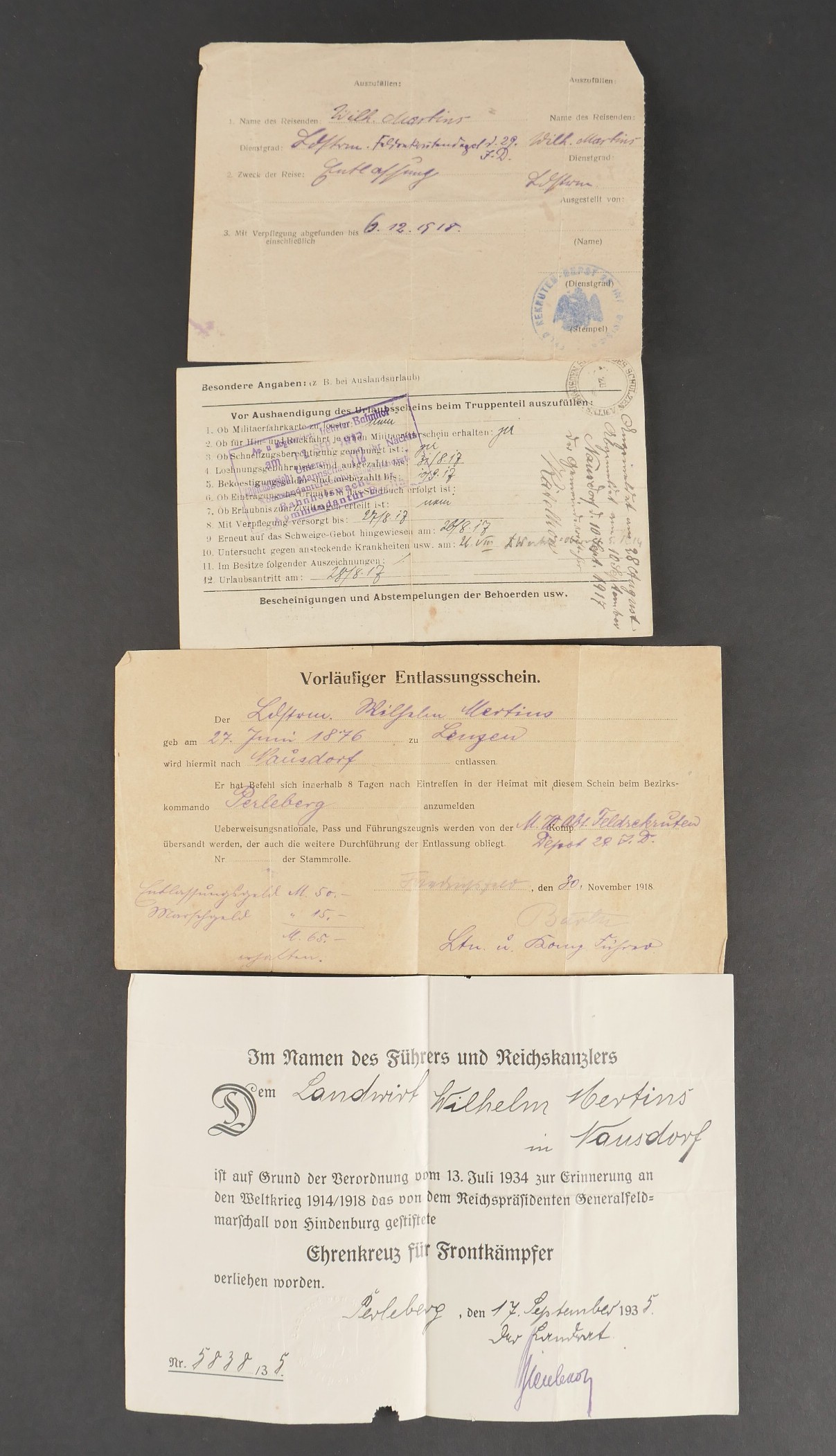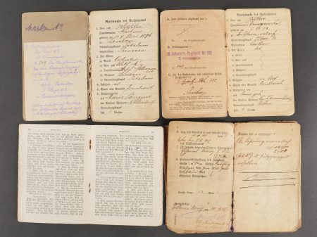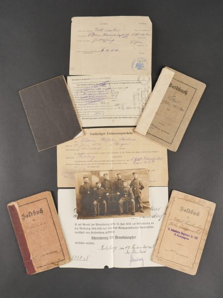 Lot de livrets allemands WW1 Badois, Grenadier et Infanterie. Comprenant un lot d’un soldat badois du RIR110 avec Soldbuch, livre de prières, photo, diplôme EhrenKreuz et divers. Soldbuch d’un Grenadier du GR1. Soldbuch du JR192