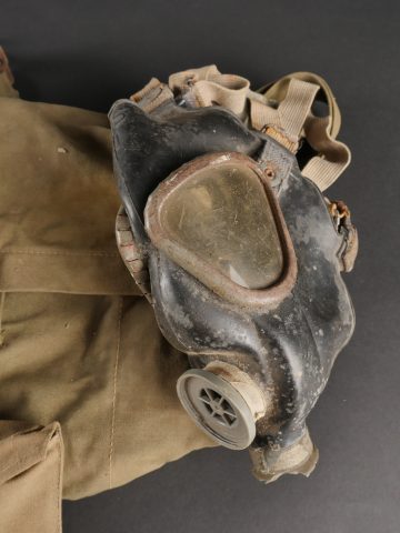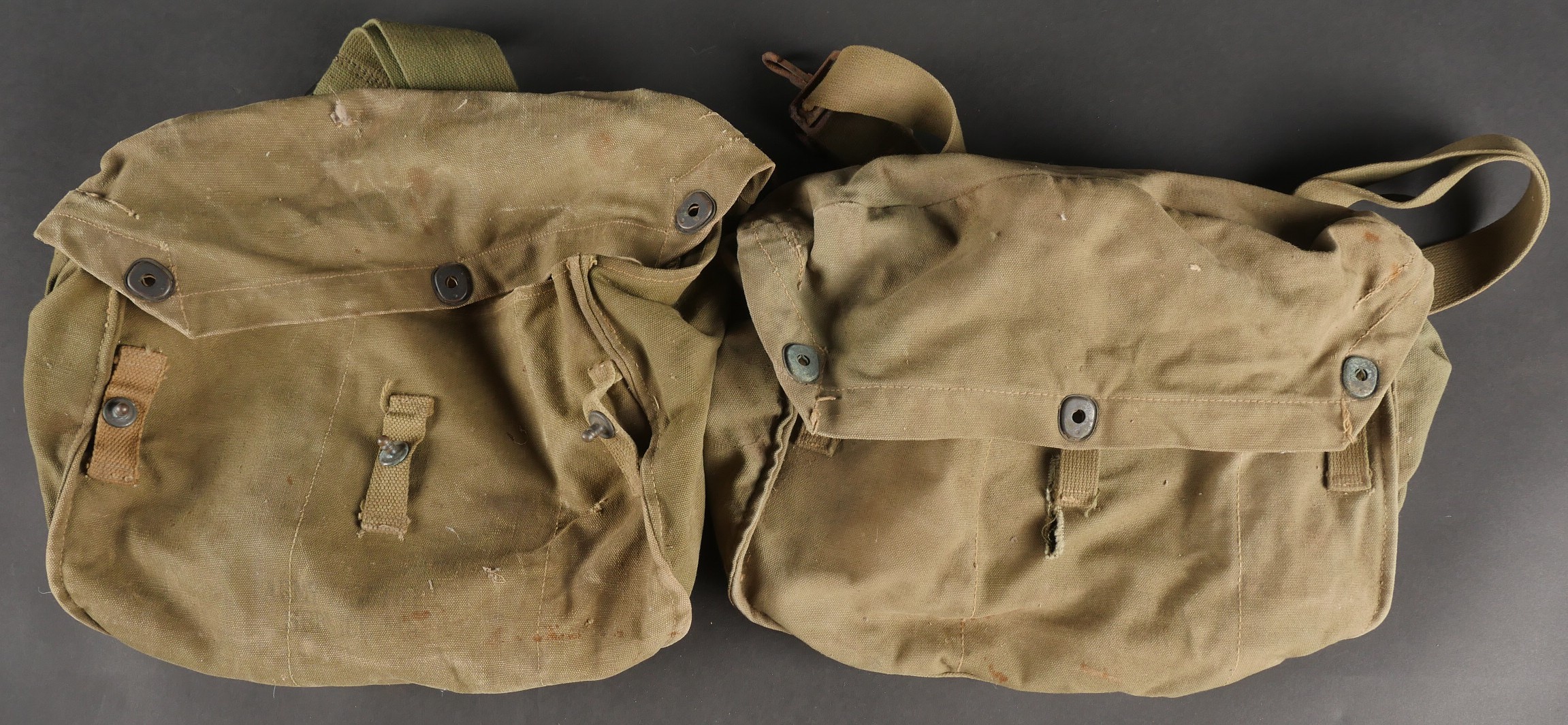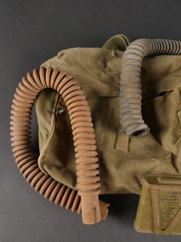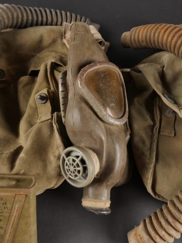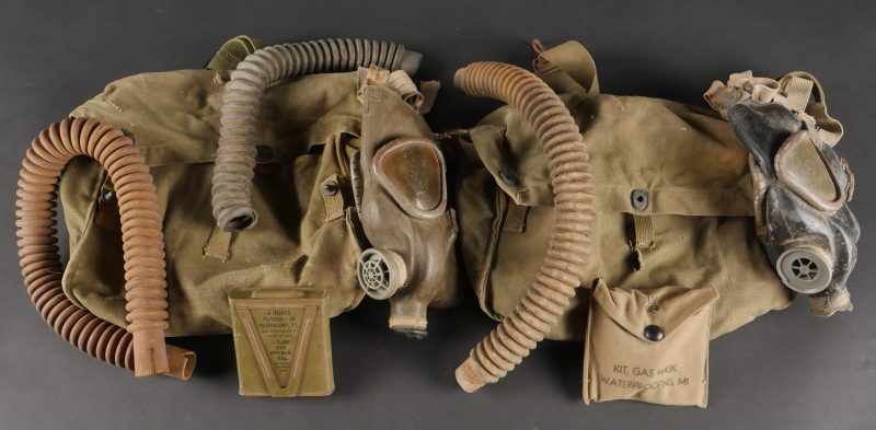 Lot de masques anti-gaz US. Deux masques M3 dans leur sacoche M6, incomplets et en mauvais état, cartouches absentes.