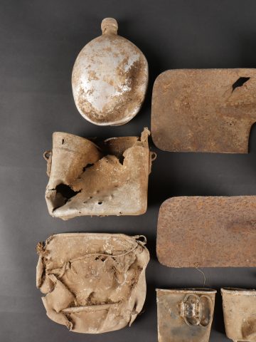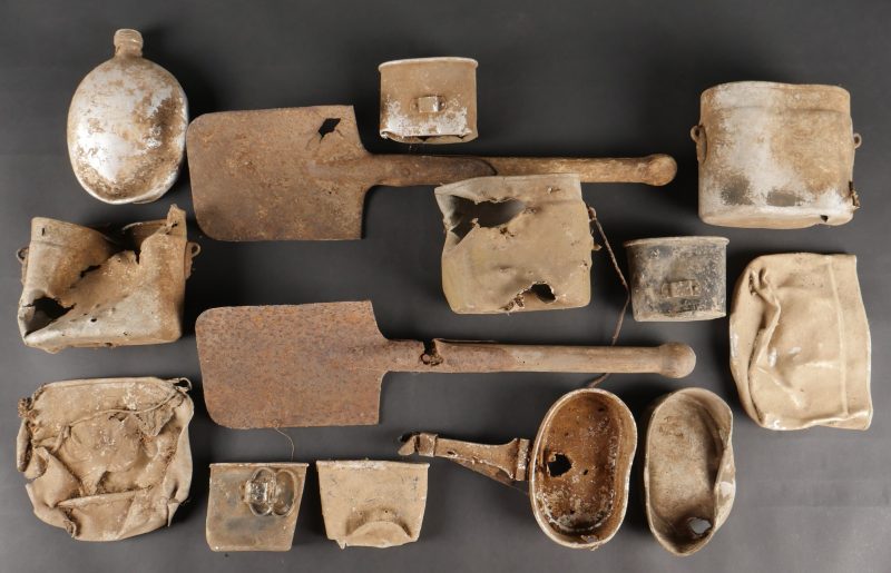 Lot de pièces allemandes à impact. Intéressant ensemble de pièces à impacts, témoins de la violence des combats de la bataille de Bastogne. Pelles, gamelles, quarts, gourdes…Plusieurs inscriptions nominatives. Divers états de conservation.