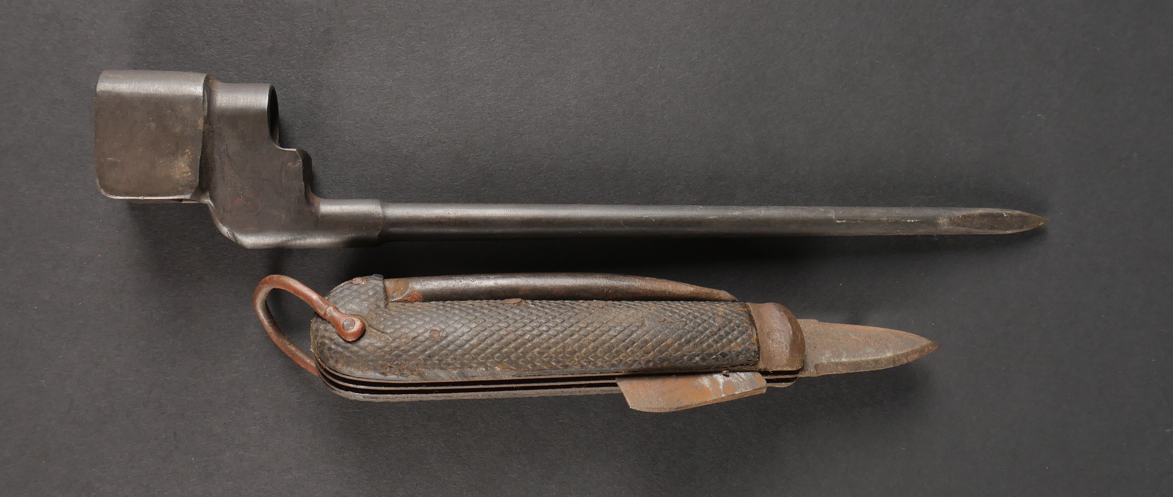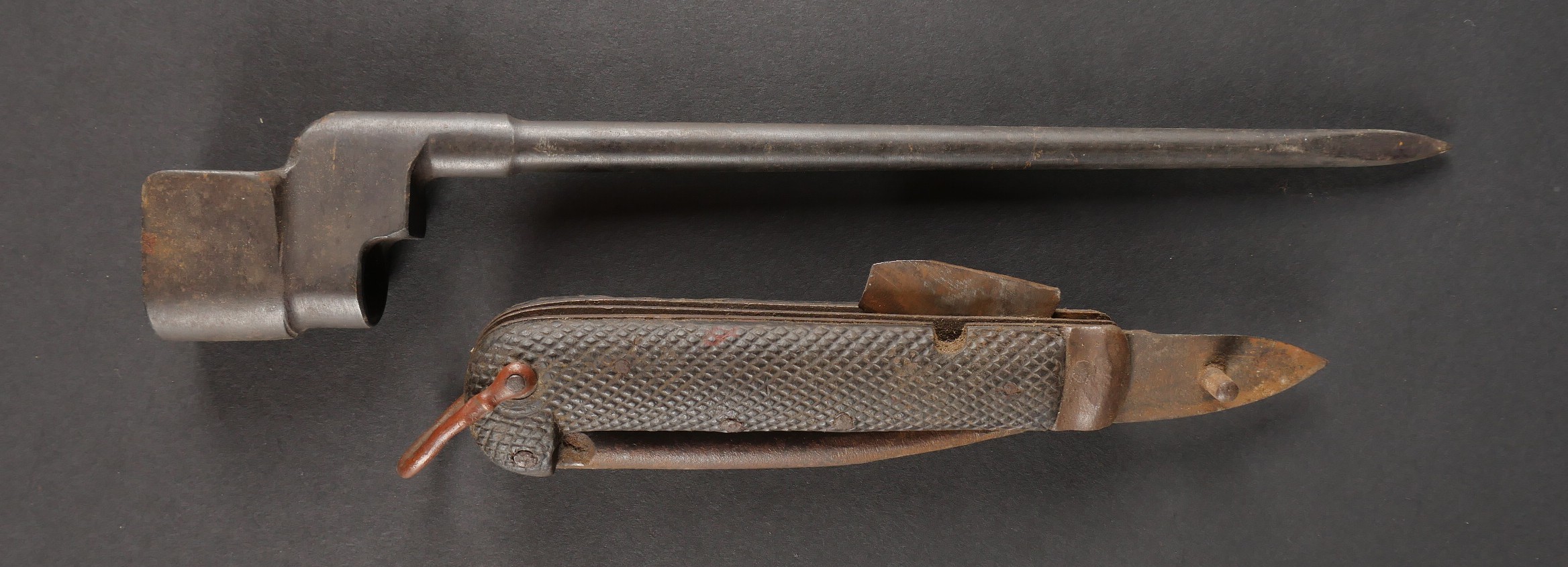 Lot d’équipement anglais WW2. Un porte baïonnette en Web. Une baïonnette clou sans fourreau. Une bretelle Enfield web, un pouch pattern 37, un satchel signal en web et une bretelle artisanale