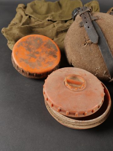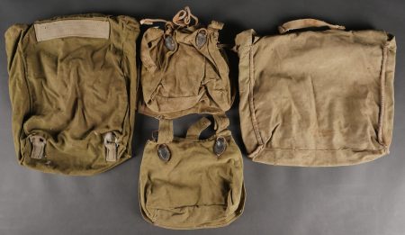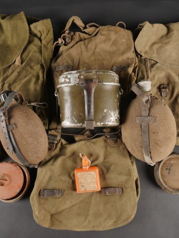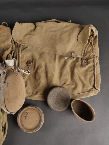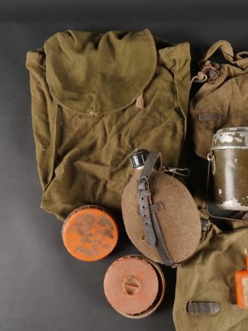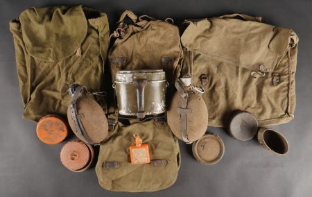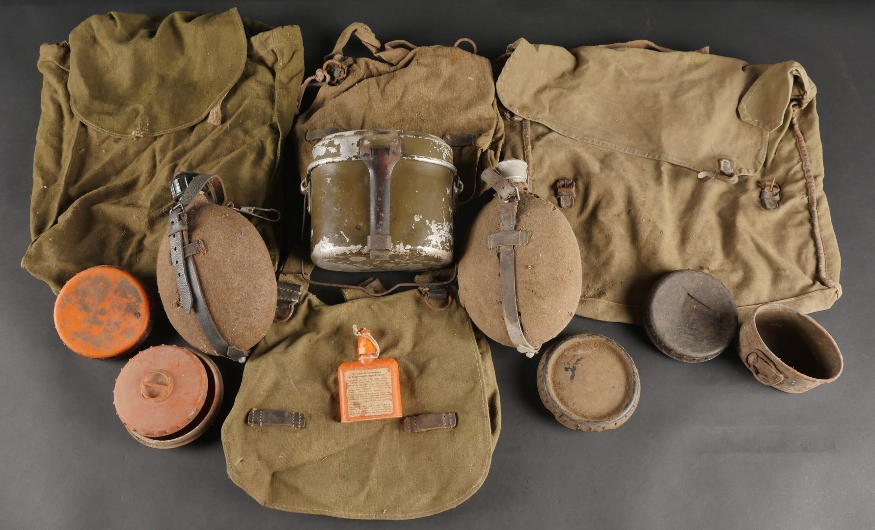 Détails de la vente >Lot d’équipements allemands. Comprenant sacs à pain, gamelles, gourdes, beurriers, sacs. Divers états de conservation.