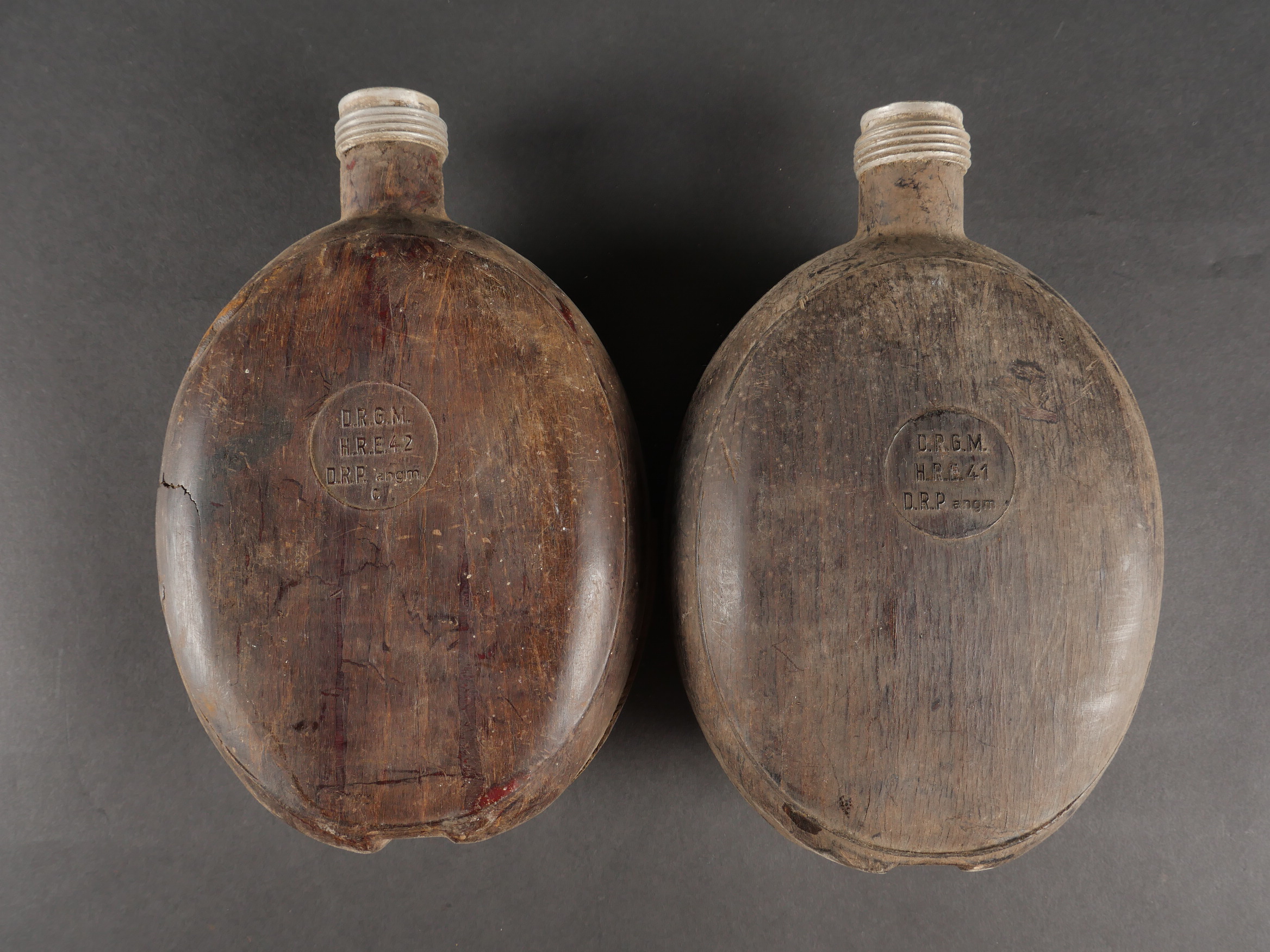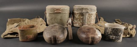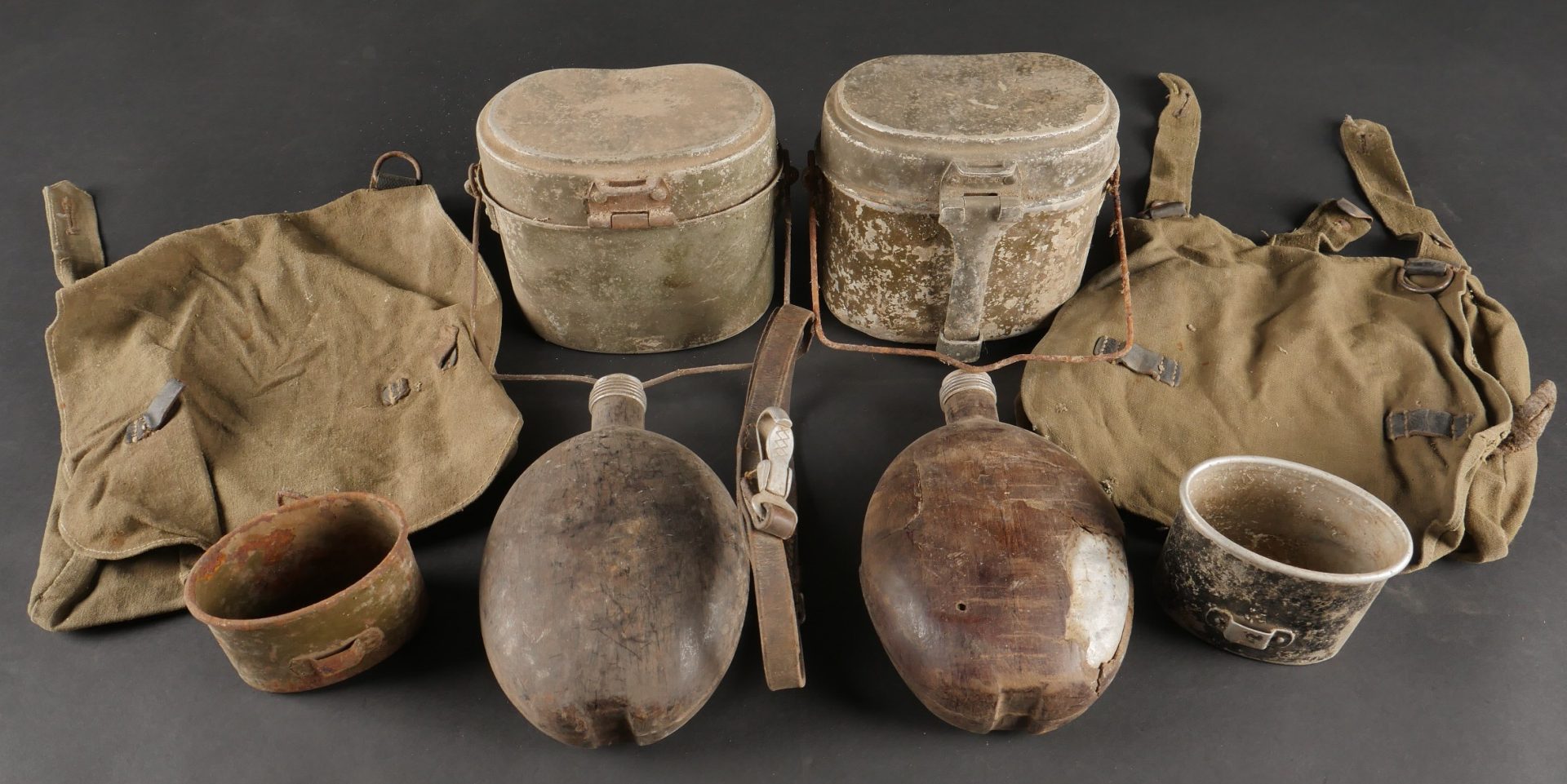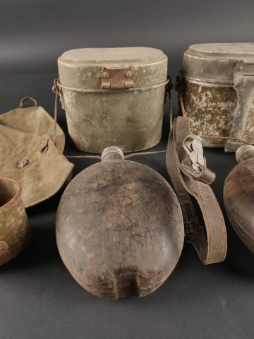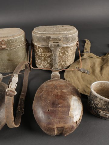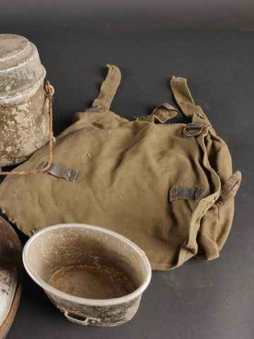 Détails de la vente >Lot d’équipements allemands. Comprenant deux sacs à pain, deux gourdes coco, un brelage de gourde en cuir, deux quarts dont un en aluminium et deux gamelles dont une avec inscription... en savoir plus