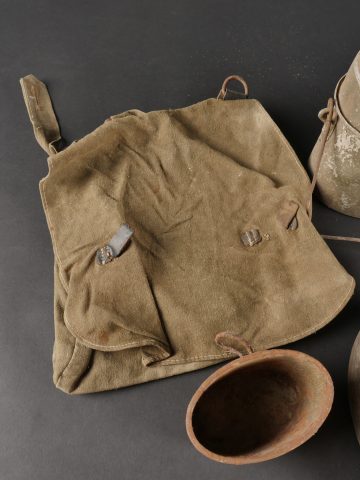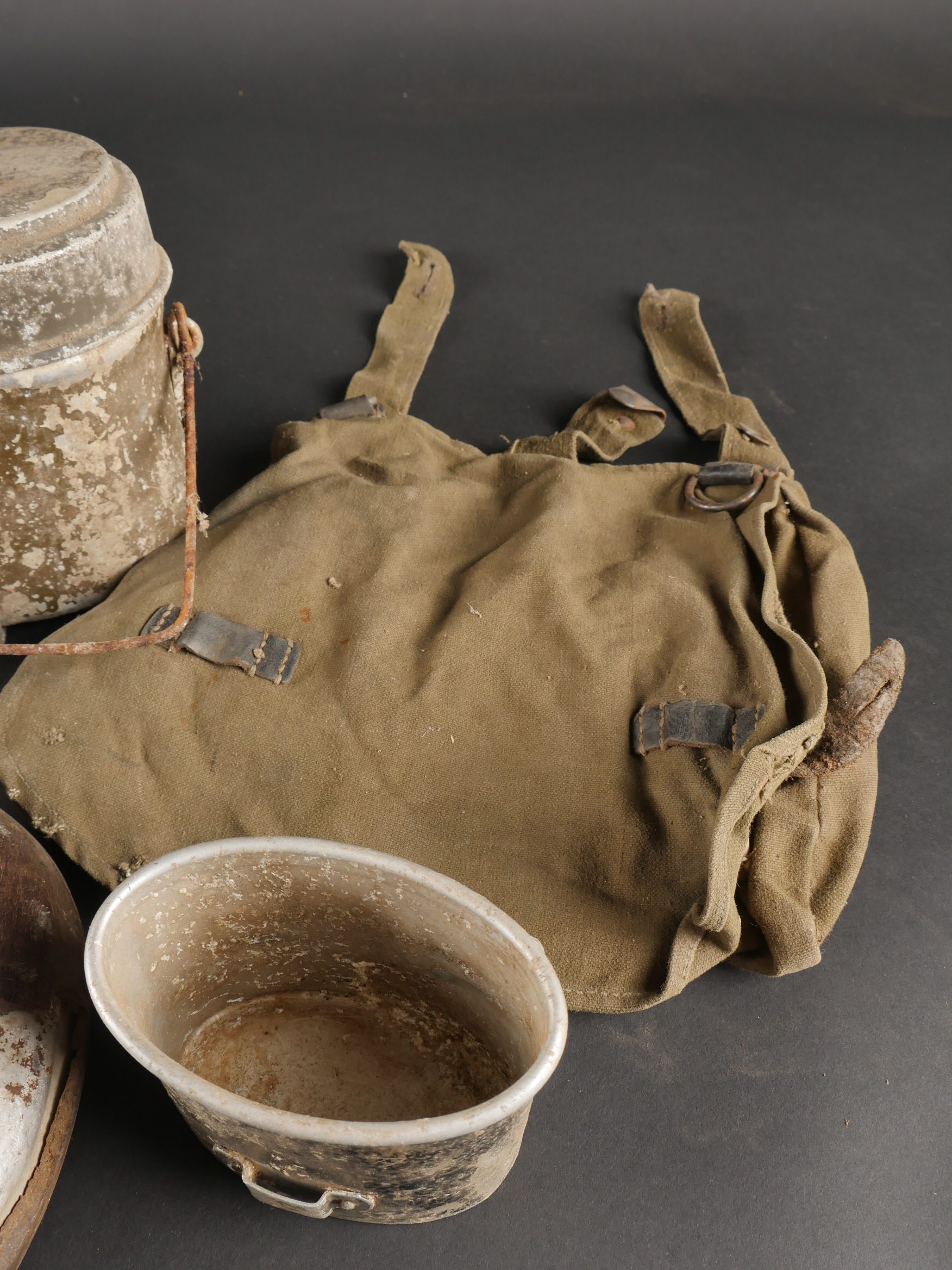 Lot d’équipements allemands. Comprenant deux sacs à pain, deux gourdes coco, un brelage de gourde en cuir, deux quarts dont un en aluminium et deux gamelles dont une avec inscription... en savoir plus