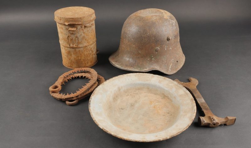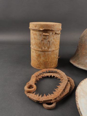 Détails de la vente >Lot d’équipements allemands ww1. Une coque de casque Stahlhelm M16, un boîtier de masque anti-gaz, une assiette émaillée, une scie pliante de cavalerie ou Pionnier, et une clé pour... en savoir plus