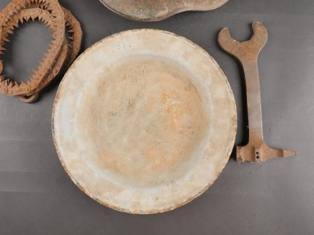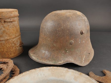 Lot d’équipements allemands ww1. Une coque de casque Stahlhelm M16, un boîtier de masque anti-gaz, une assiette émaillée, une scie pliante de cavalerie ou Pionnier, et une clé pour... en savoir plus