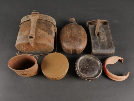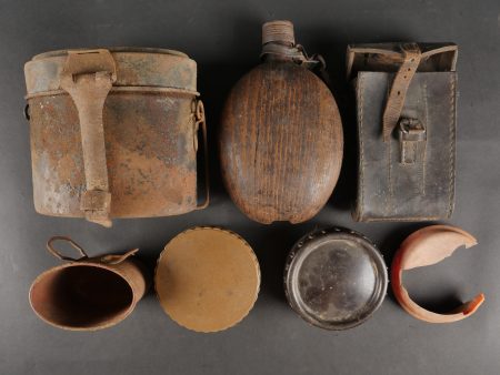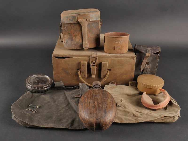 Détails de la vente >Lot d’équipements allemands. Comprenant une caisse en bois, sacs à pain, gourde, gamelle, étui et beurrier. Divers états de conservation.
