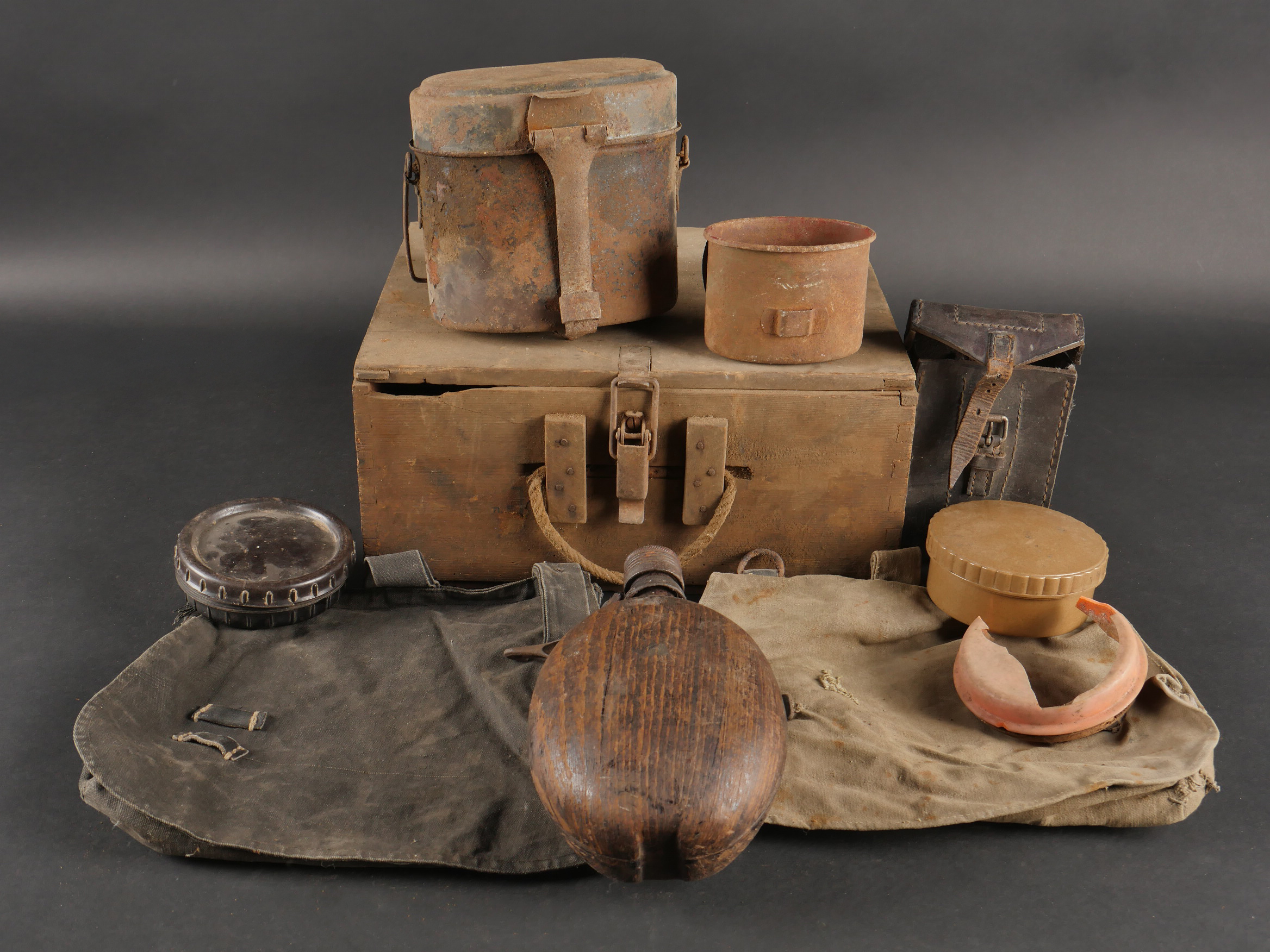 Lot d’équipements allemands. Comprenant une caisse en bois, sacs à pain, gourde, gamelle, étui et beurrier. Divers états de conservation.