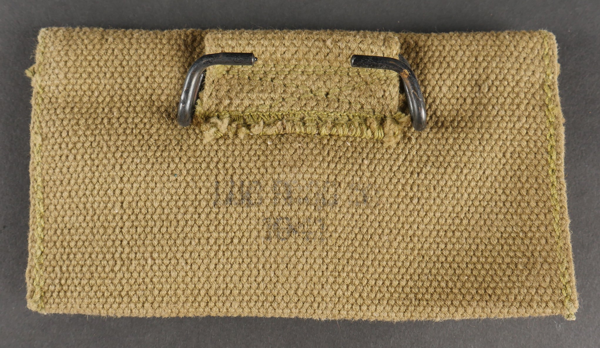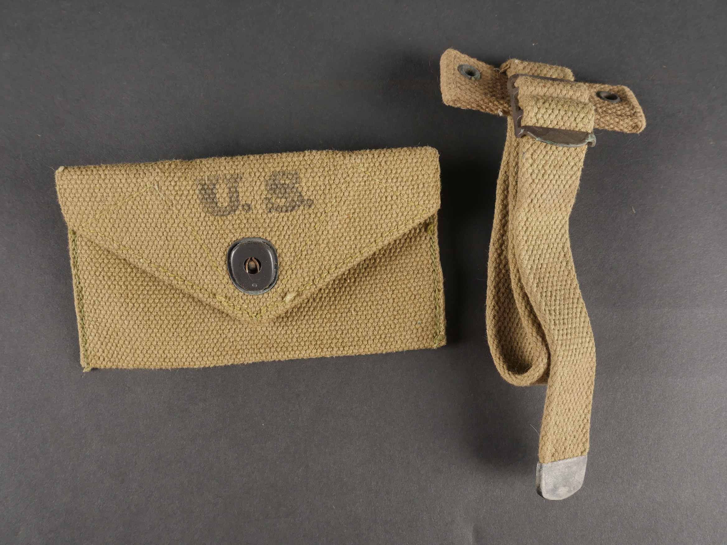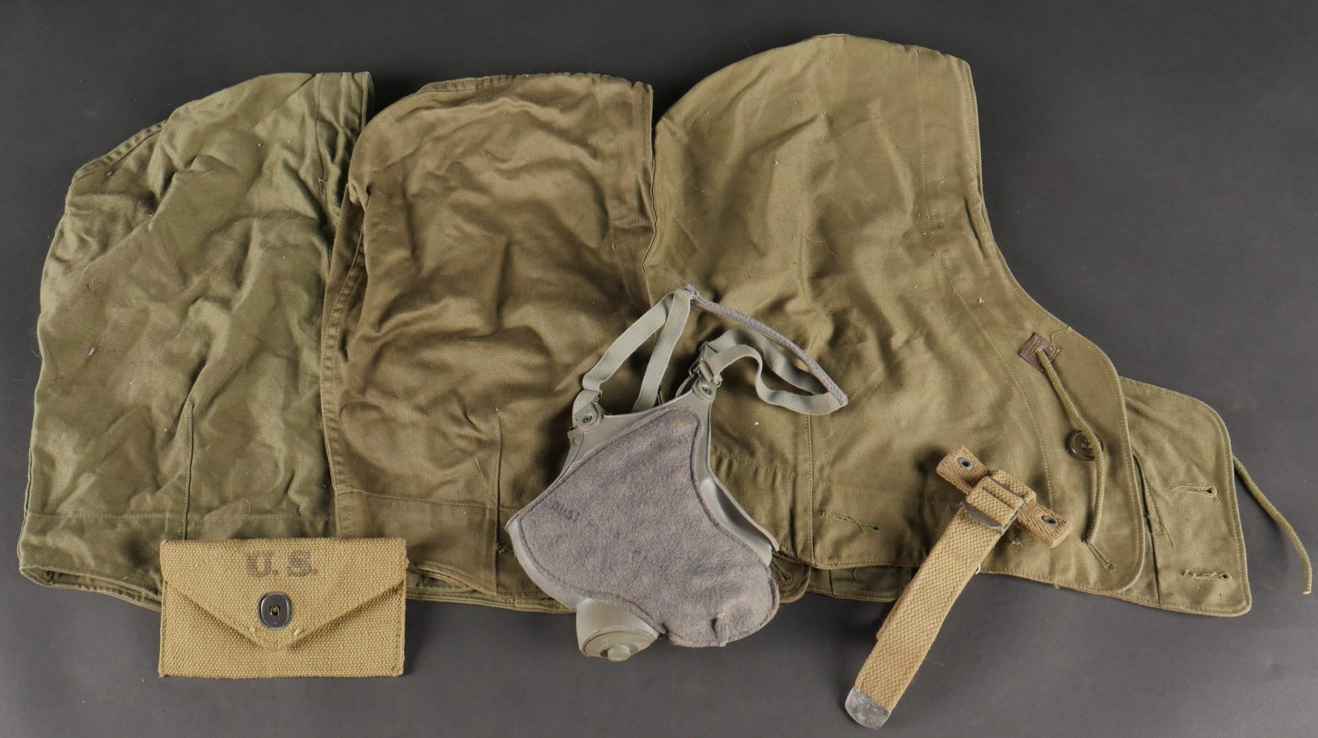 Lot d’équipements US. Comprenant un masque respirateur anti poussière, une pochette à pansement first aid, une rallonge de gourde et trois capuches de veste M43. Pièces en bon état. Divers états de conservation.