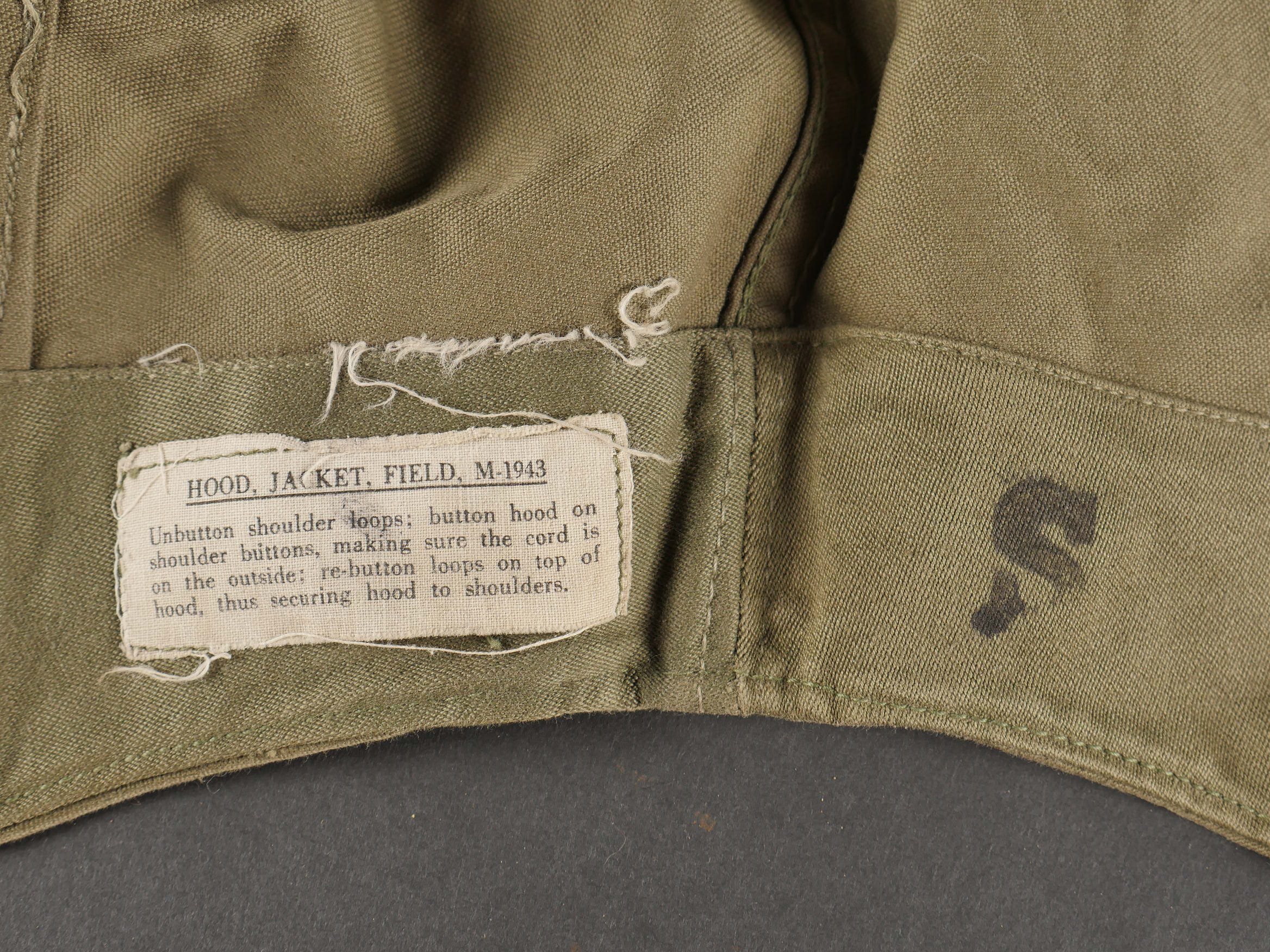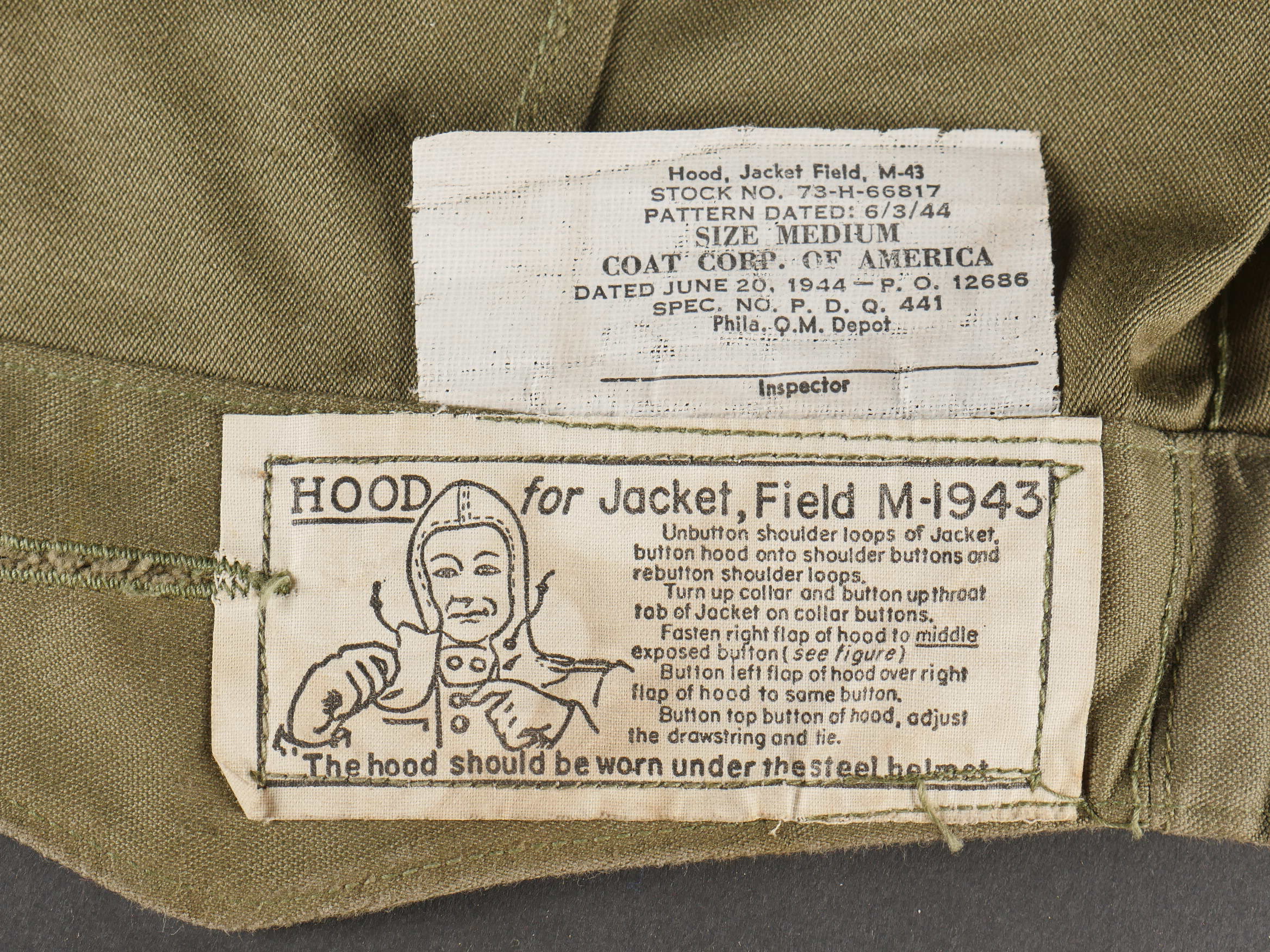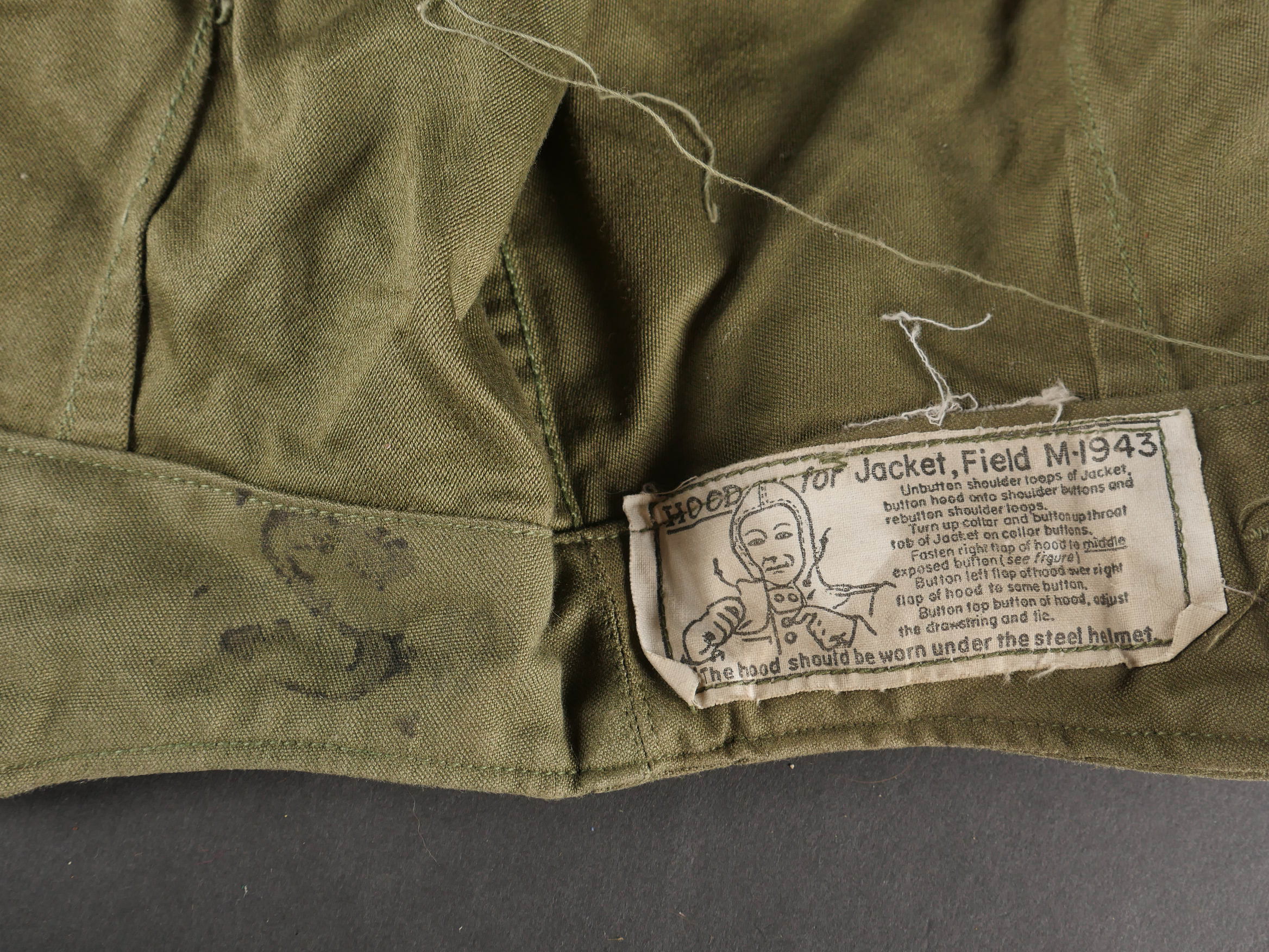 Lot d’équipements US. Comprenant un masque respirateur anti poussière, une pochette à pansement first aid, une rallonge de gourde et trois capuches de veste M43. Pièces en bon état. Divers états de conservation.