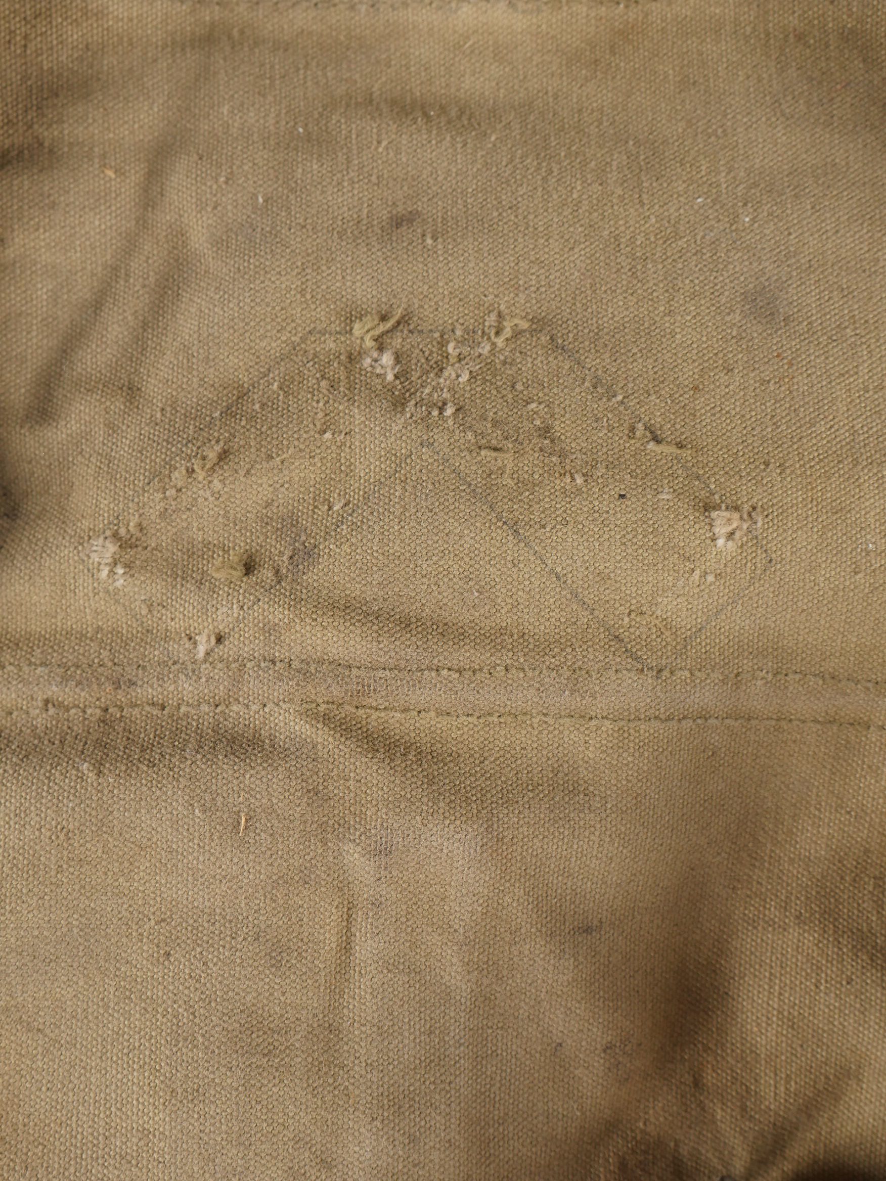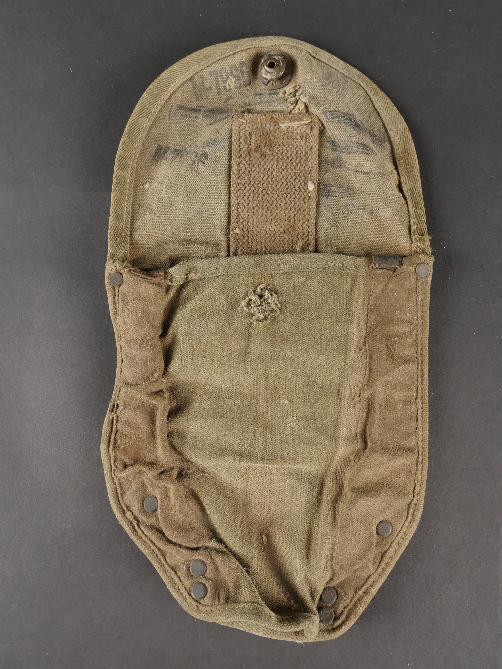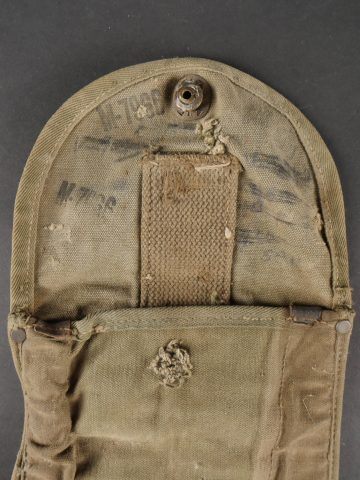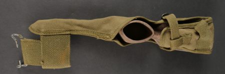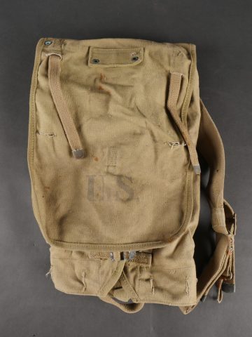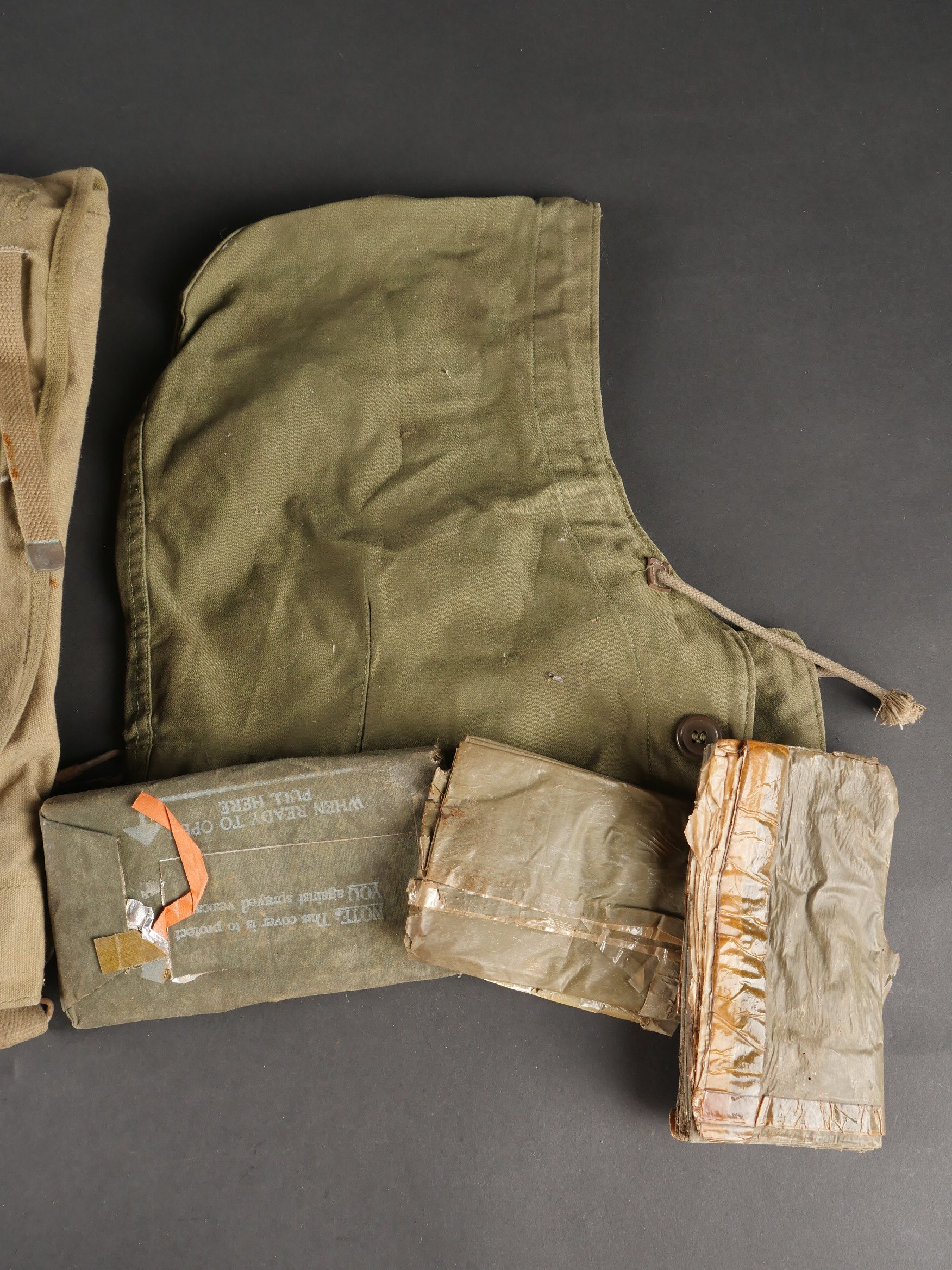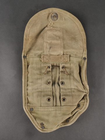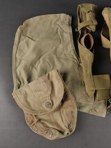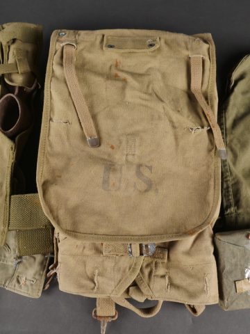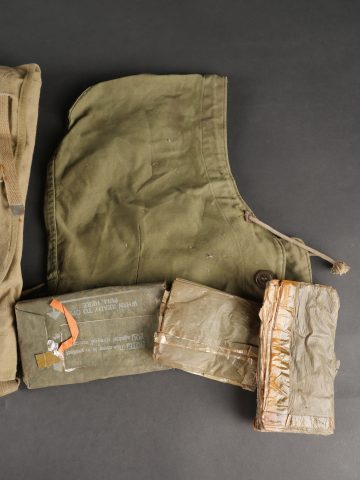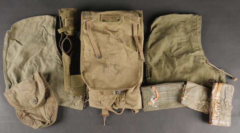 Lot d’équipements US. Comprenant une pioche réglementaire dans son étui OD7, manche absent. Un havresac M1928 en bon état général, sangles dorsales absentes. Deux capuches de vestes M43. Une housse de pelle pliante et des capes de protection. Divers états de conservation.