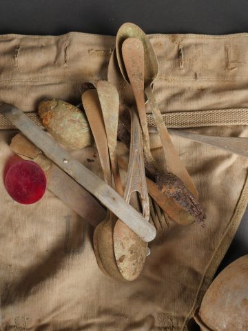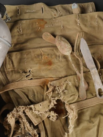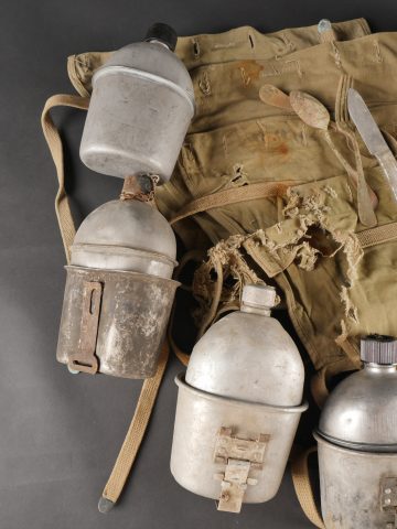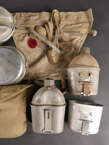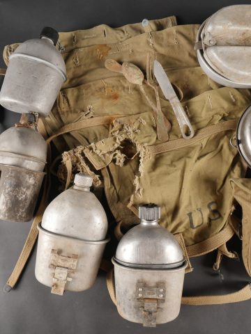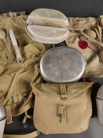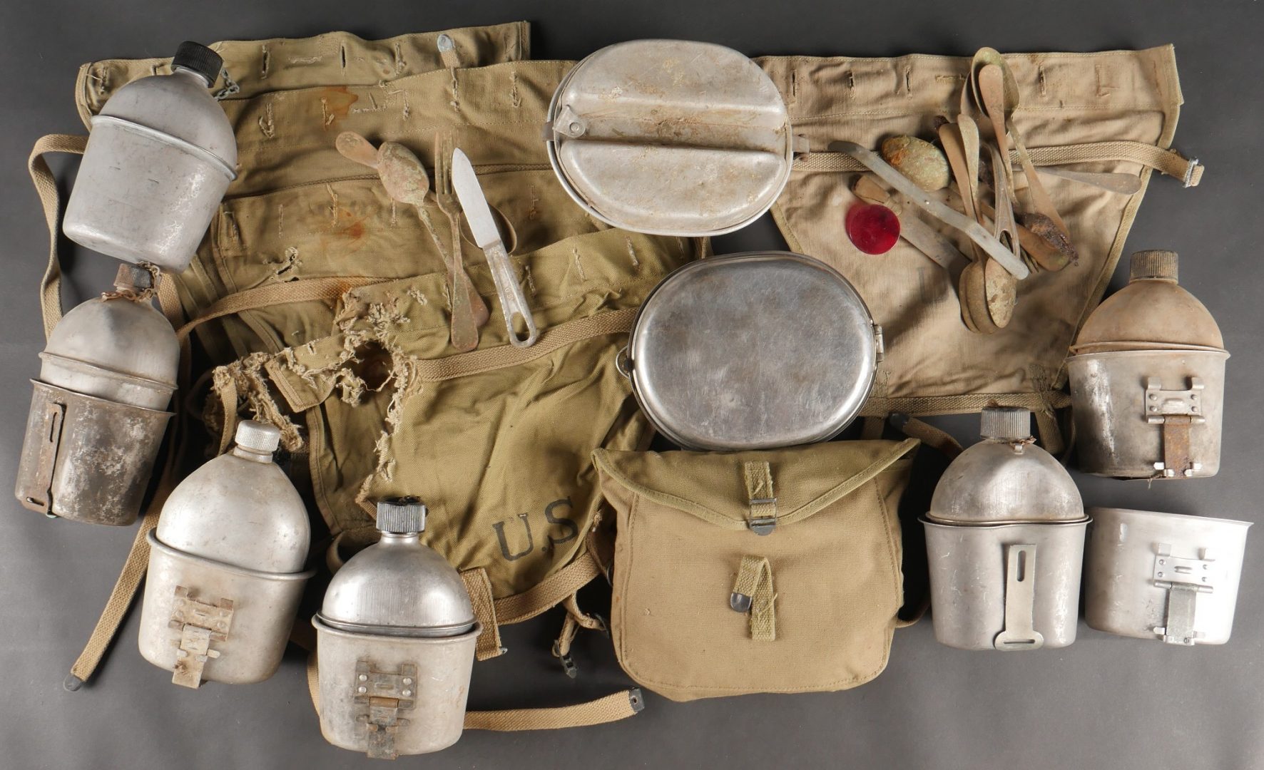 Détails de la vente >Lot d’équipements US. Comprenant des gourdes et quarts US, gamelles et triangles de havresac. Divers états de conservation.