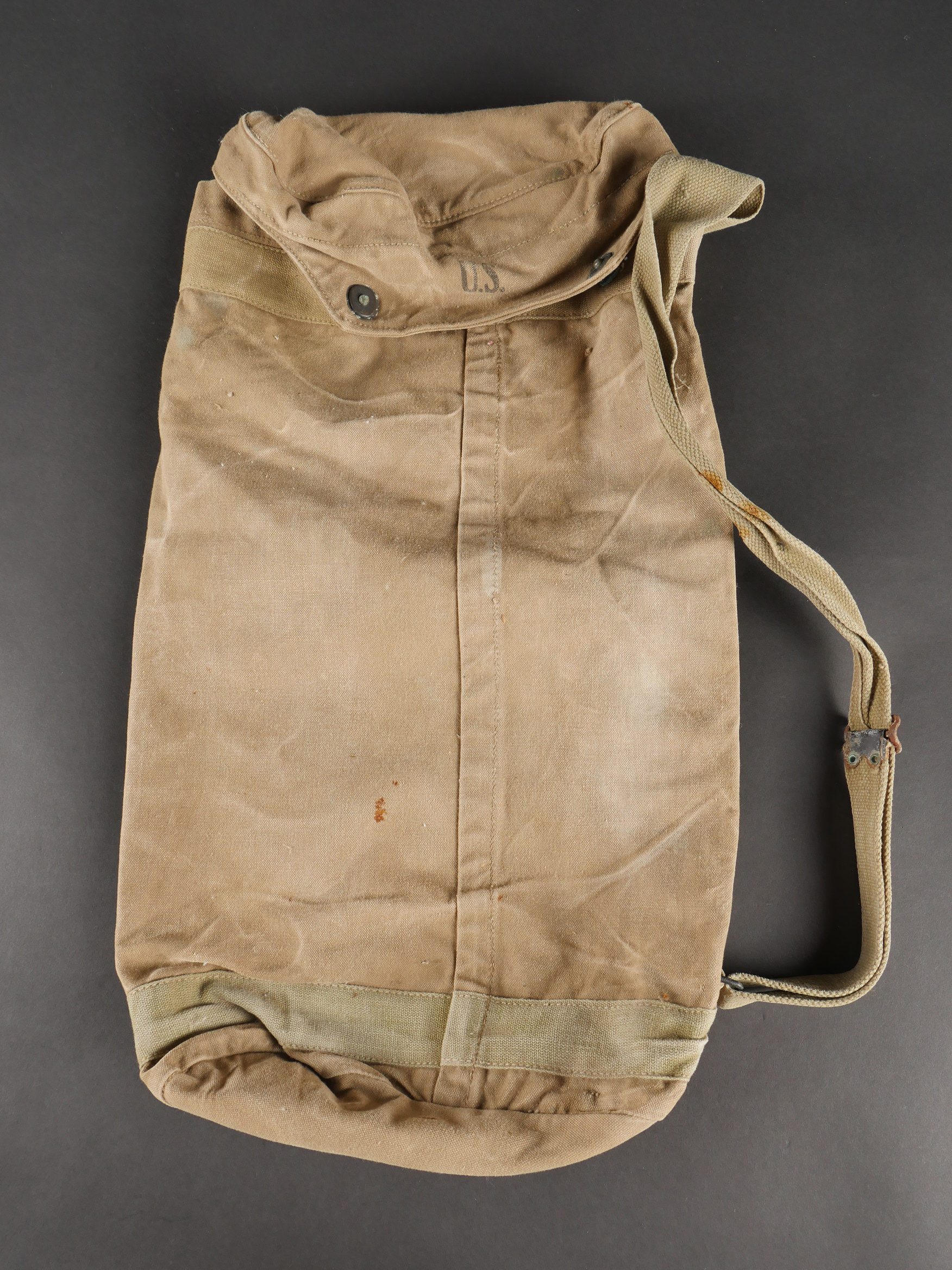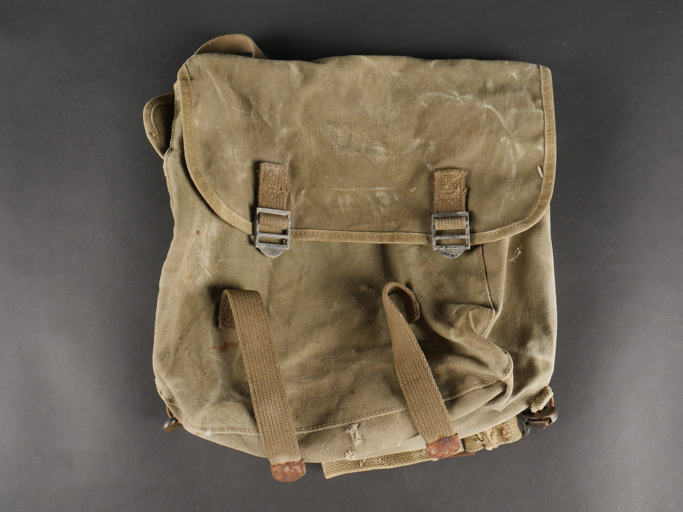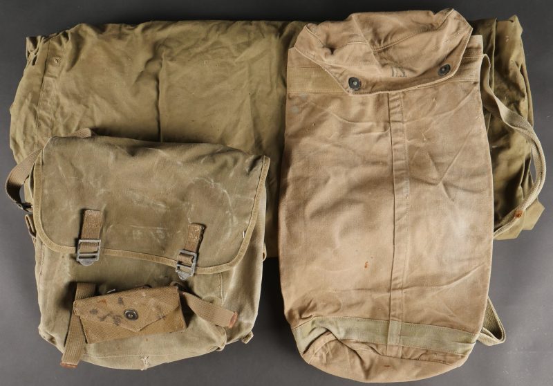 Lot d’équipements US provenance Flamierges. Musette US, toile de tente, sacoche de transport de roquettes et pochette à pansement