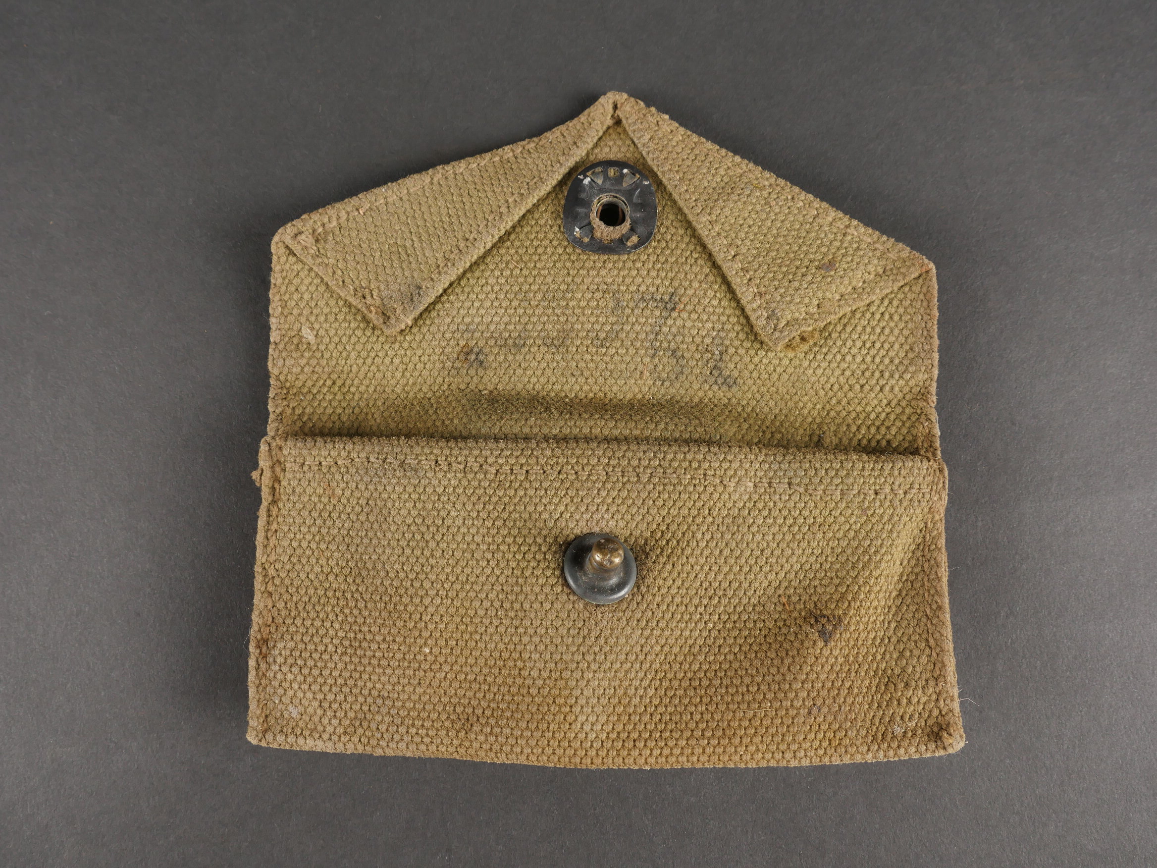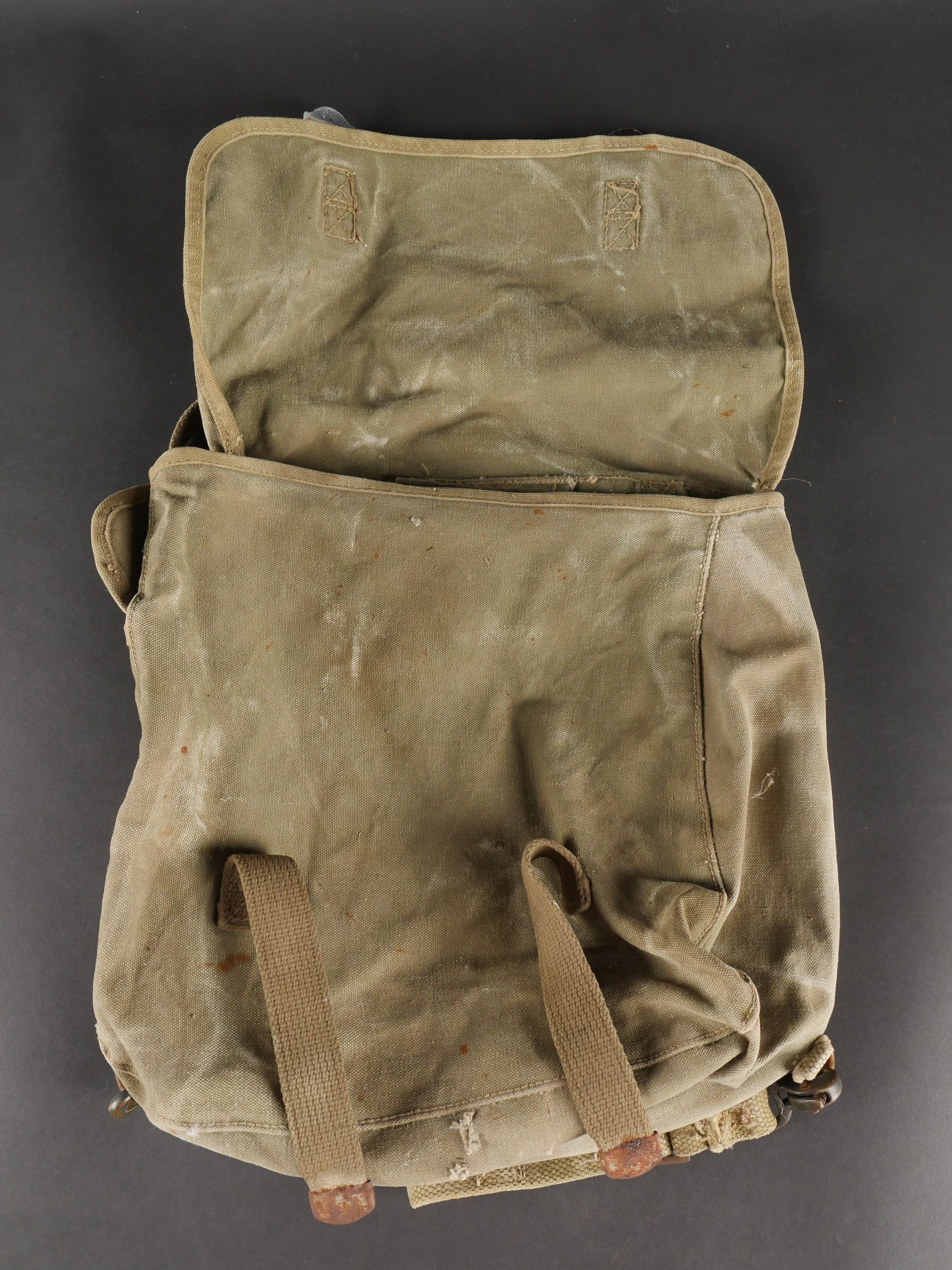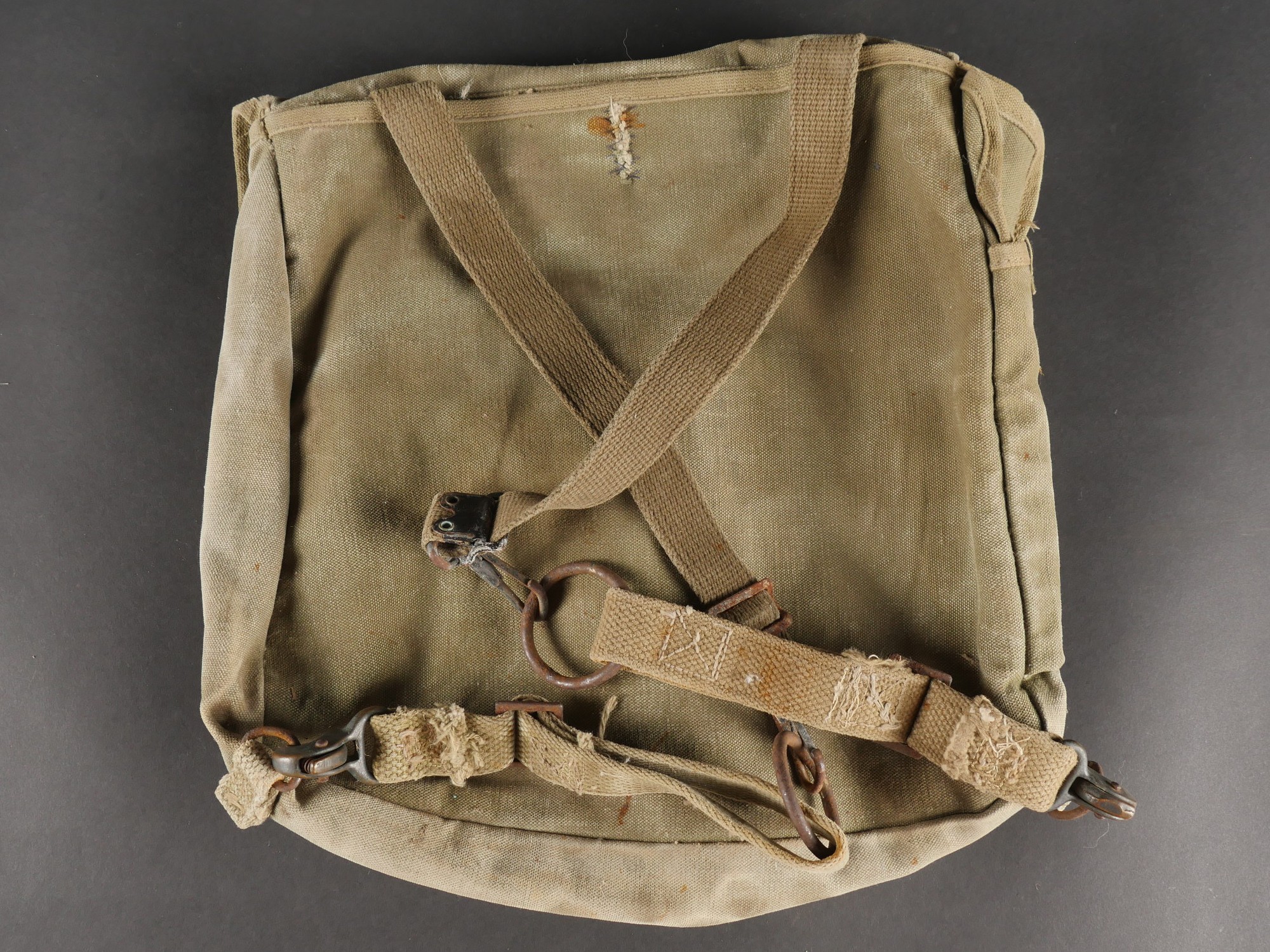 Détails de la vente >Lot d’équipements US provenance Flamierges. Musette US, toile de tente, sacoche de transport de roquettes et pochette à pansement