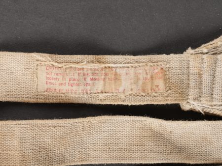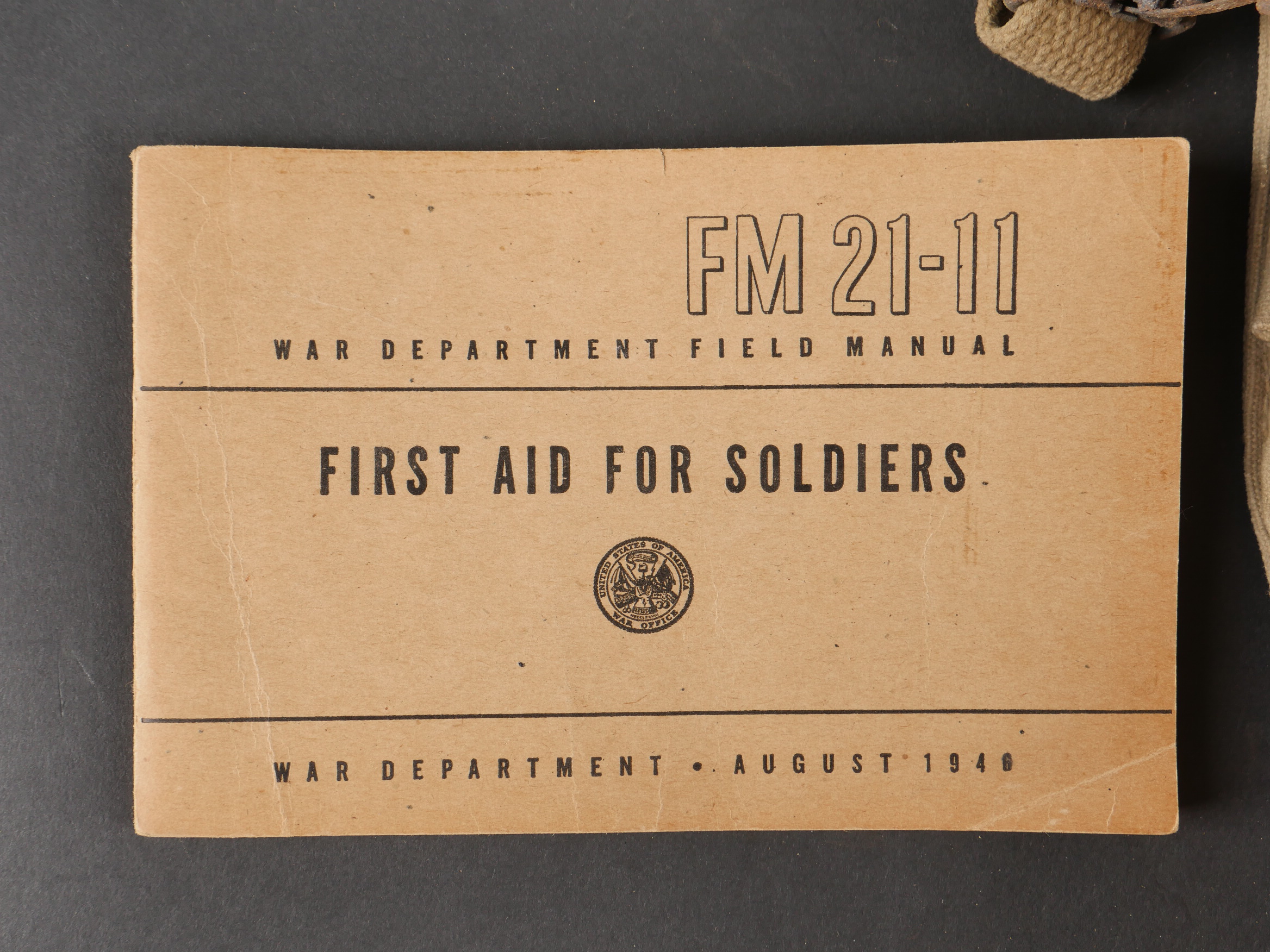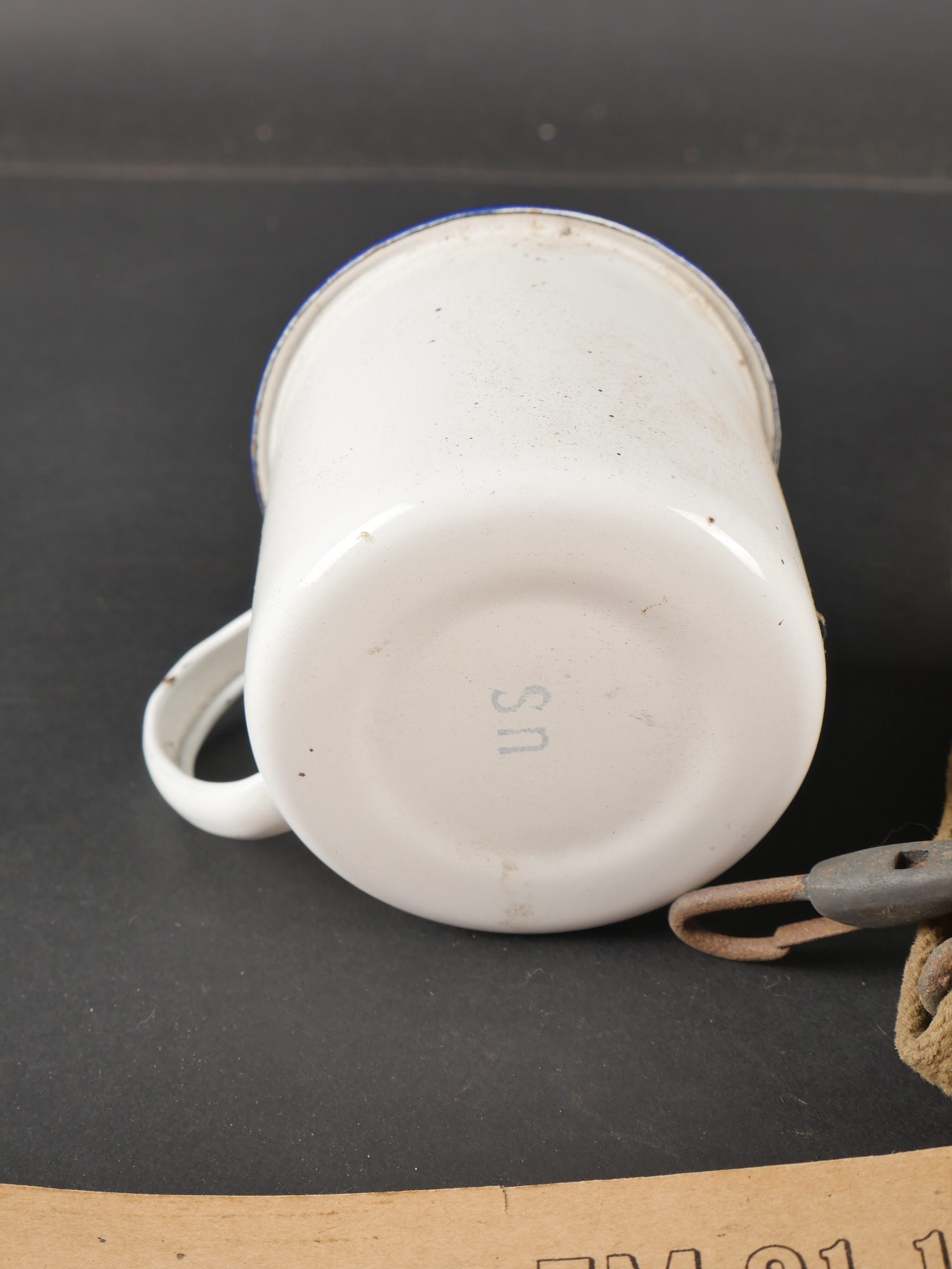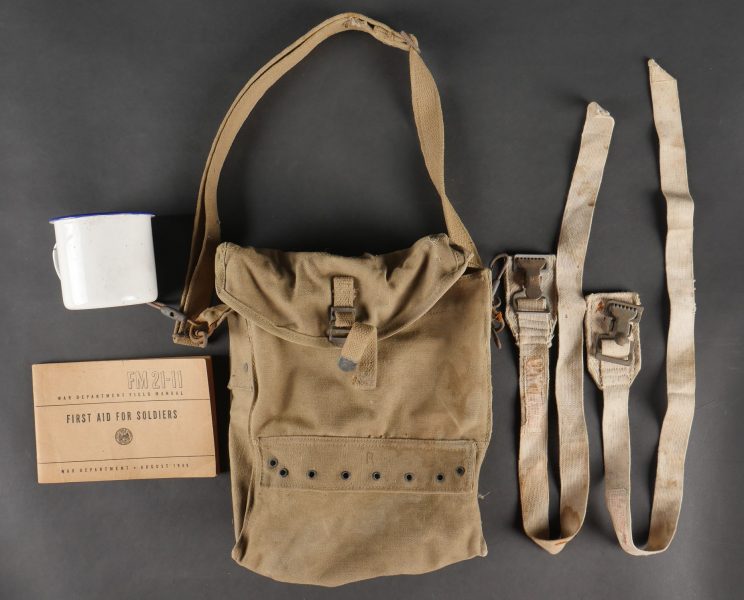 Lot infirmier US. Comprenant une belle sacoche d’infirmier avec son compartiment et sa sangle, nominative sous le rabat Riley. Deux garrots blancs, un livret first aid for soldiers et un mug émaillé. Divers états de conservation.