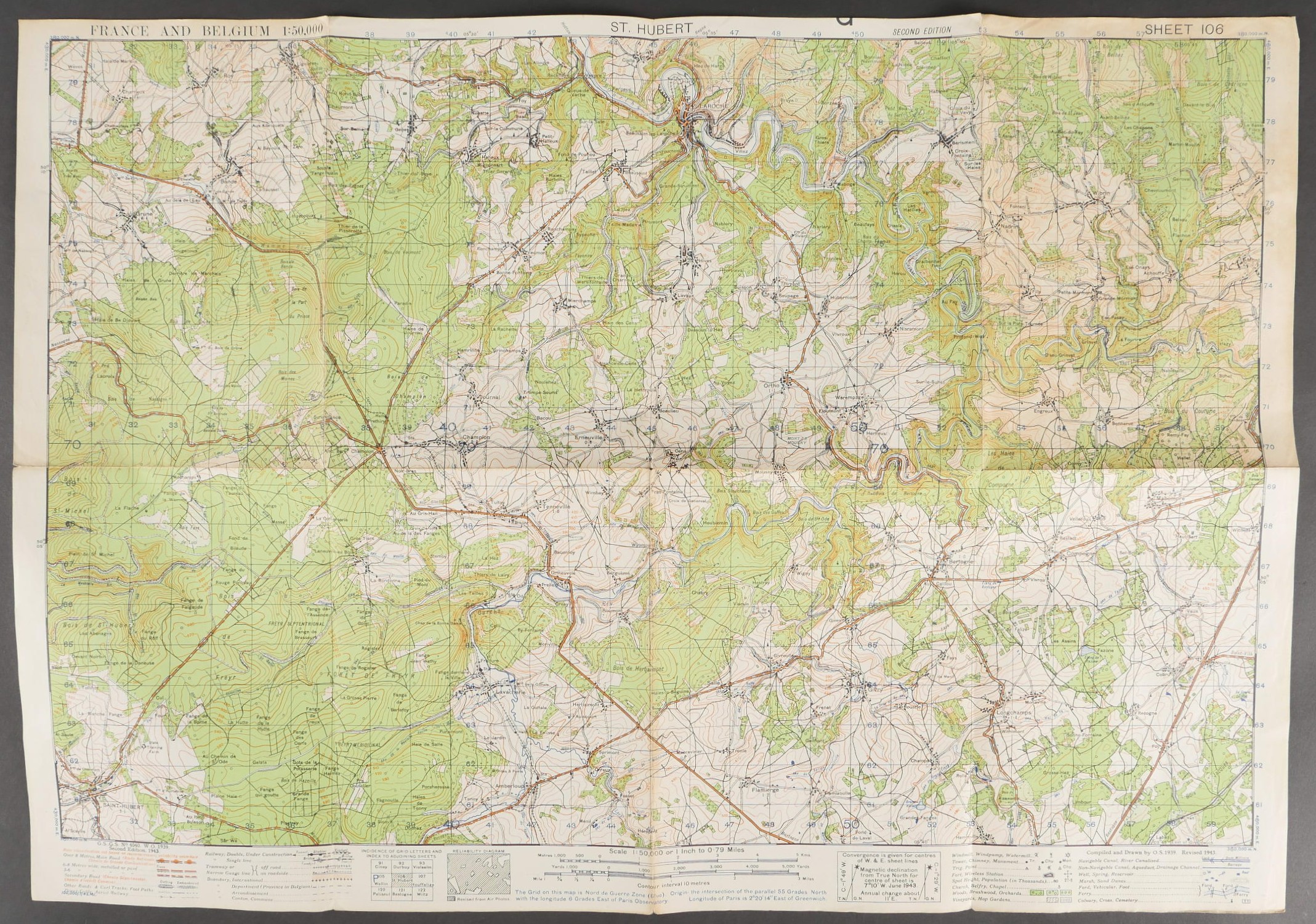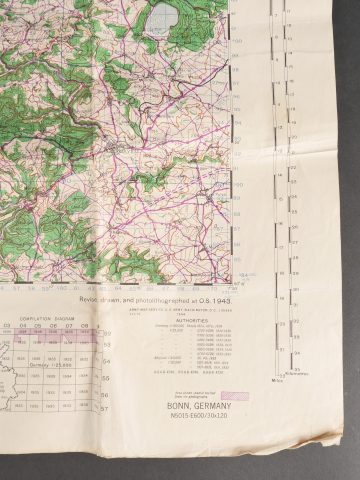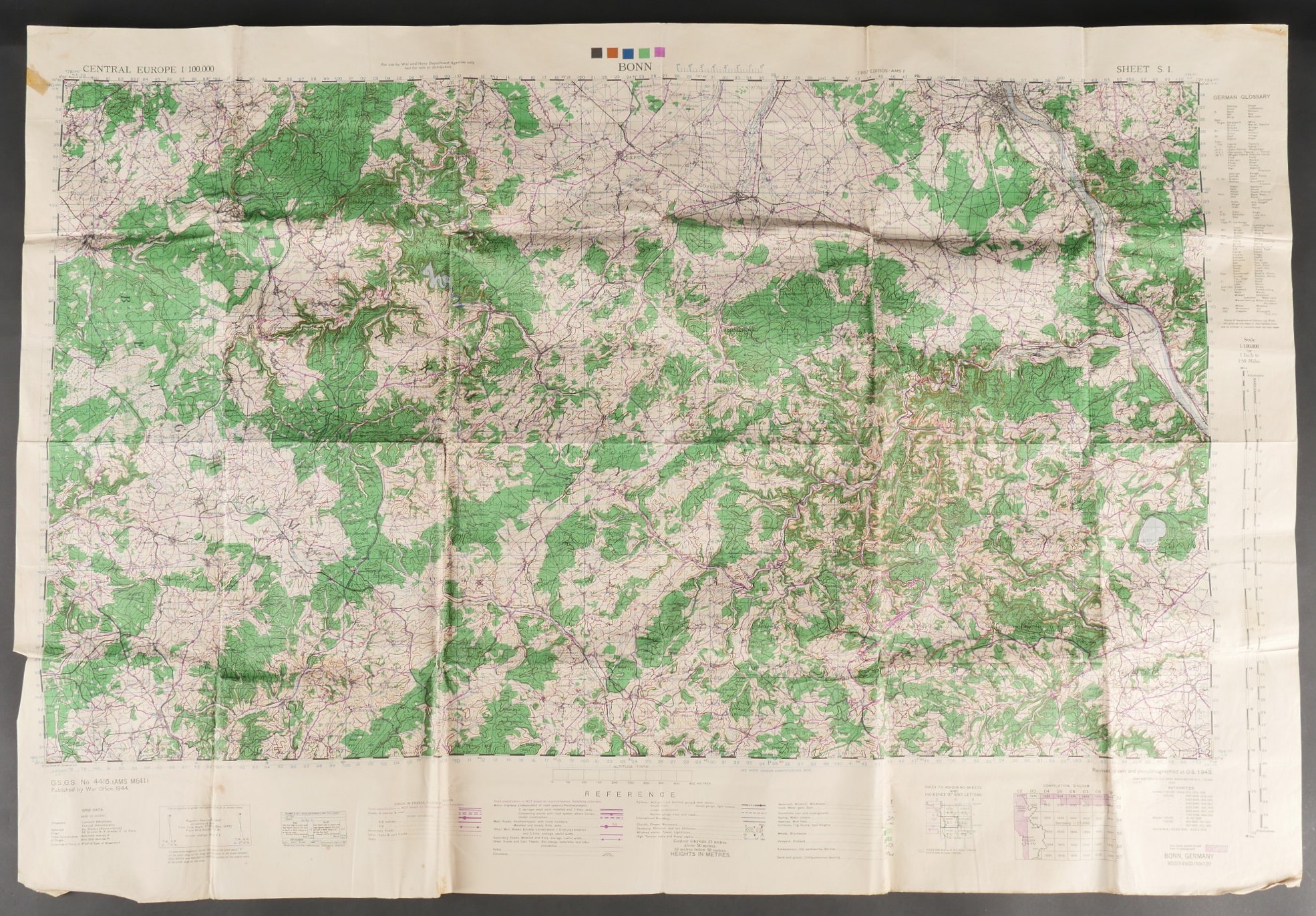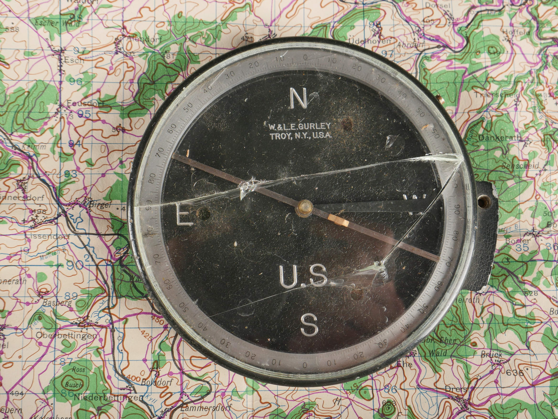 Lot officier US. Comprenant une grosse boussole dont le verre est fissuré et deux cartes, une de Bonn l’autre de Saint Hubert. Divers états de conservation.