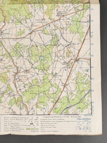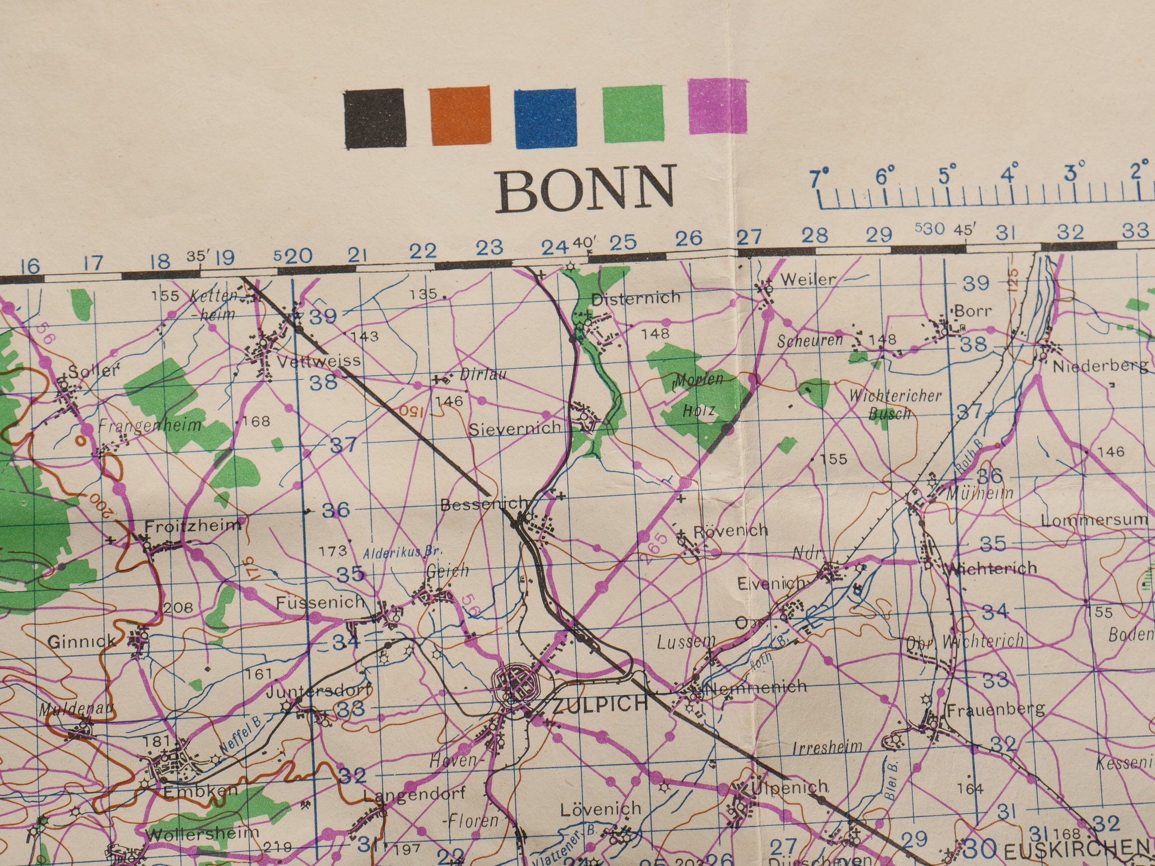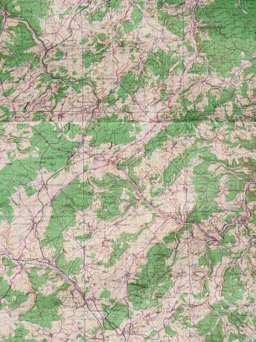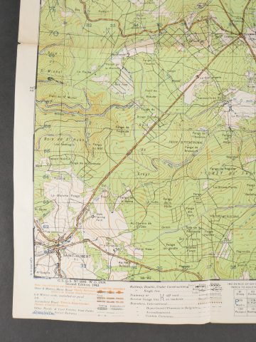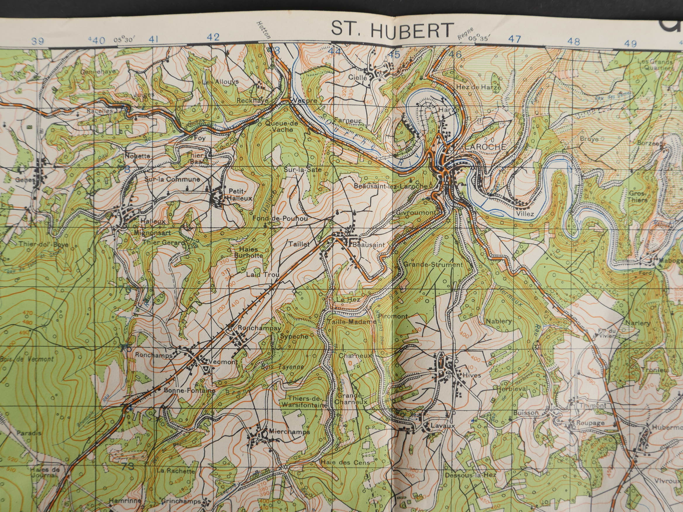 Lot officier US. Comprenant une grosse boussole dont le verre est fissuré et deux cartes, une de Bonn l’autre de Saint Hubert. Divers états de conservation.