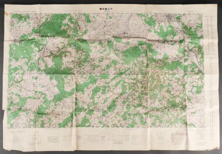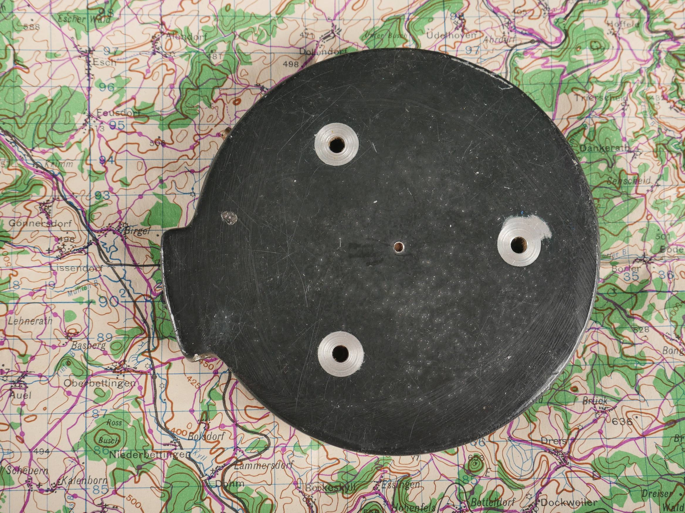 Détails de la vente >Lot officier US. Comprenant une grosse boussole dont le verre est fissuré et deux cartes, une de Bonn l’autre de Saint Hubert. Divers états de conservation.
