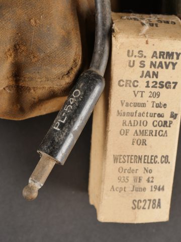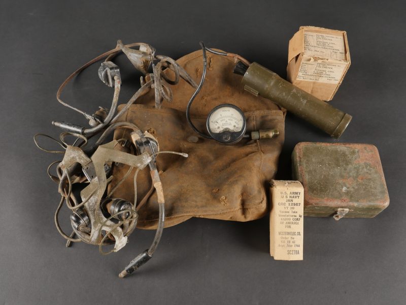Lot Signal Corps US. Comprenant des casques audio dans un contenu dans une pochette à gamelle, ainsi que des éléments de radio dans leur emballage carton d’origine. Divers états de conservation.