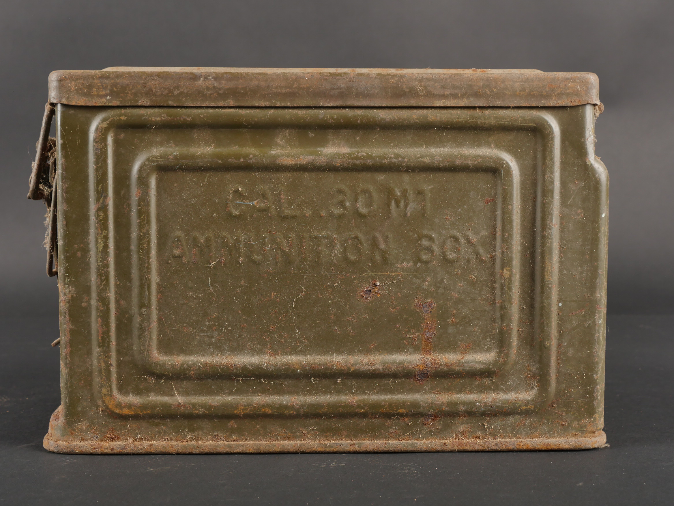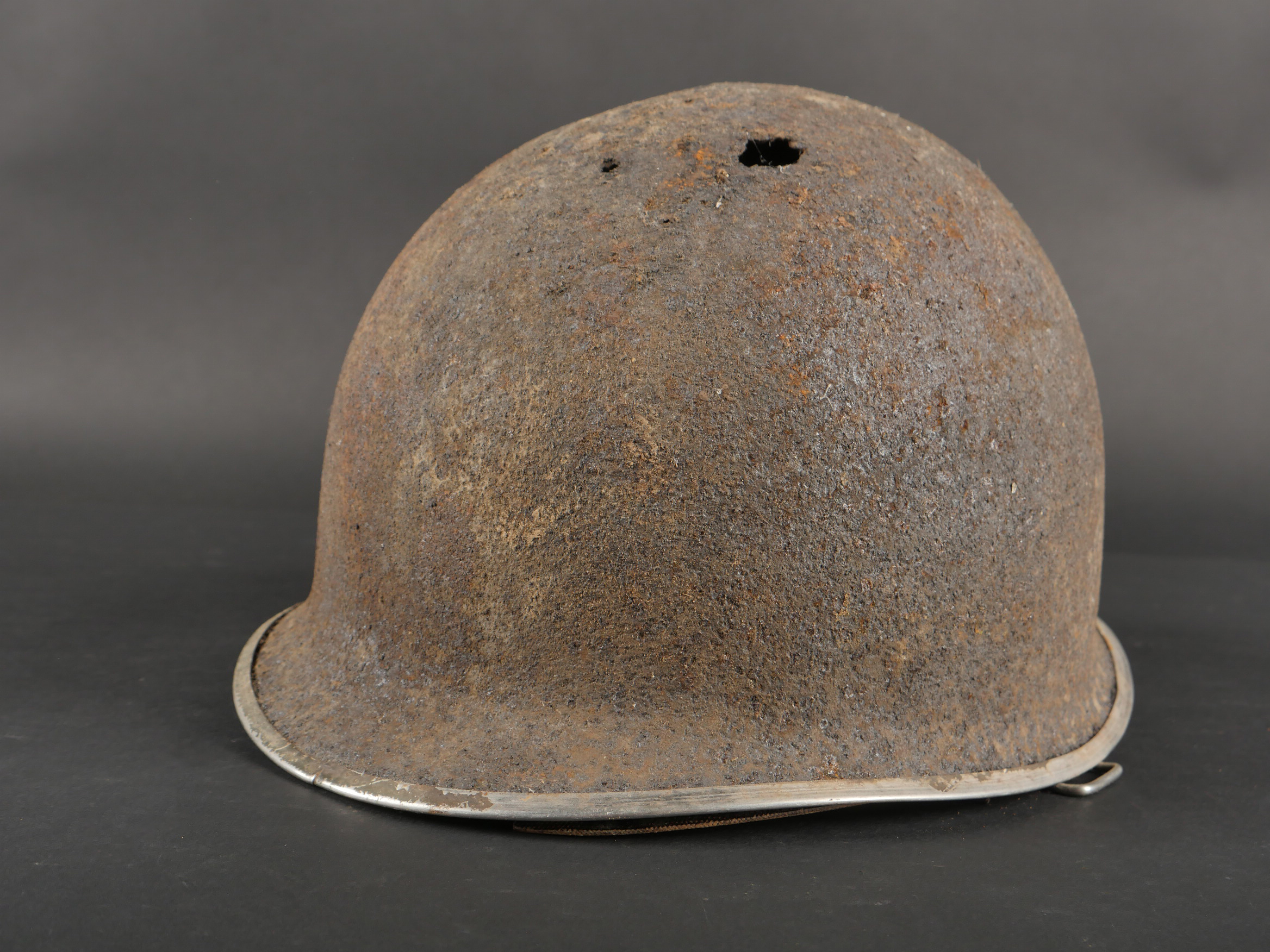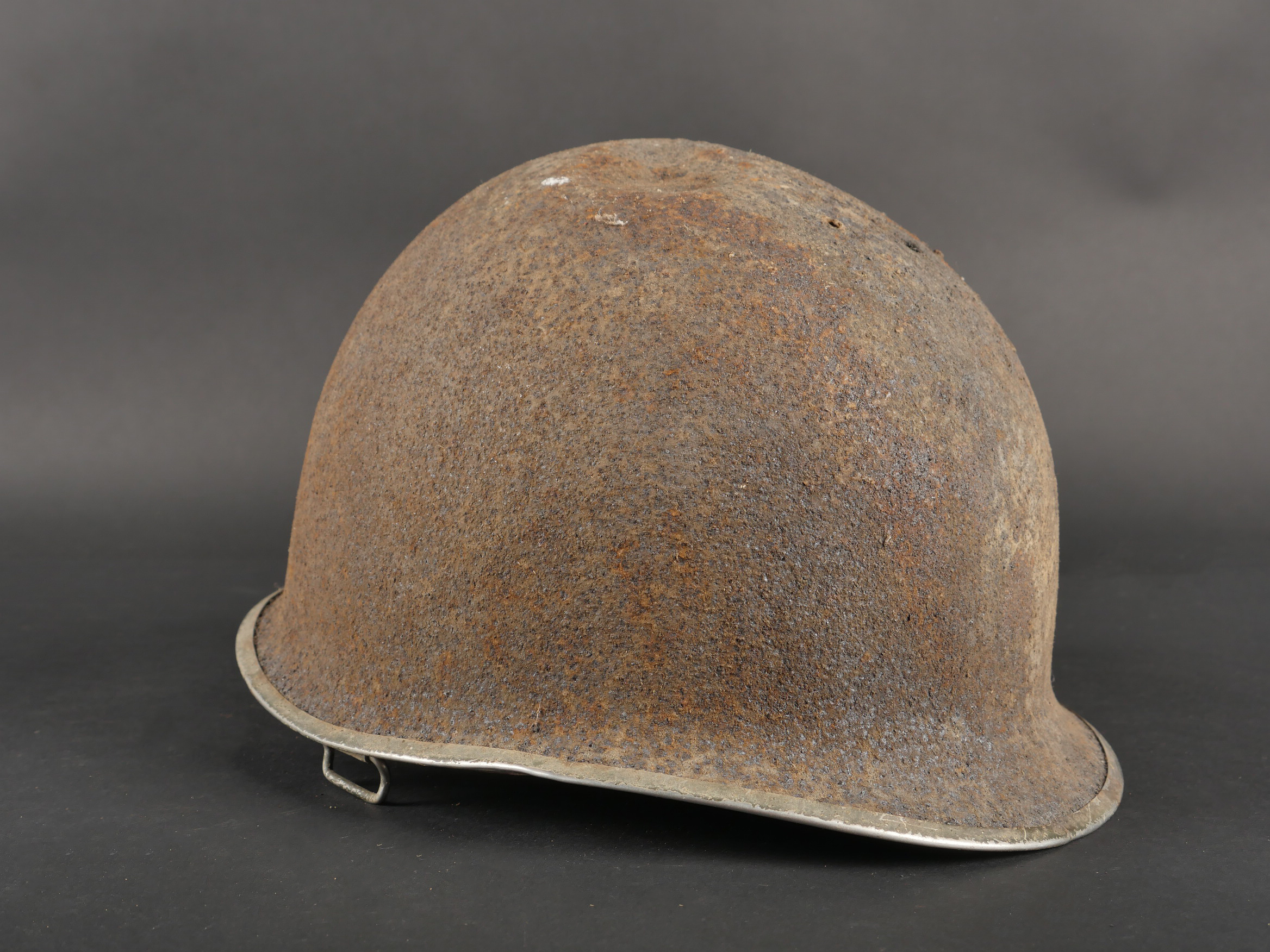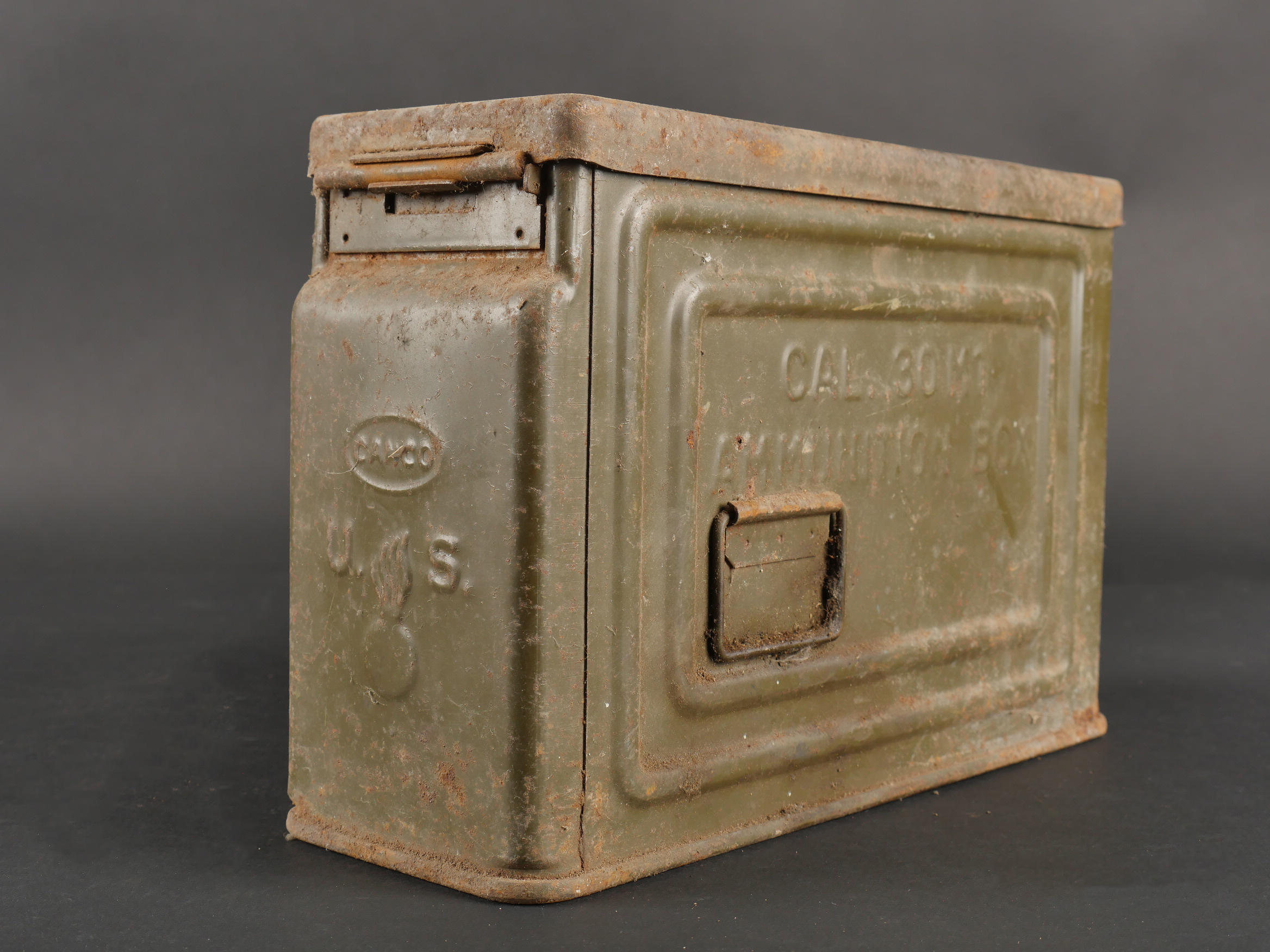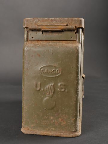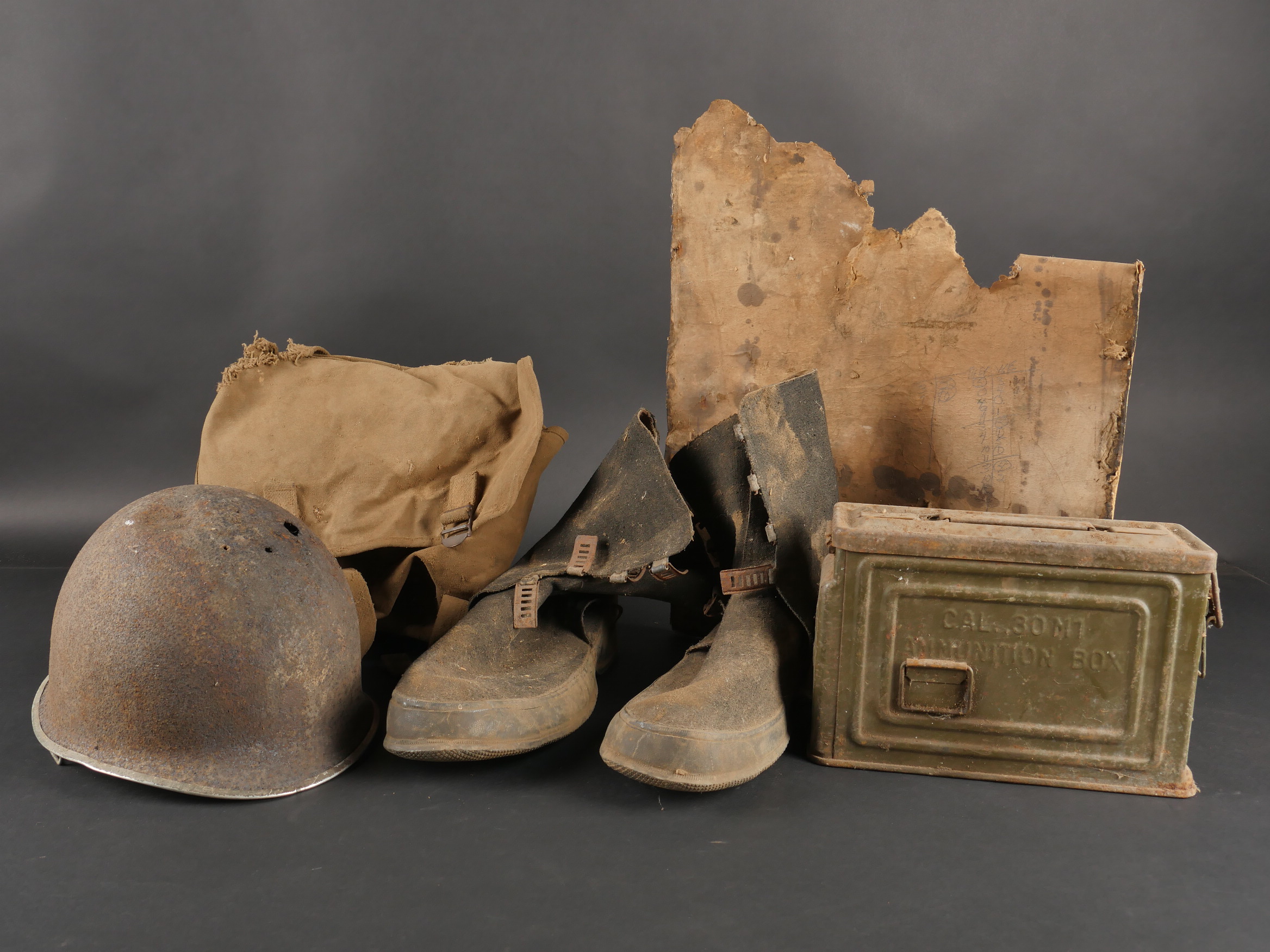Lot US provenance Maison du Sniper carrefour de Foy. Retrouvé dans la célèbre maison du Sniper, un morceau de carton de ration US sur lequel sont inscrits les scores d’un jeu « They/We », eux/nous, soit un simple jeu de société ou un jeu macabre de coups tirés ou reçus ou nombre de victimes…Une paire de Shoe Pack, une coque de casque USM1 pattes mobiles rouillée et percée, et un reste de liner Inland avec restes de peinture blanche. Une musette M36 et une caisse Cal.30. Souvenirs d’un lieu mythique.