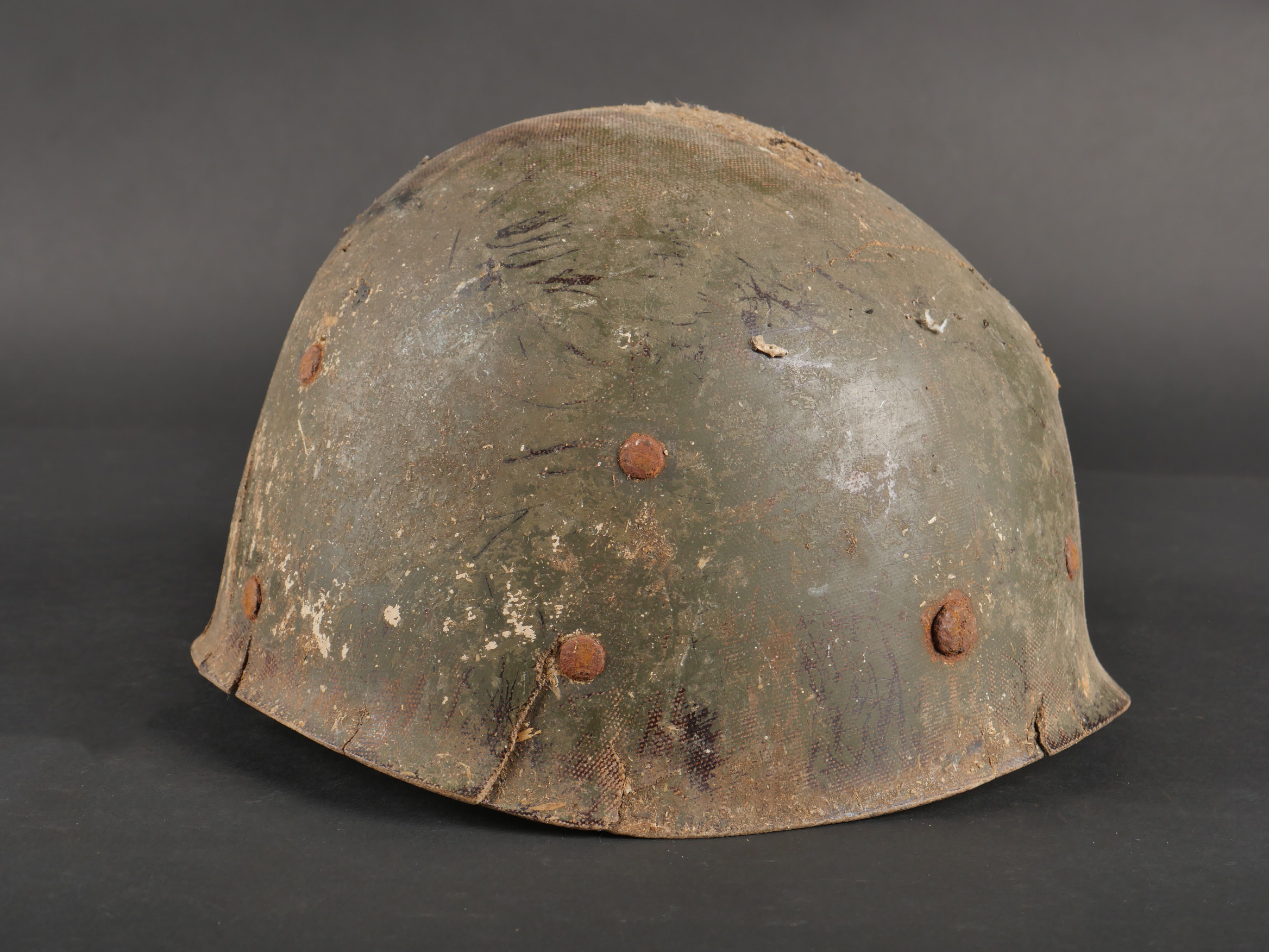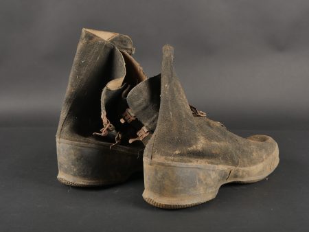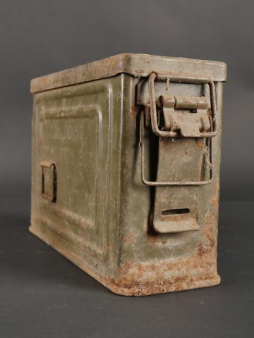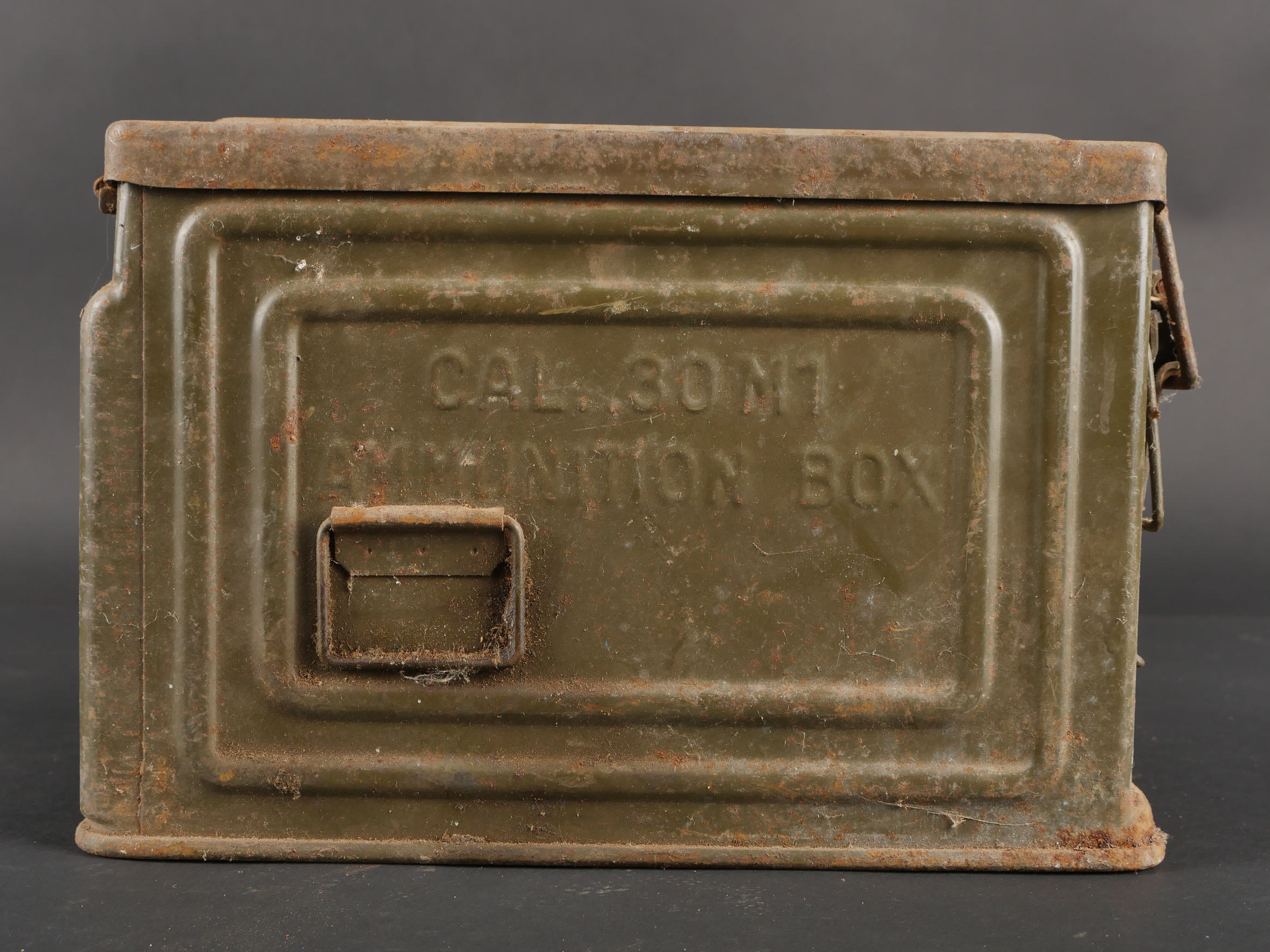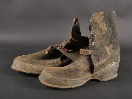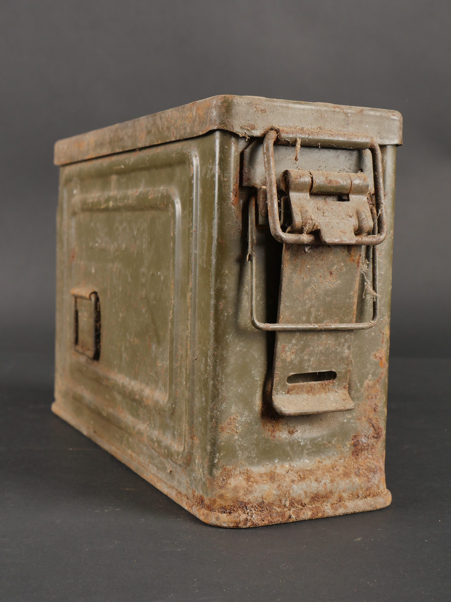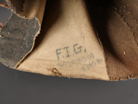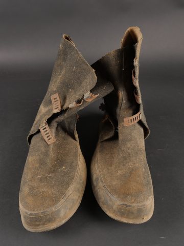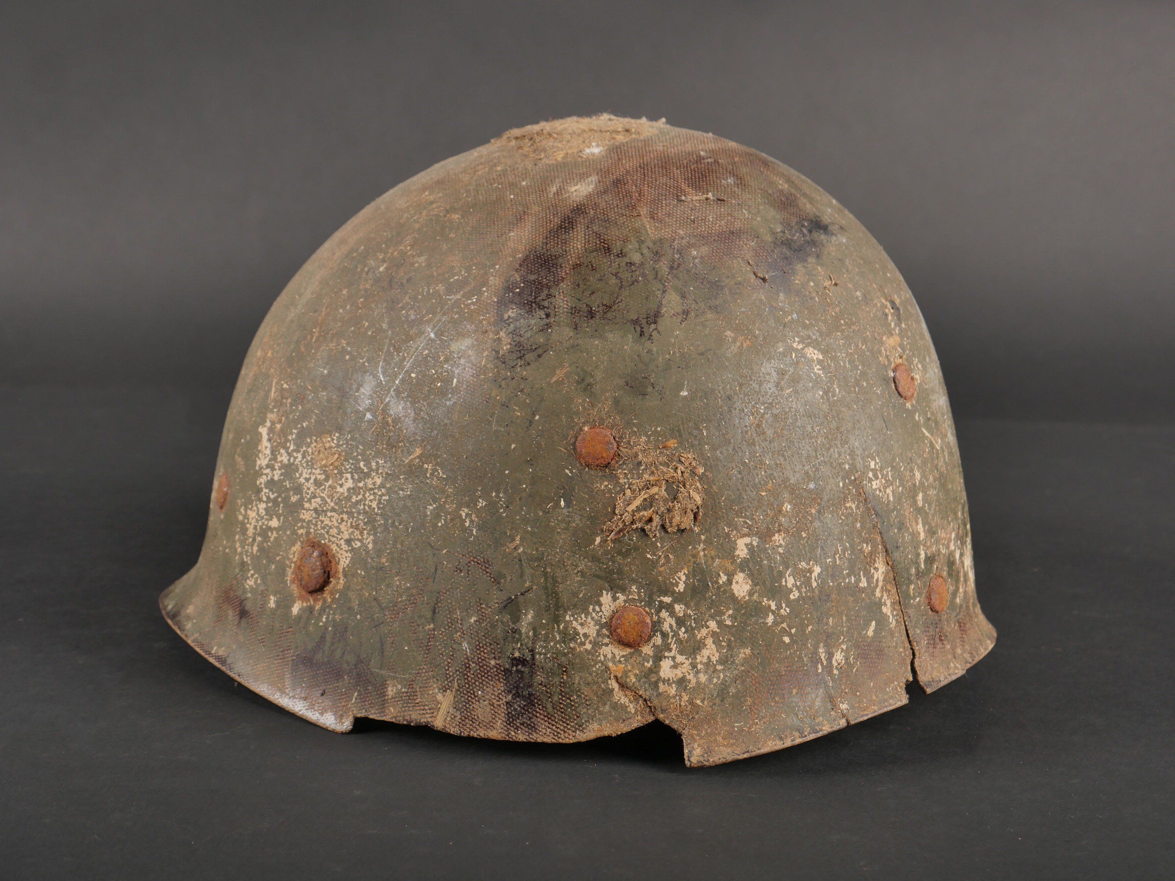 Lot US provenance Maison du Sniper carrefour de Foy. Retrouvé dans la célèbre maison du Sniper, un morceau de carton de ration US sur lequel sont inscrits les scores d’un jeu « They/We », eux/nous, soit un simple jeu de société ou un jeu macabre de coups tirés ou reçus ou nombre de victimes…Une paire de Shoe Pack, une coque de casque USM1 pattes mobiles rouillée et percée, et un reste de liner Inland avec restes de peinture blanche. Une musette M36 et une caisse Cal.30. Souvenirs d’un lieu mythique.