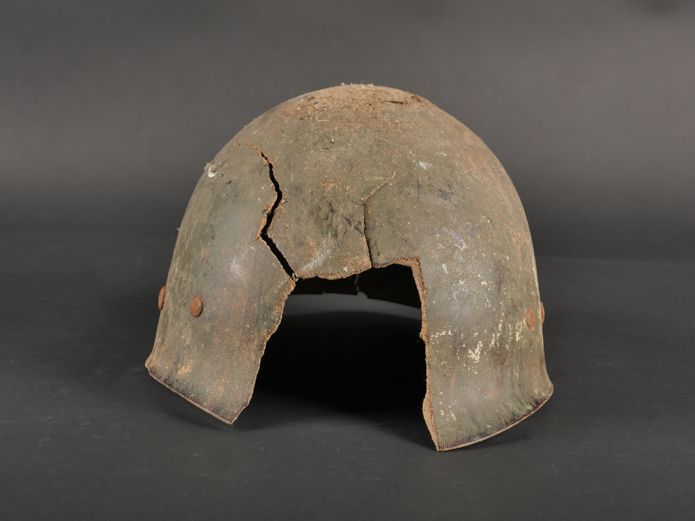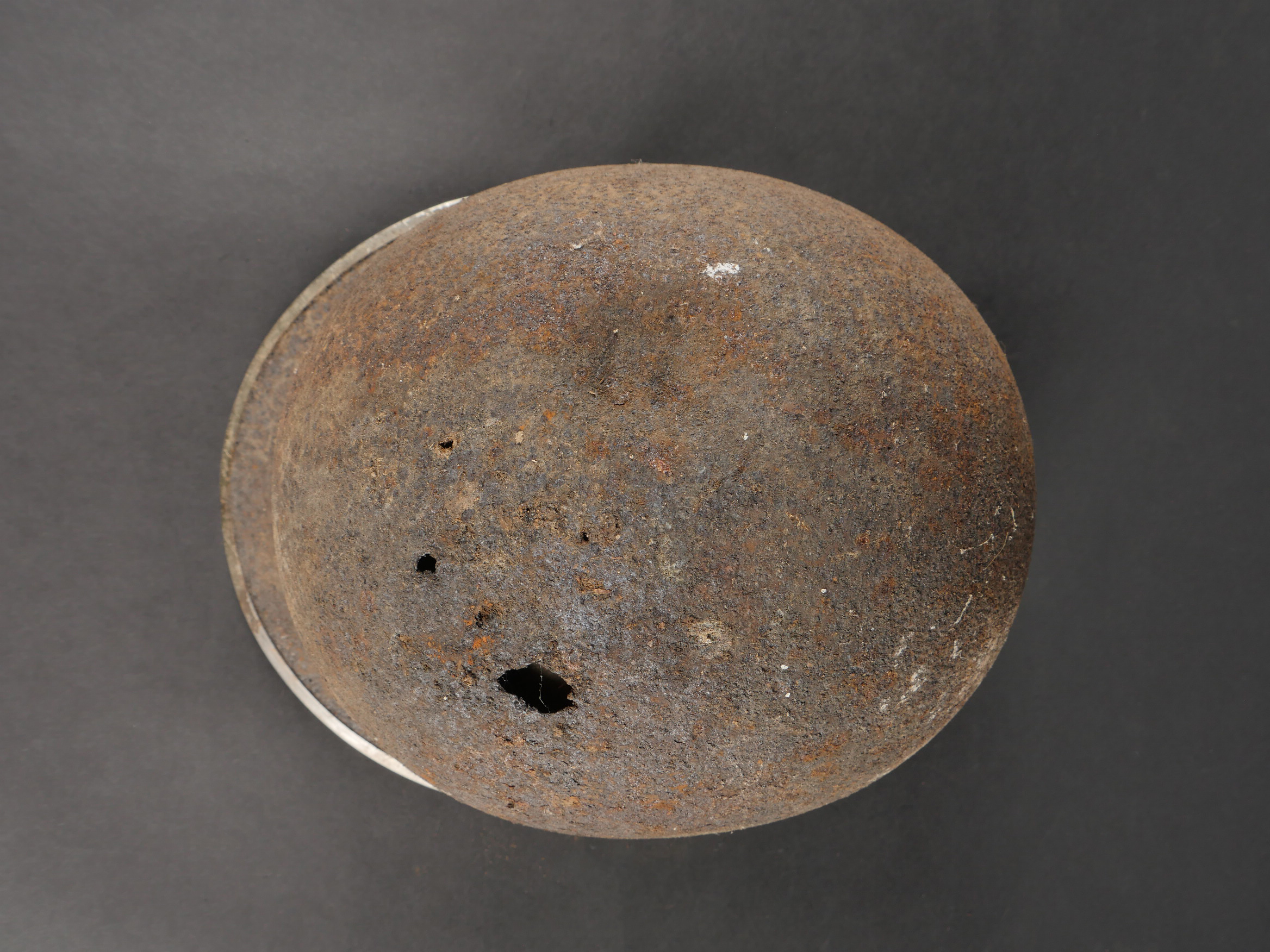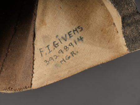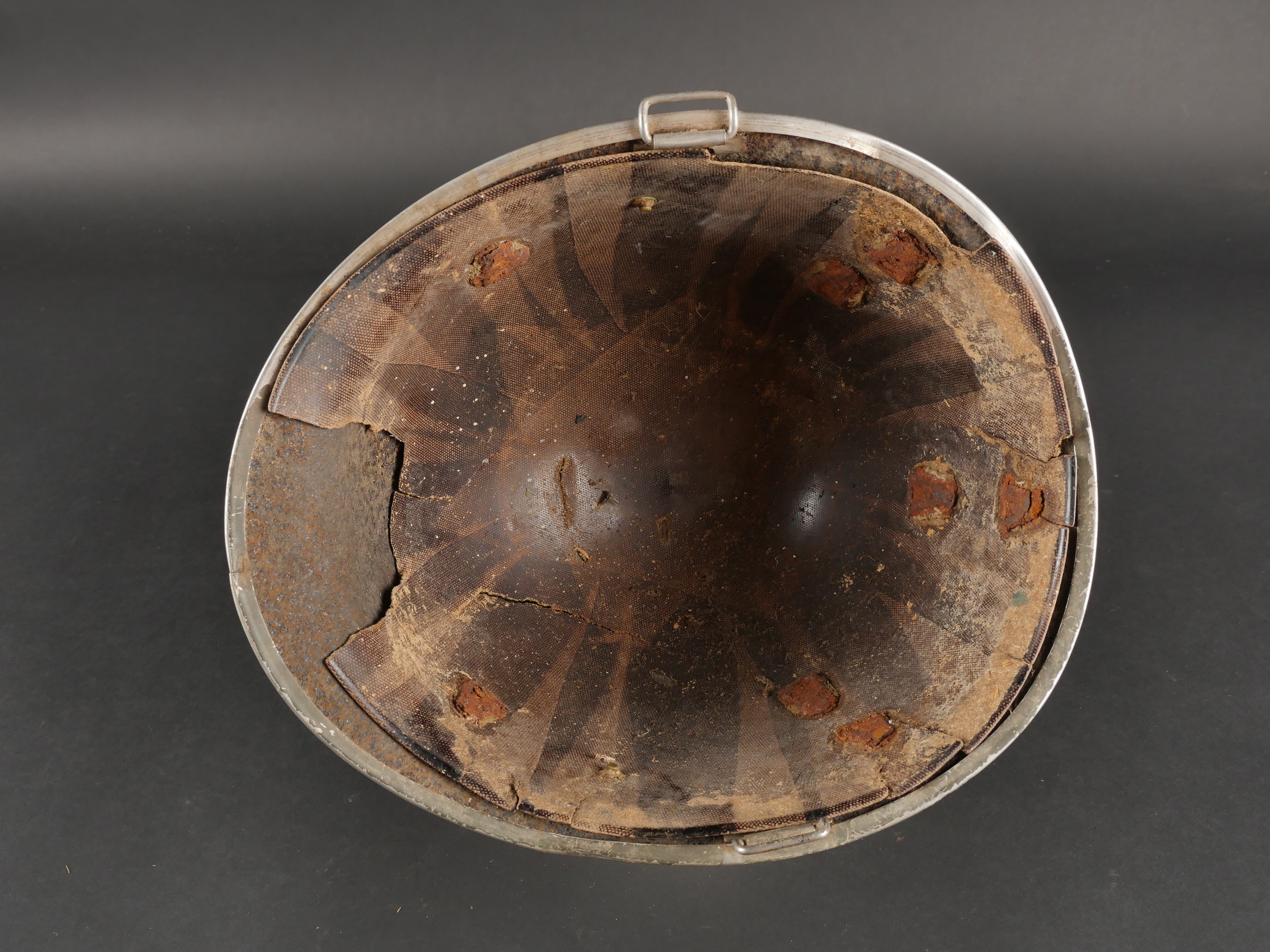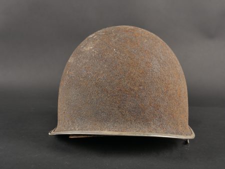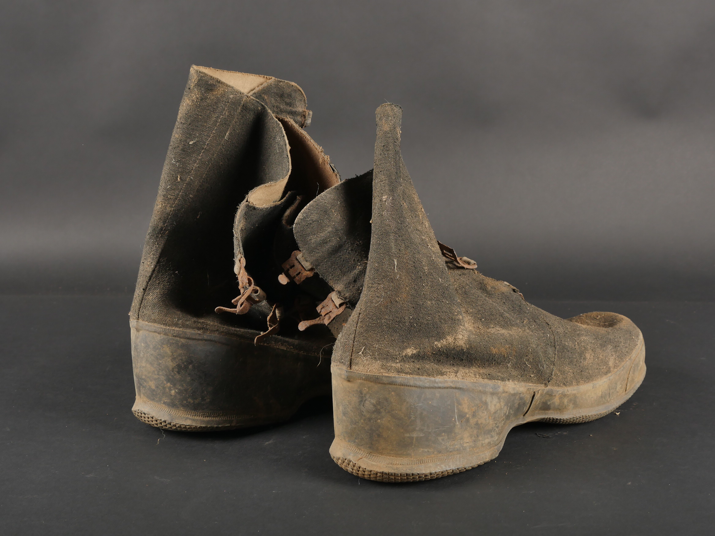 Lot US provenance Maison du Sniper carrefour de Foy. Retrouvé dans la célèbre maison du Sniper, un morceau de carton de ration US sur lequel sont inscrits les scores d’un jeu « They/We », eux/nous, soit un simple jeu de société ou un jeu macabre de coups tirés ou reçus ou nombre de victimes…Une paire de Shoe Pack, une coque de casque USM1 pattes mobiles rouillée et percée, et un reste de liner Inland avec restes de peinture blanche. Une musette M36 et une caisse Cal.30. Souvenirs d’un lieu mythique.