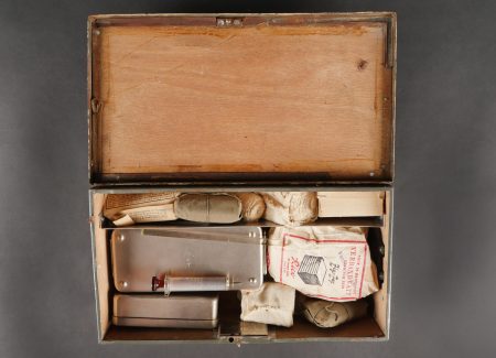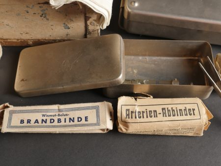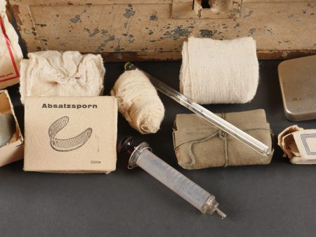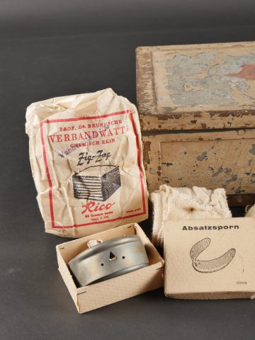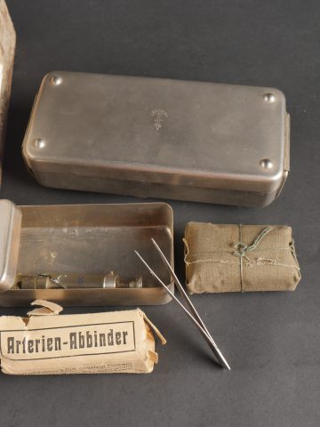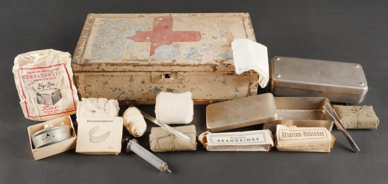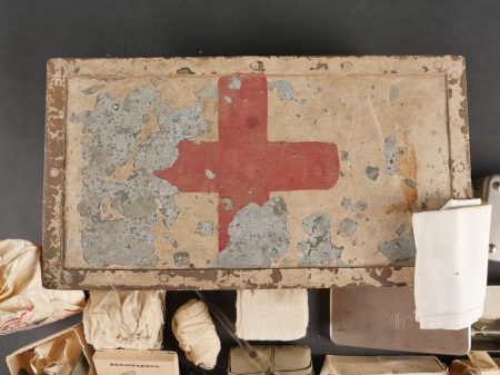 Luftschutzverbandkasten terrain. Intéressante caisse de premiers soins de la Luftschutz, utilisée sur le terrain cette dernière a été repeinte en blanc avec ajout de trois croix rouges peinte à la main. Une partie de son contenu d’origine est présent : pansements, compresses, bandage, stérilisateur …Divers états de conservation.