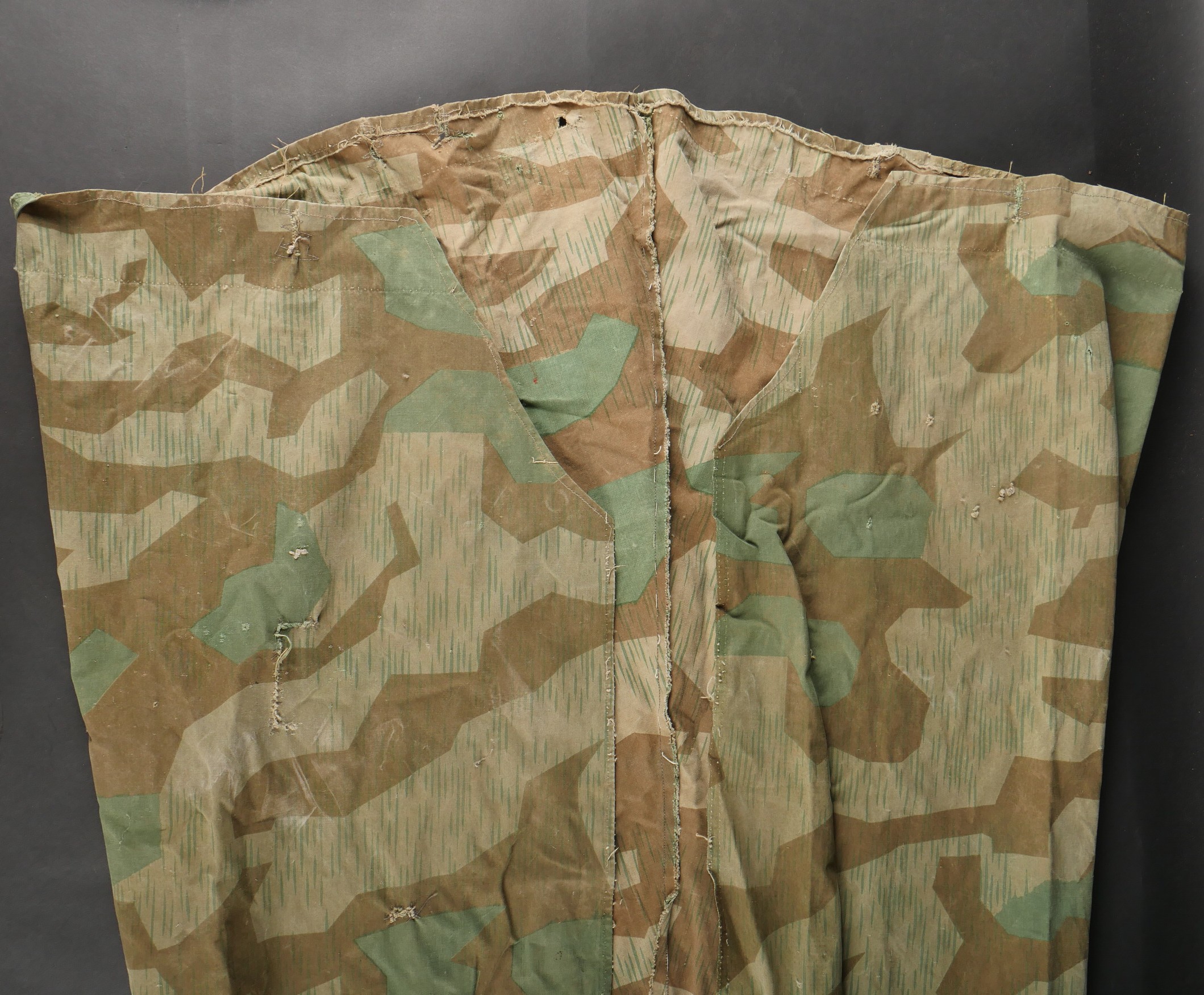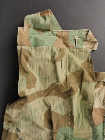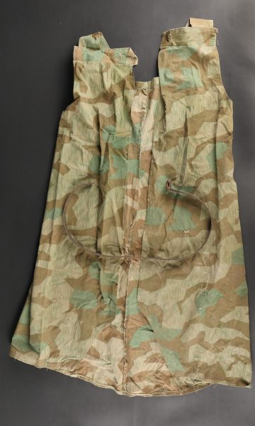 Détails de la vente >Objets allemands réutilisés par des civils. Comprenant une blouse de travail réalisée en toile de tente camouflée ainsi qu’une sangle en cuir de Mauser 98k retaillée pour être... en savoir plus