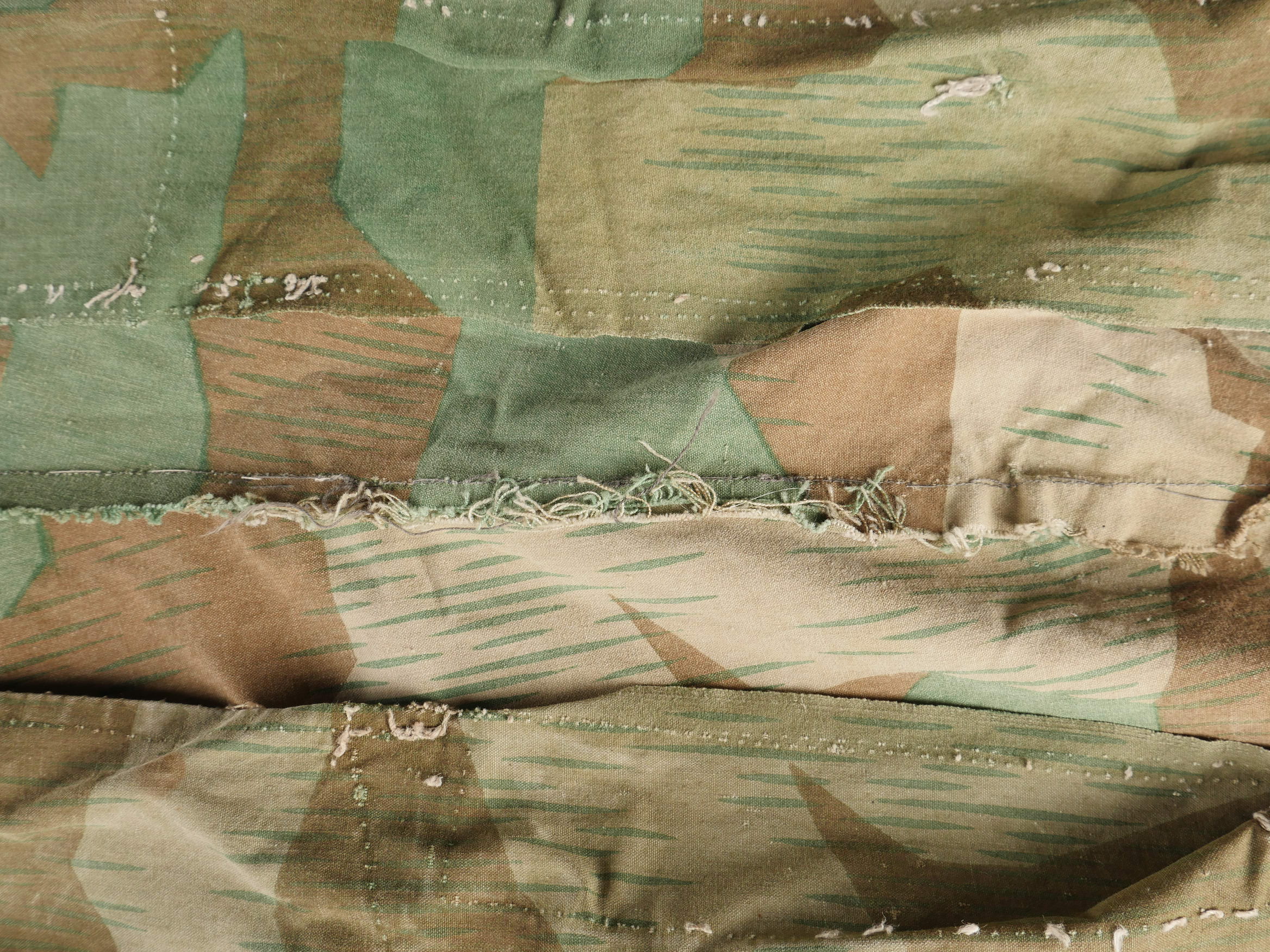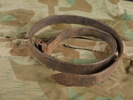 Objets allemands réutilisés par des civils. Comprenant une blouse de travail réalisée en toile de tente camouflée ainsi qu’une sangle en cuir de Mauser 98k retaillée pour être utilisée en ceinture. Divers états de conservation.