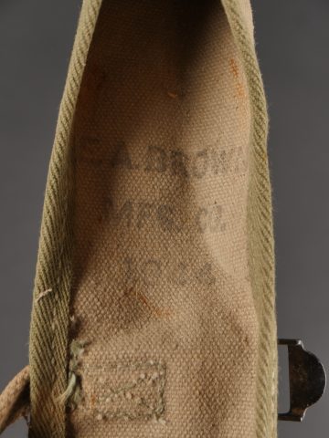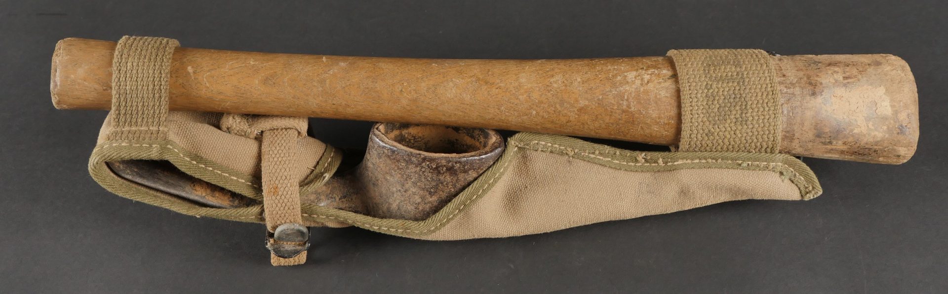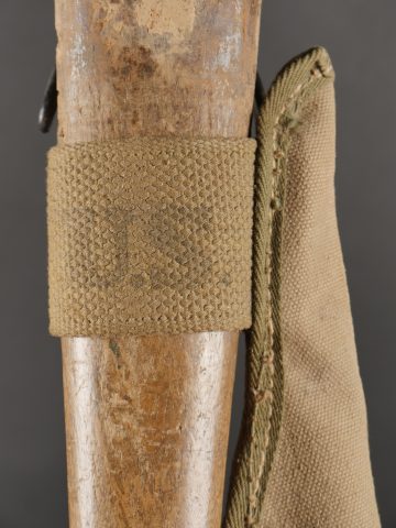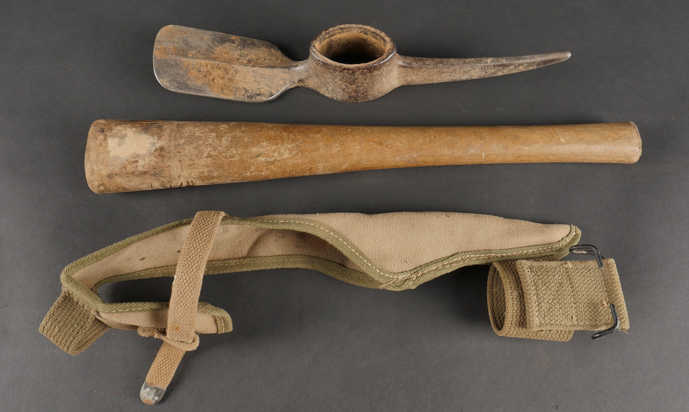 Détails de la vente >Pioche US. Marquage illisible sur le fer, avec son manche en bois et son étui daté 1944.