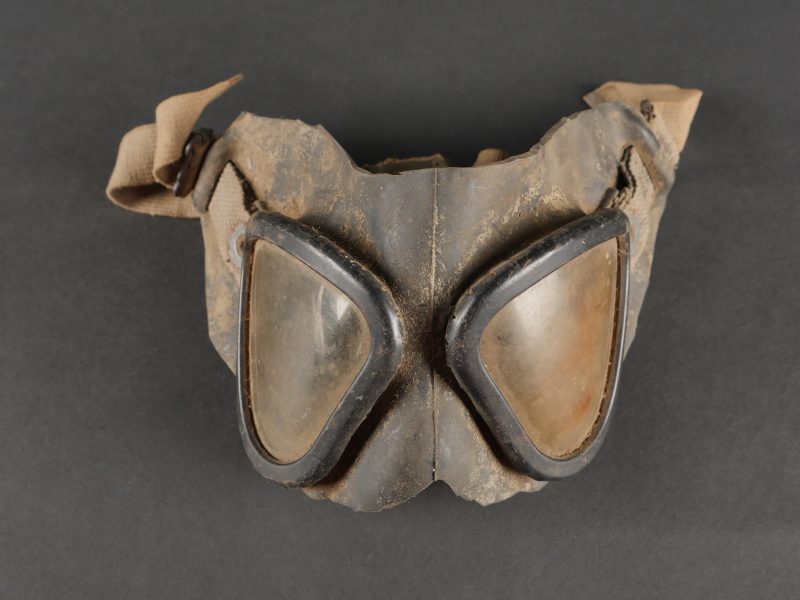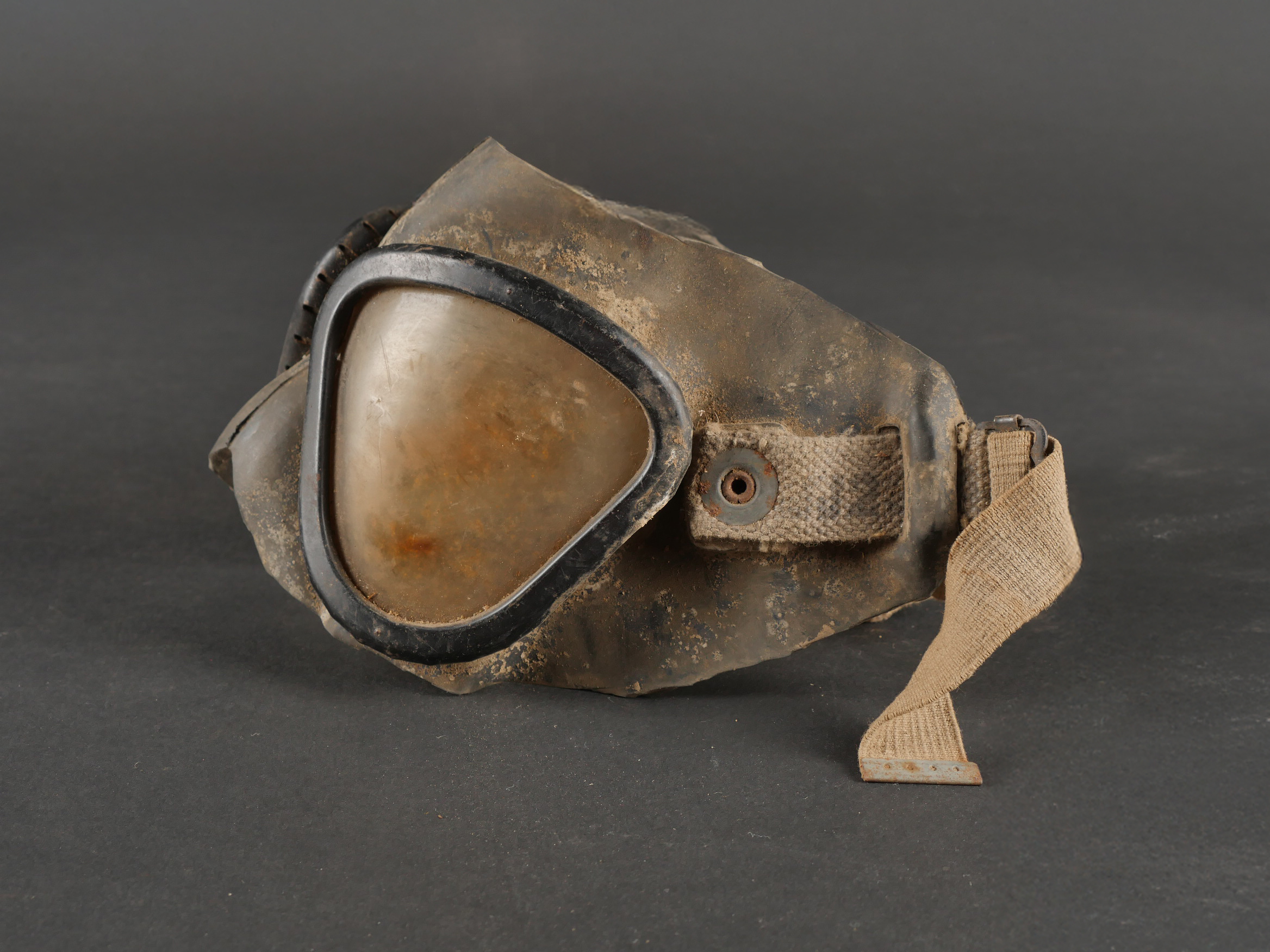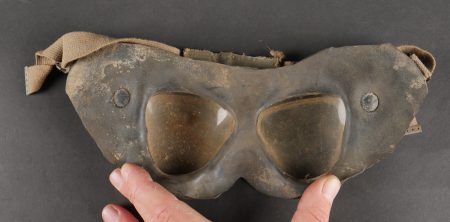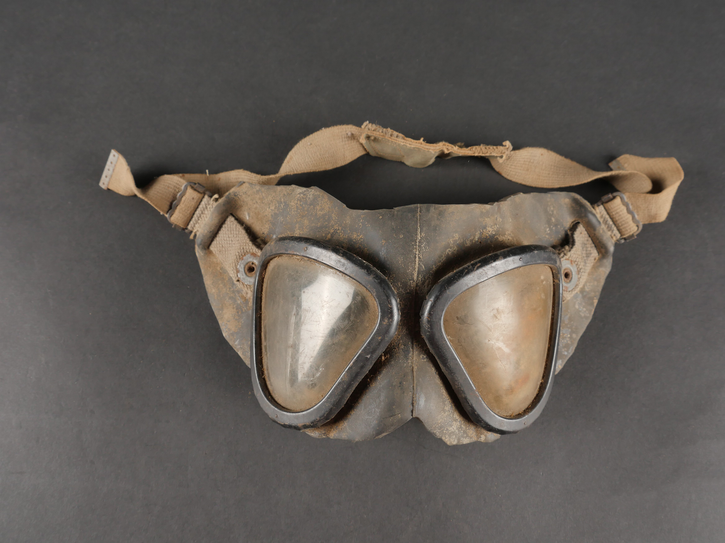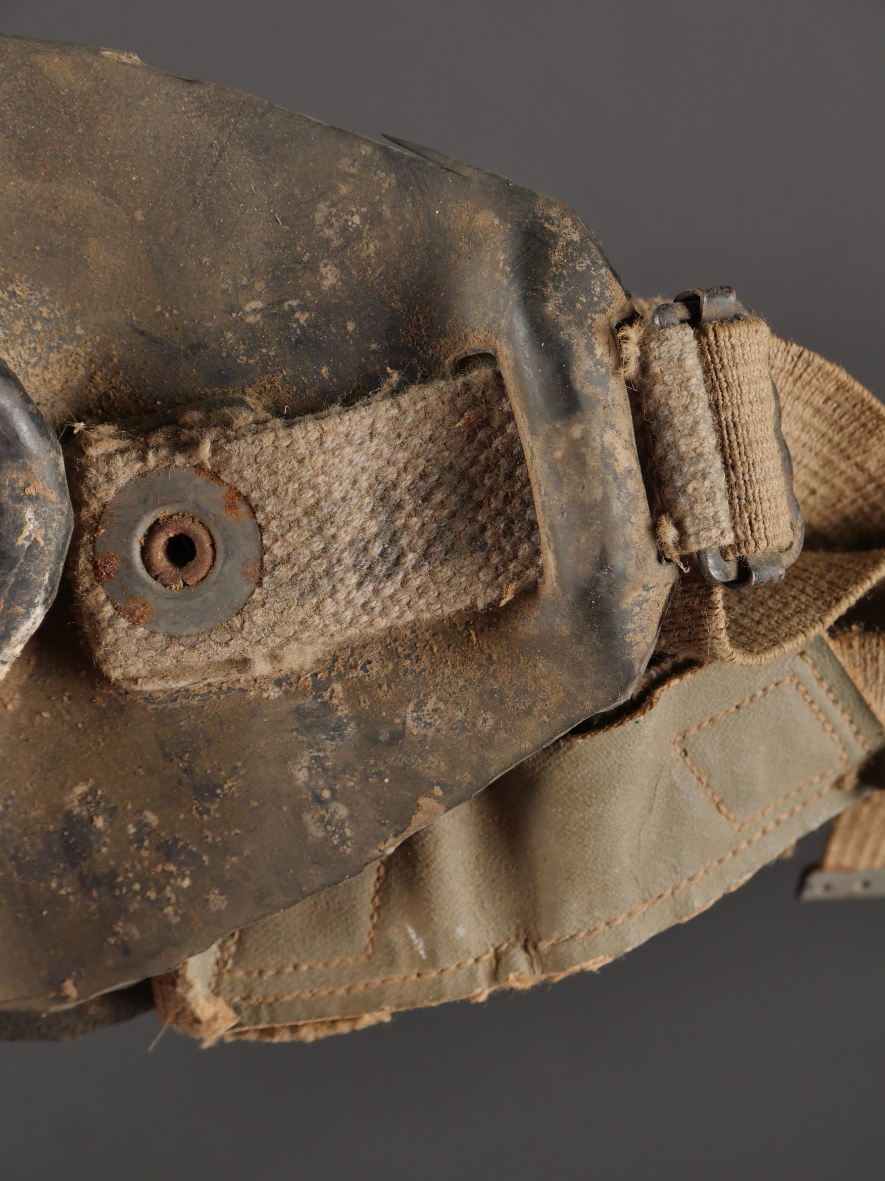 Rares lunettes de protection, masque anti gaz assaut. Rare lunettes réalisées dans un masque anti-gaz d’assaut M5 découpé, probablement utilisées par une unité parachutiste. Il existe une photo qui a fait la une du magazine Air Force où l’on voit Robert Noody du 506th PIR de la 101st Airborne porter ce type de lunettes. Belle pièce terrain.