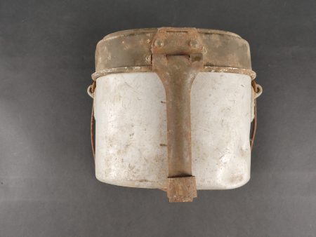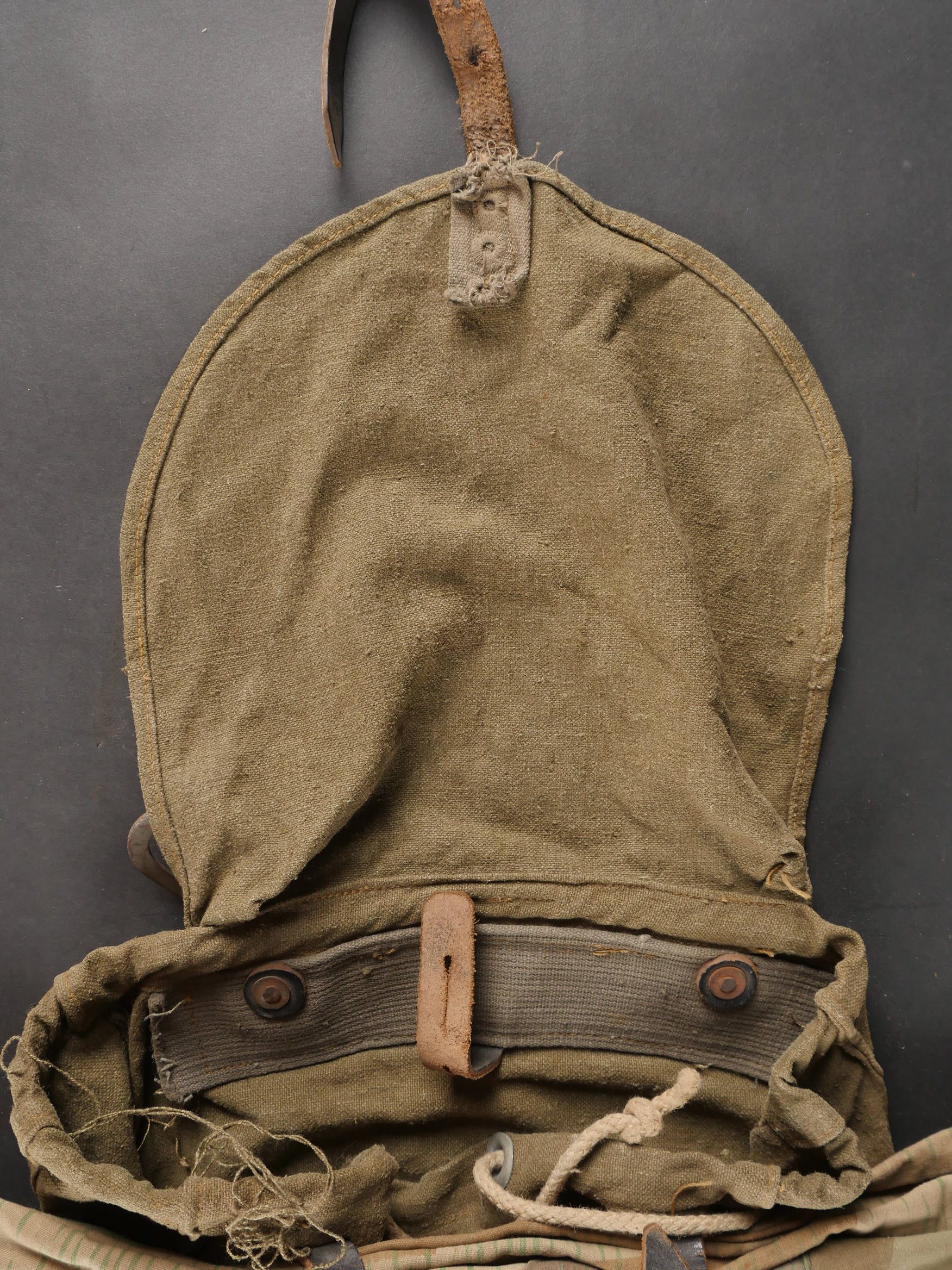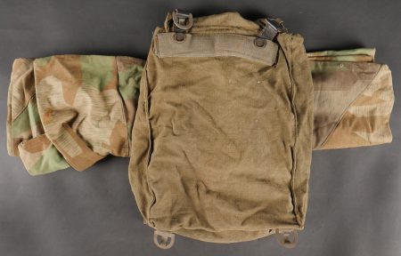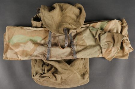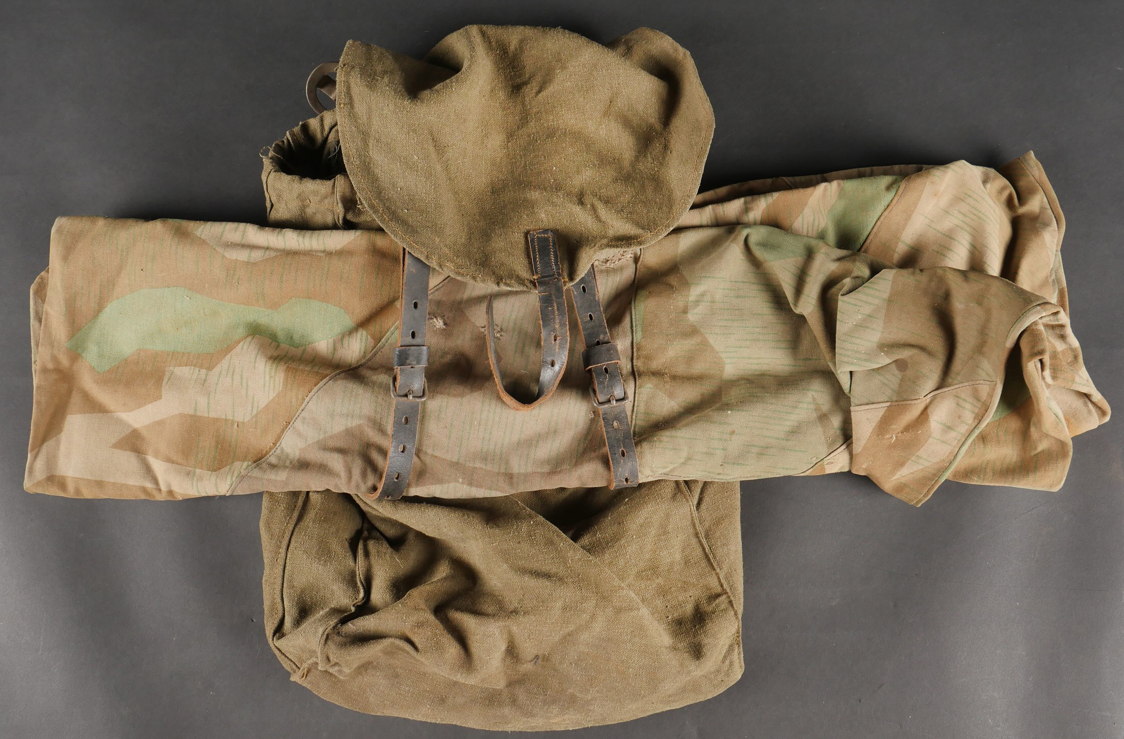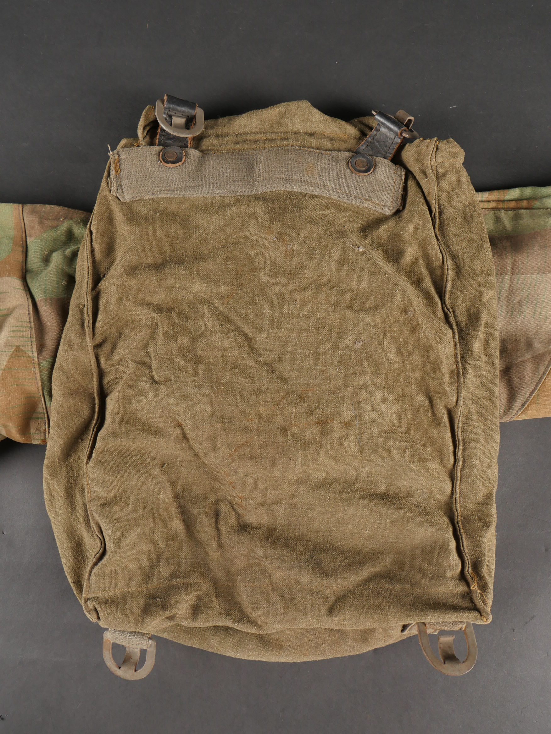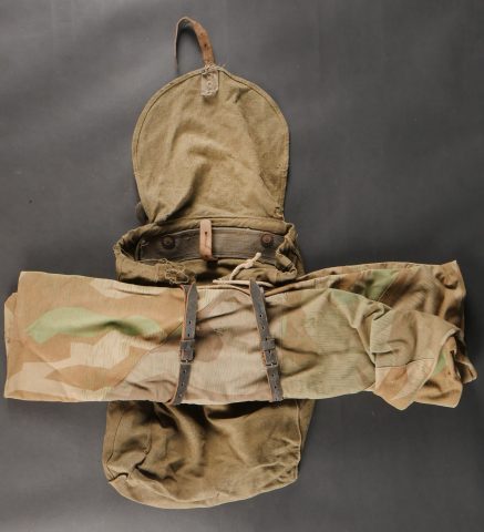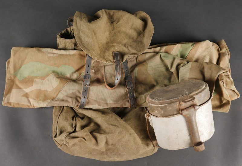 Détails de la vente >Sac à dos allemand. Sac à dos allemand dit d’artilleur avec une housse réalisée en toile de tente camouflée et une gamelle.