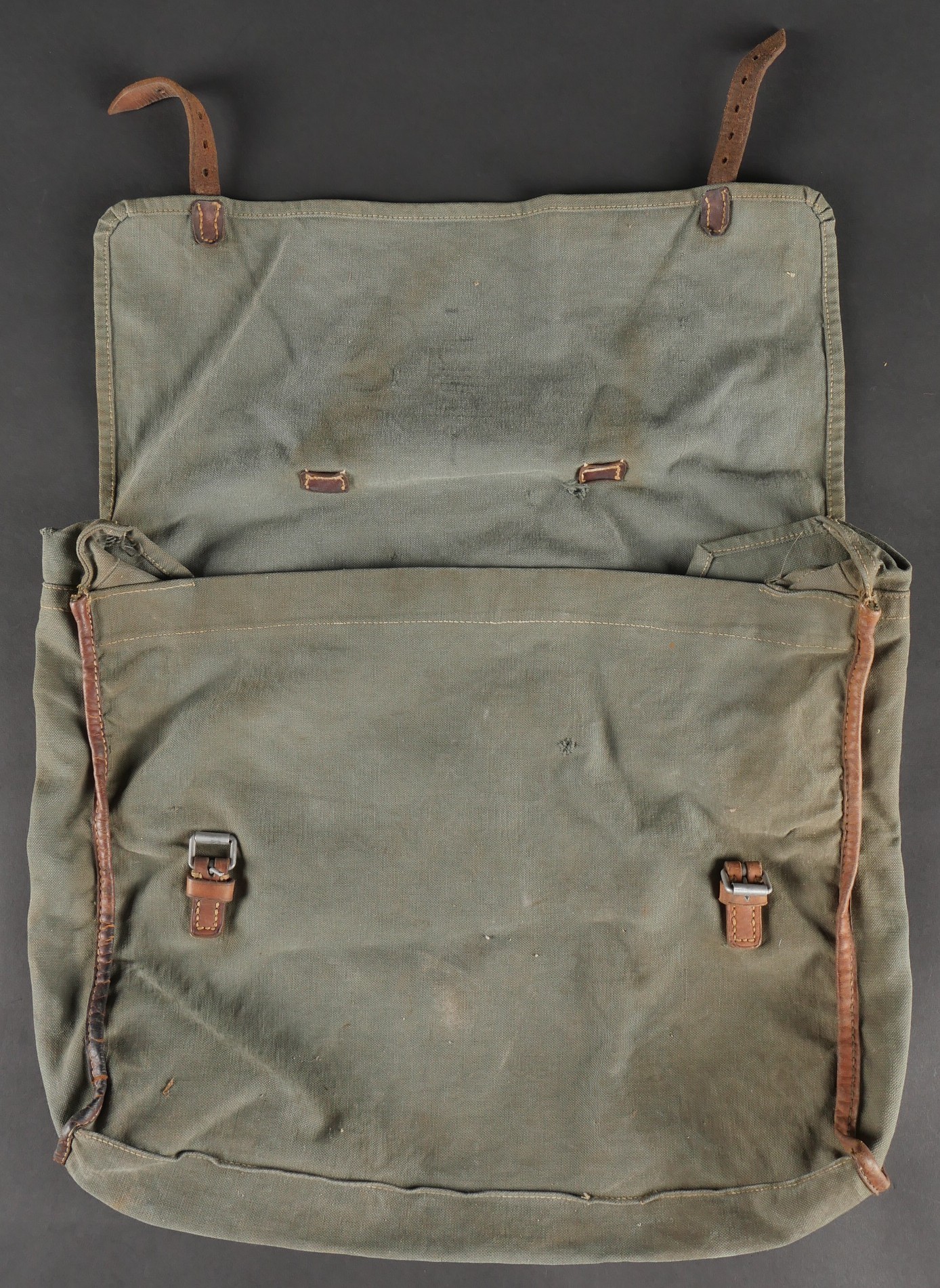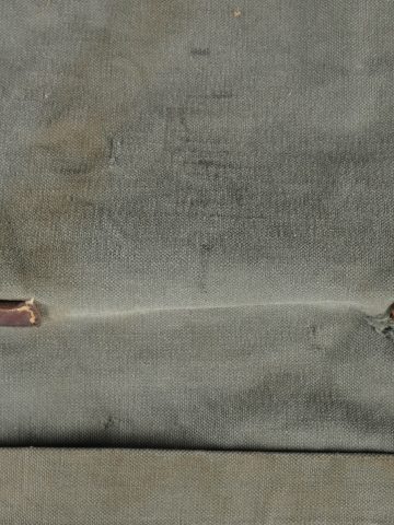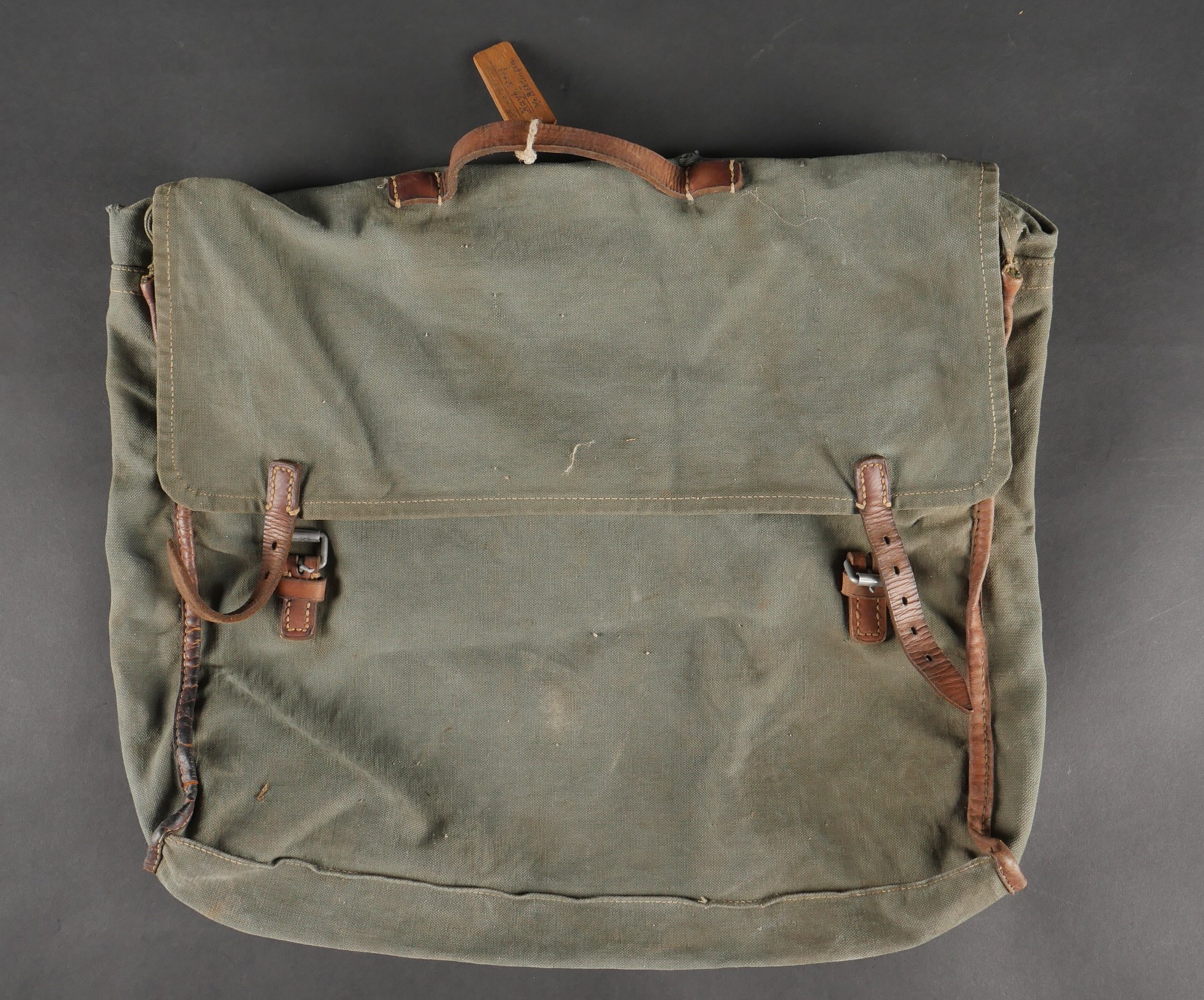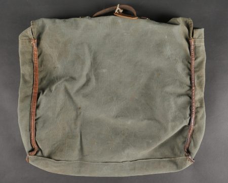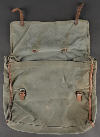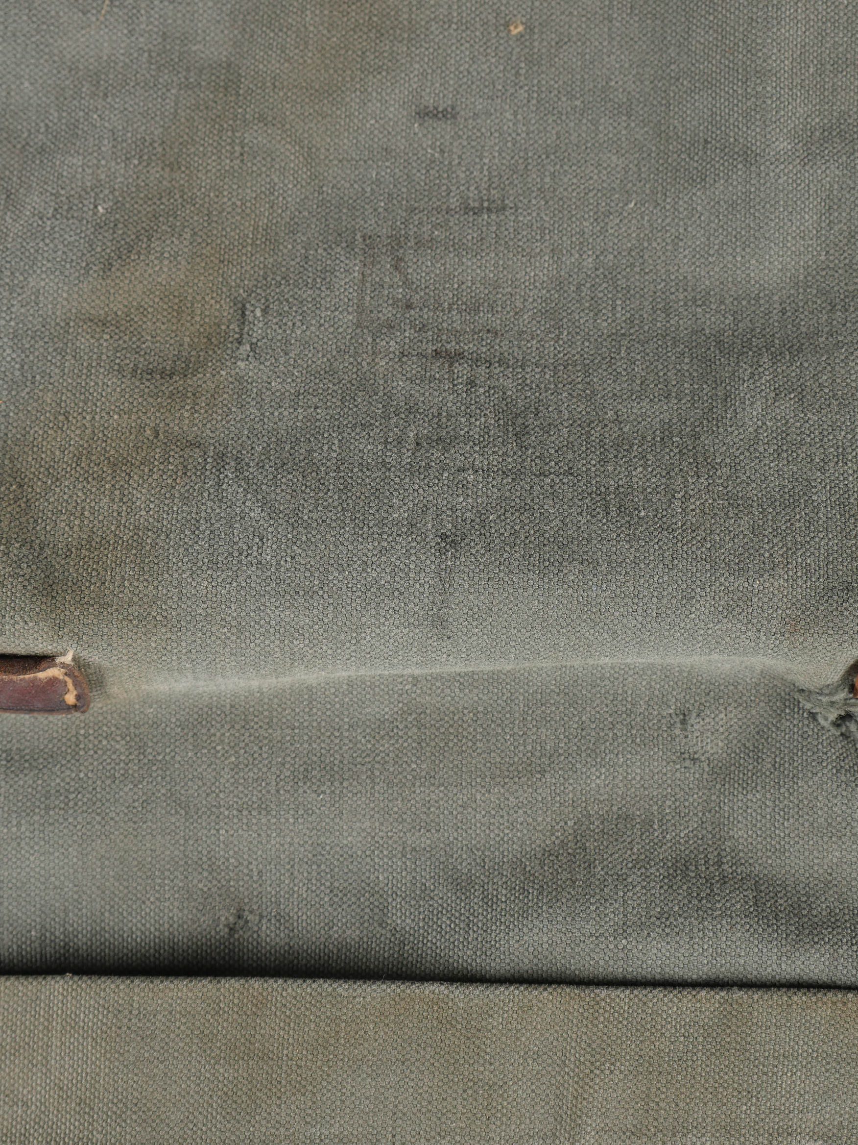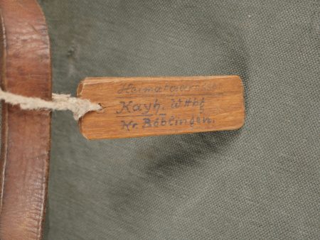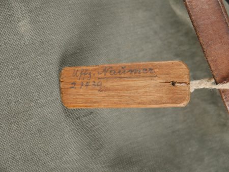 Sac de permissionnaire allemand Unteroffizier Naumer. Intéressant sac de permissionnaire en toile gris/bleu tamponné AR 35 sous le rabat. Une étiquette en bois est accrochée par une ficelle à la poignée cuir de ce dernier sur laquelle nous pouvons y lire Uffz Naumer 21439 et au dos Heimatadresse. SI ce chiffre est un Feldpost il renvoie à la Backerei Kompanie 95.