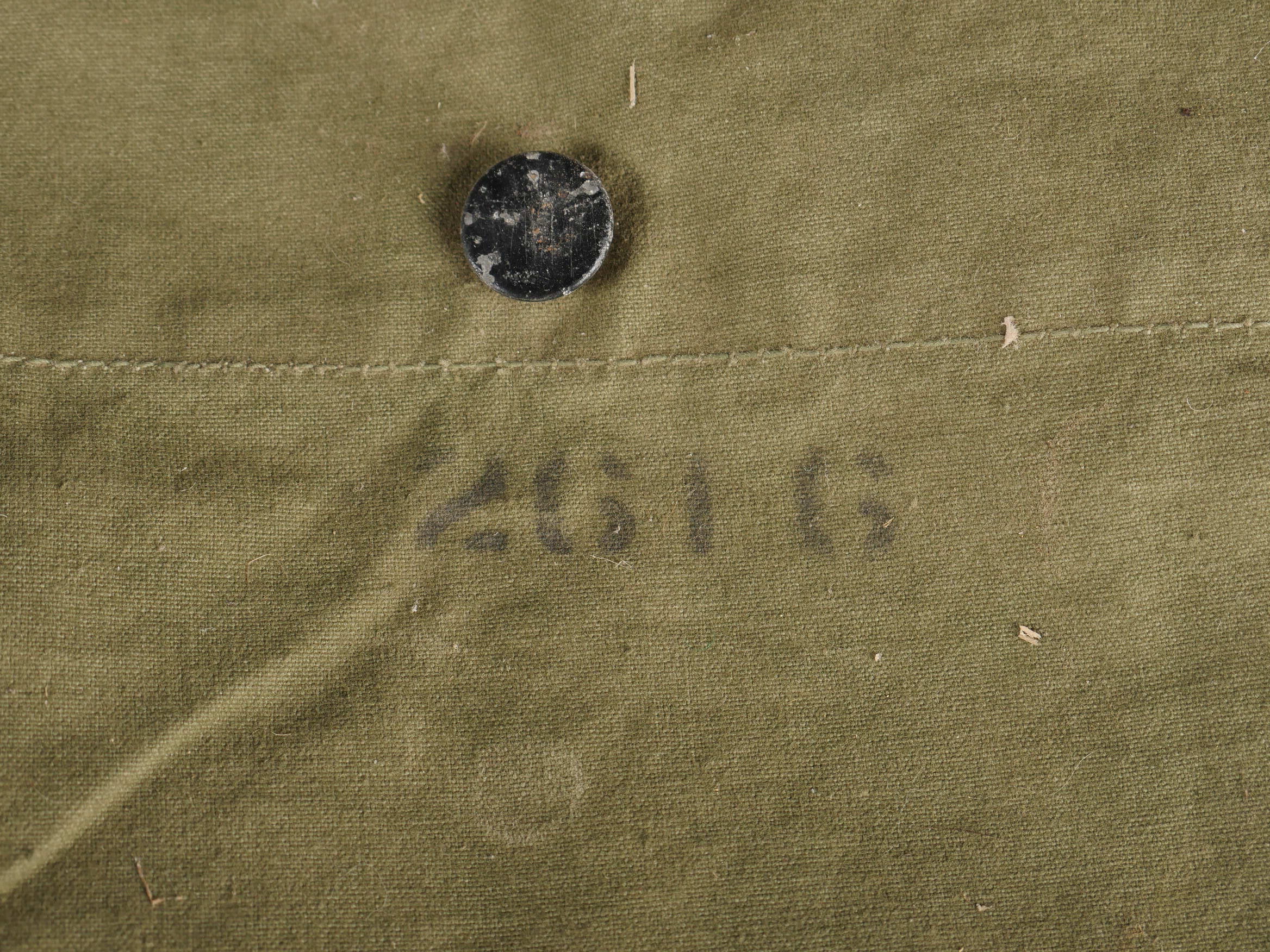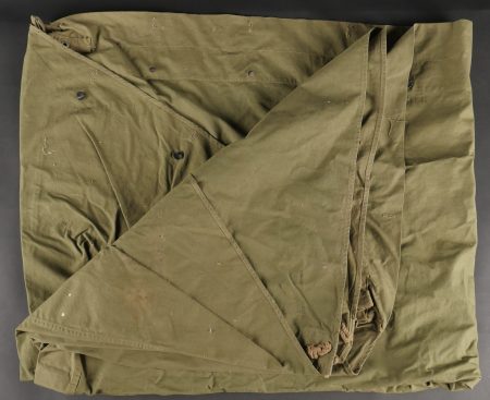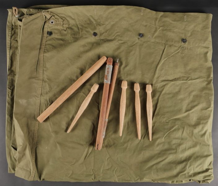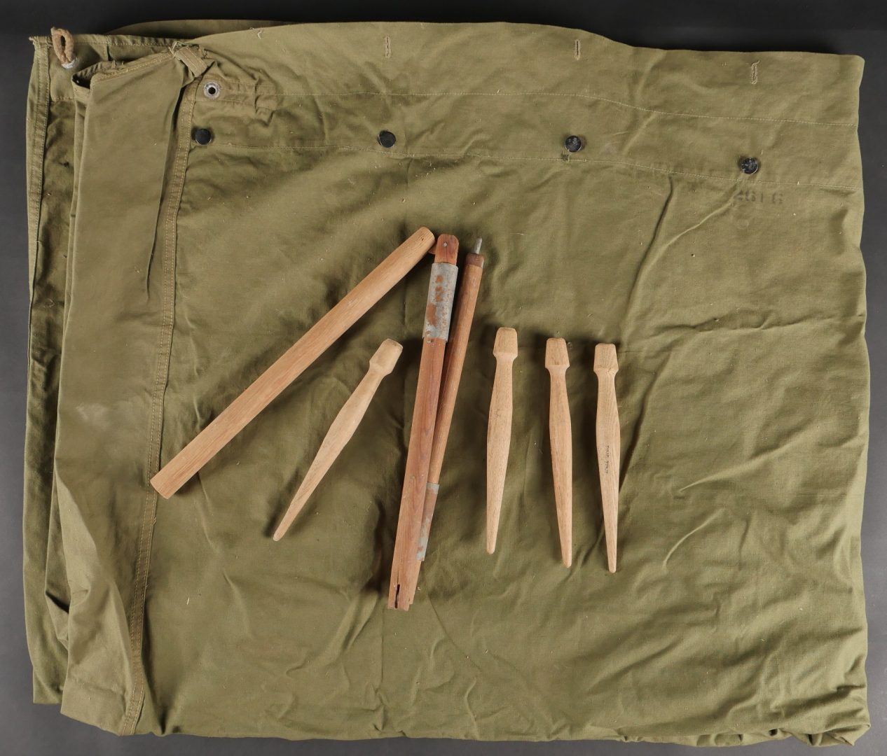 Détails de la vente >Toile de tente US. Belle toile de tente OD7 avec son mat daté 1943 et ses piquets datés 1942.