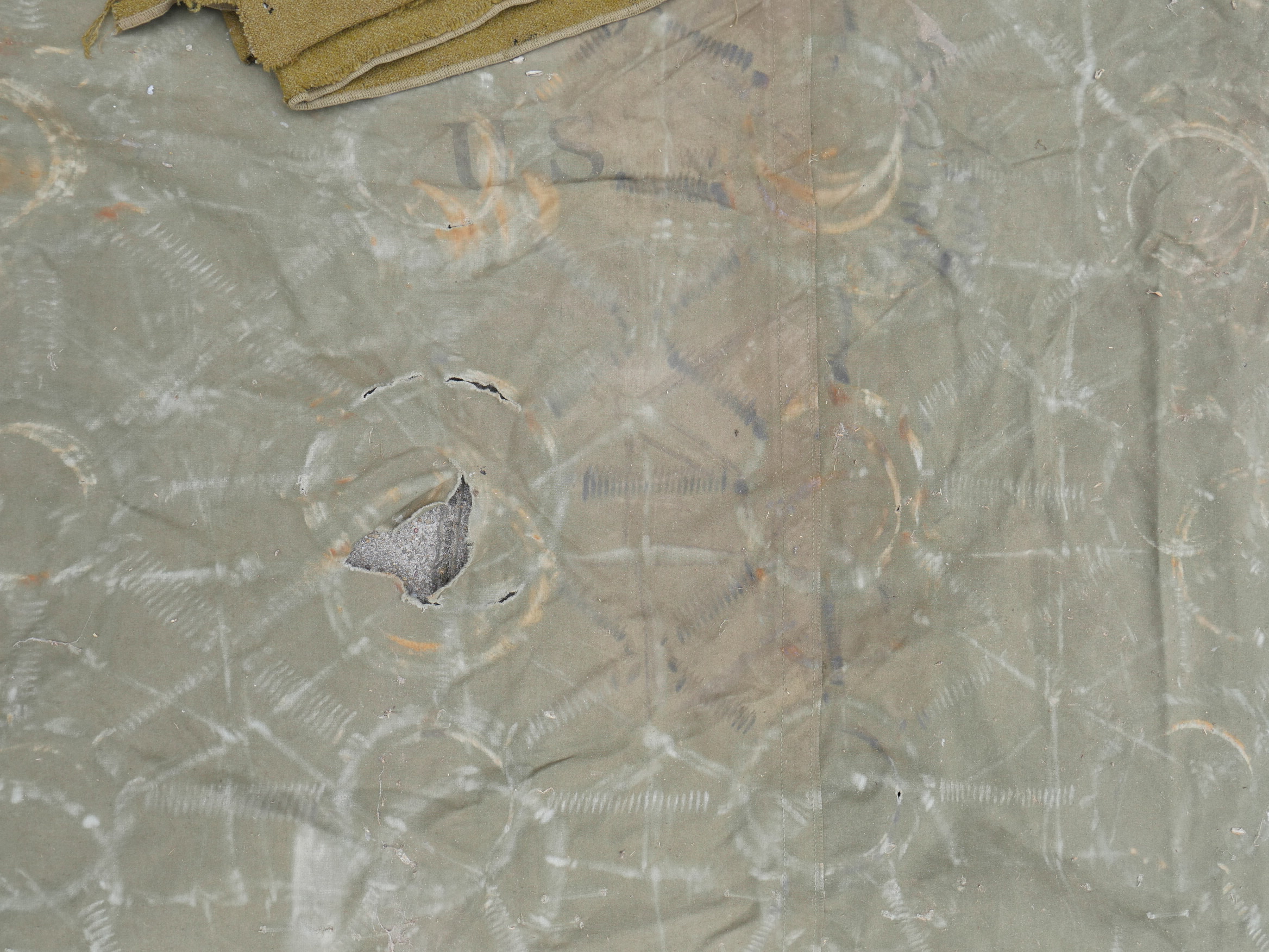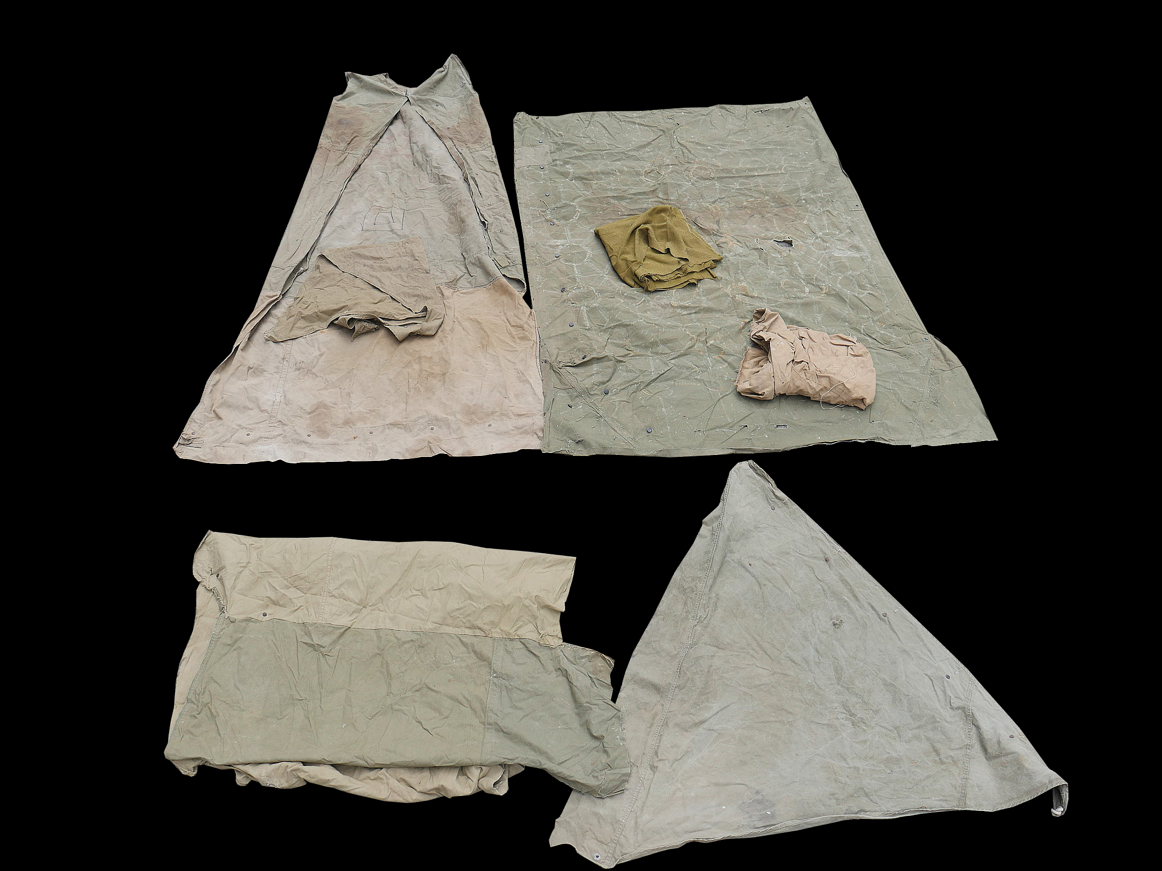 Détails de la vente >Toiles de tente US. Fort lot de morceaux de toiles de tentes US et bâches diverses. Divers états de conservation.