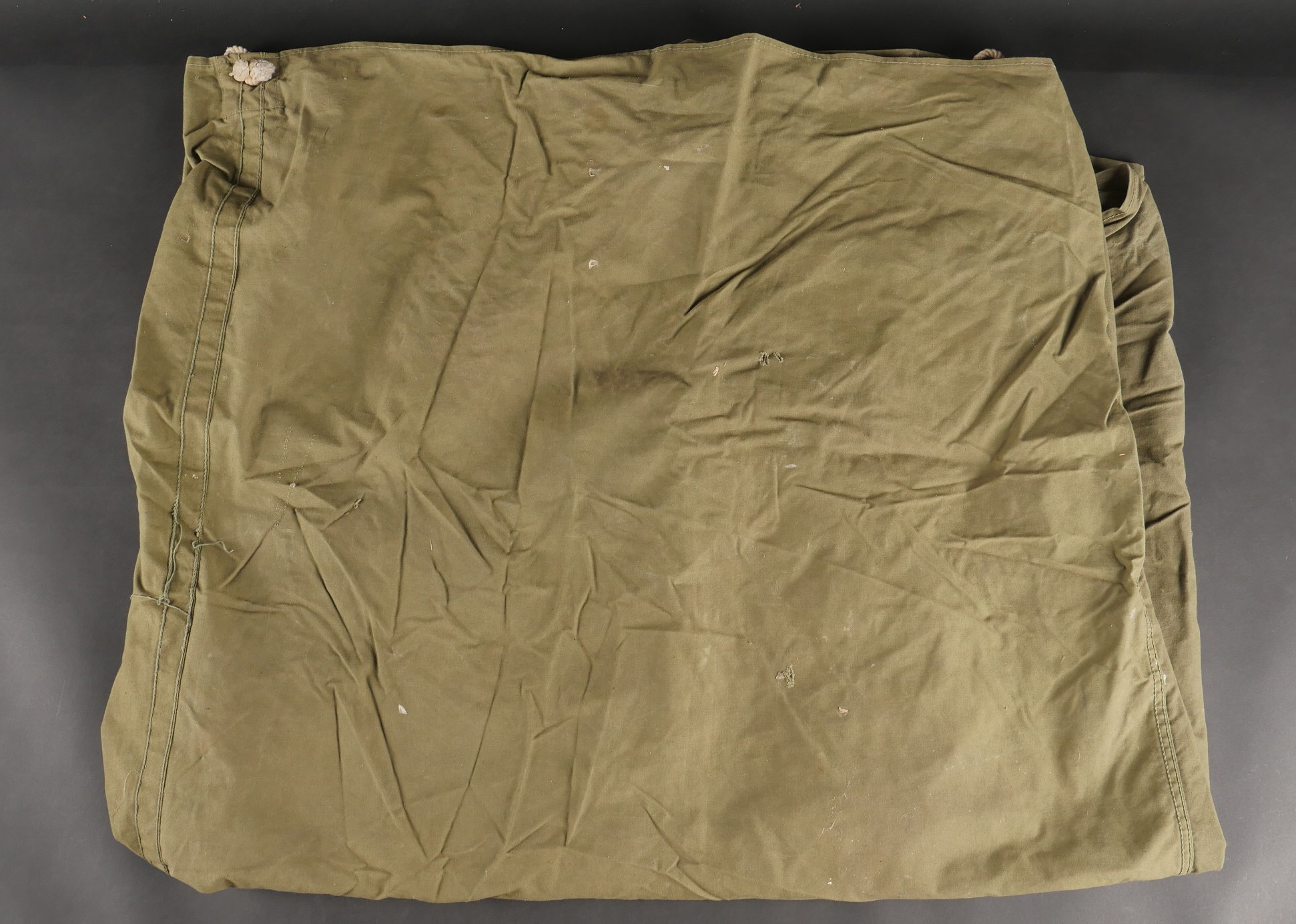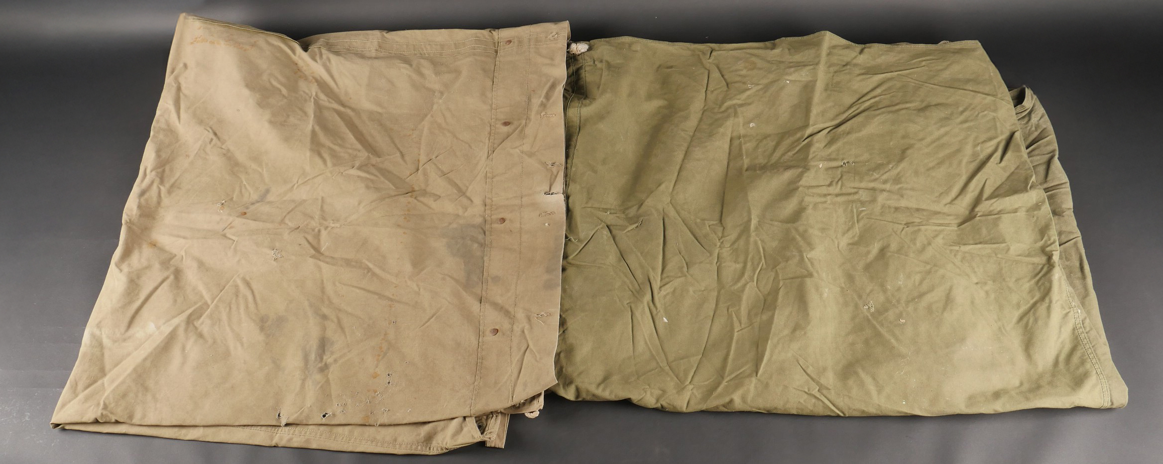 Toiles de tente US. Deux toiles de tente US, une OD3 et une OD7. Trous, accrocs et manques. Laundry Number F3104 présent sur l’une. Divers états de conservation.