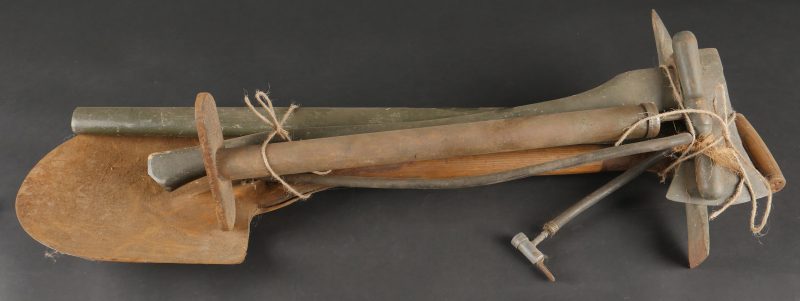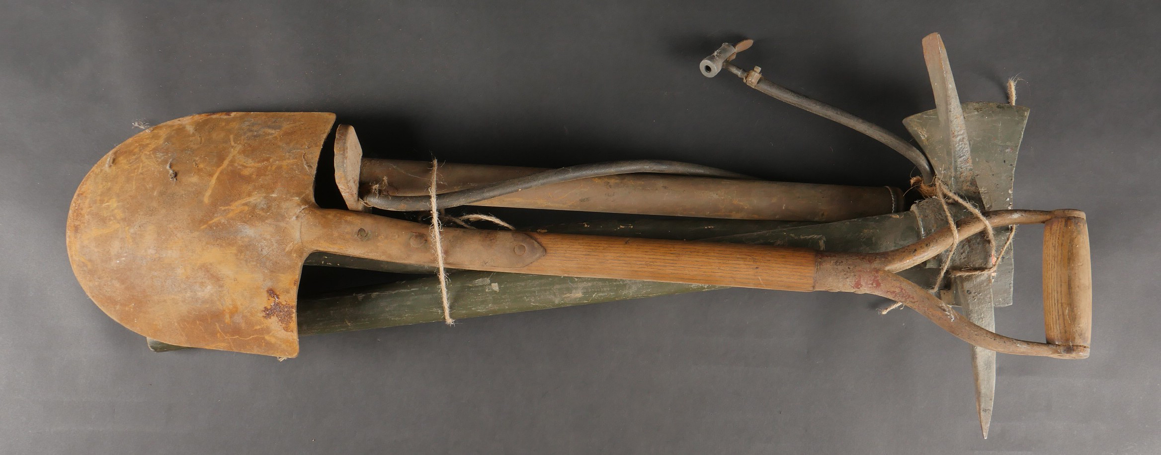 Détails de la vente >US ww2 lot d’outils de bord. Composé d’une pelle, une pioche, une hache et une pompe à air
