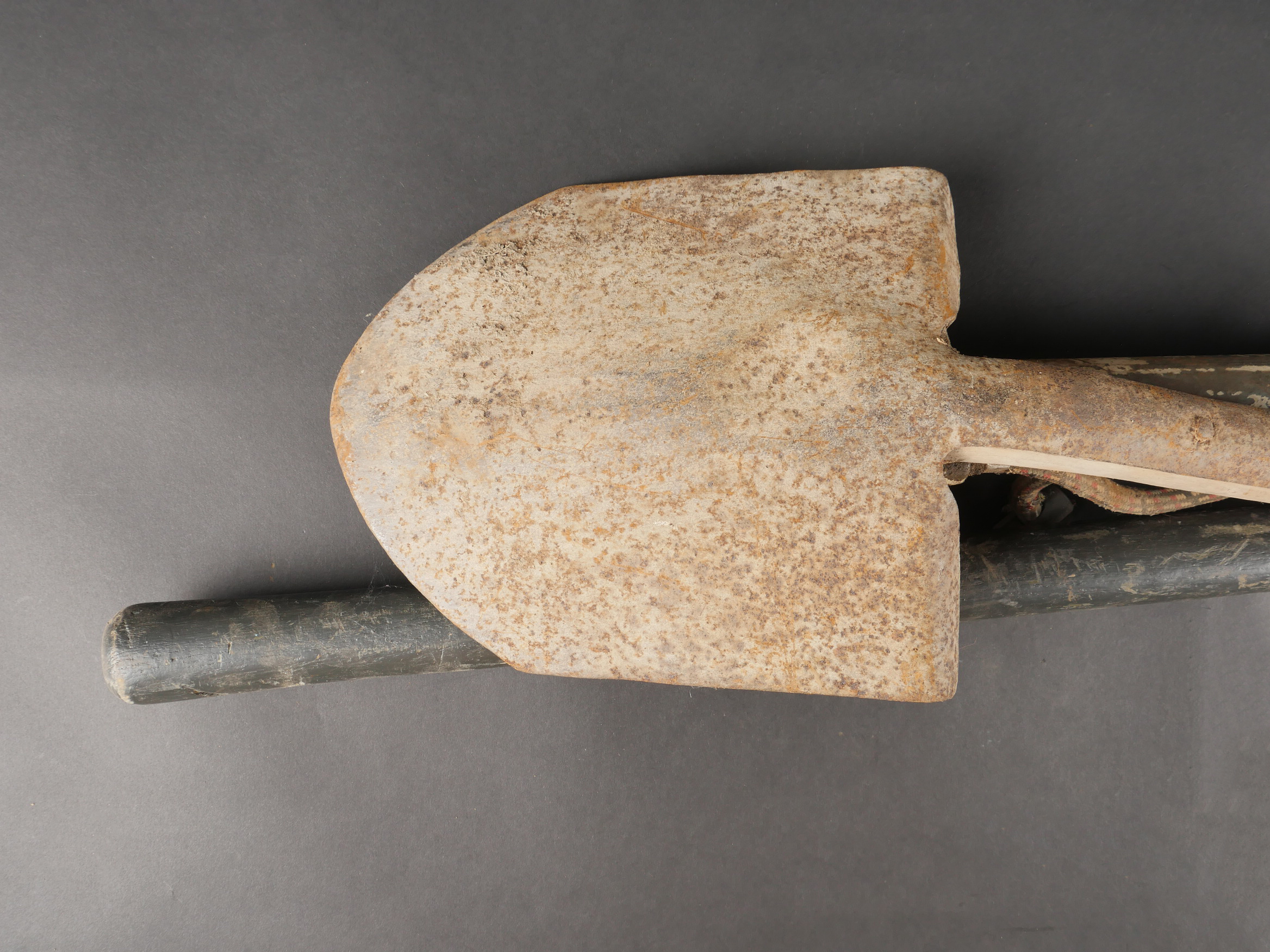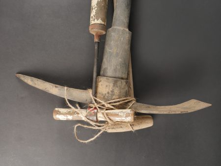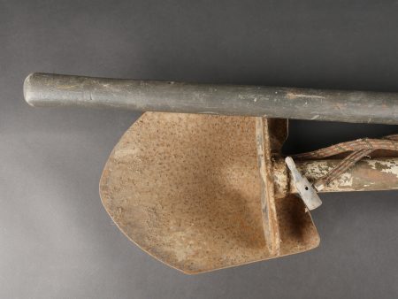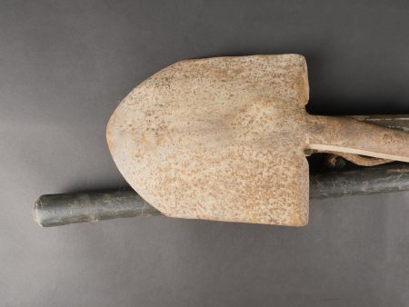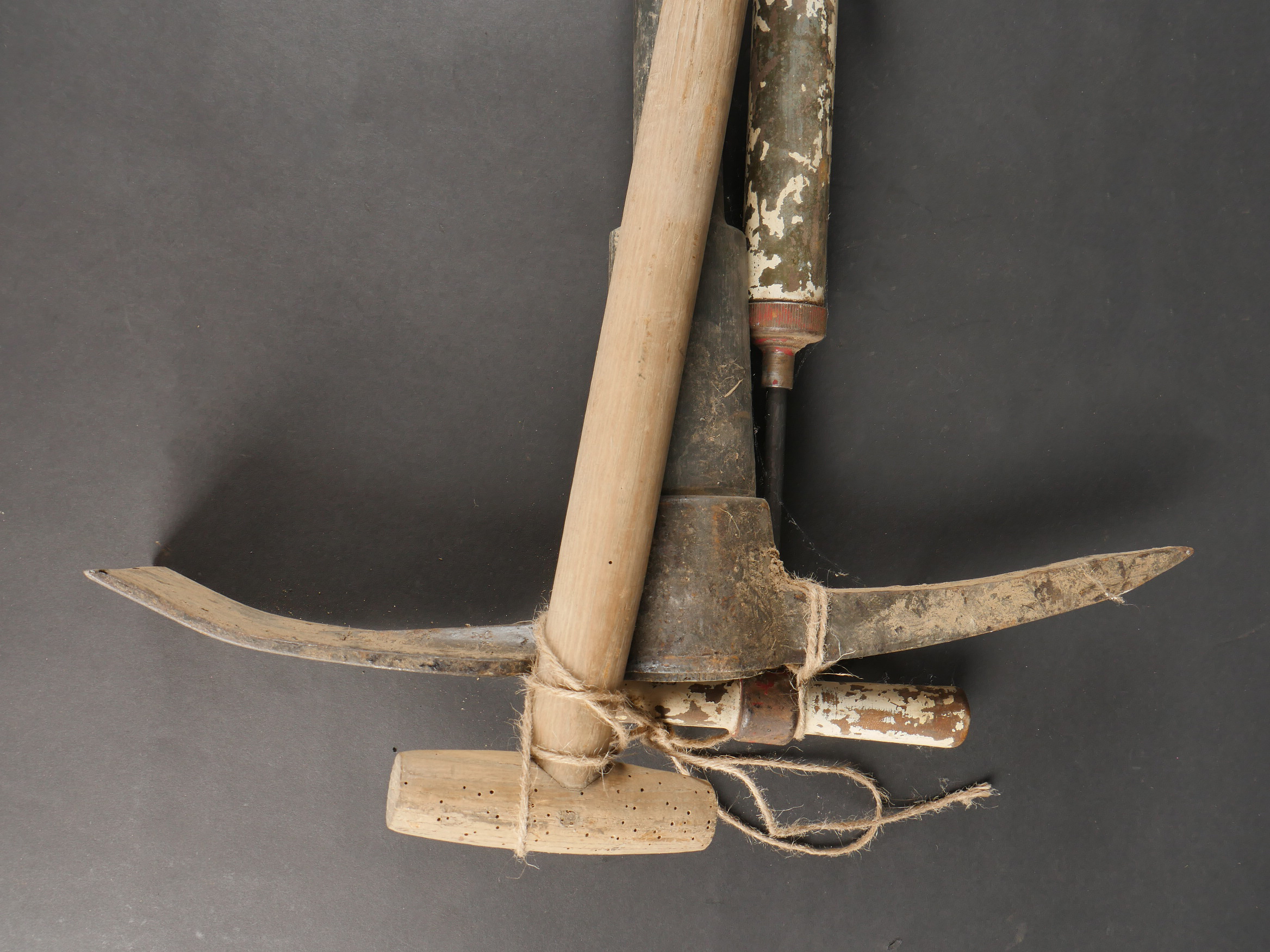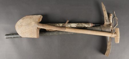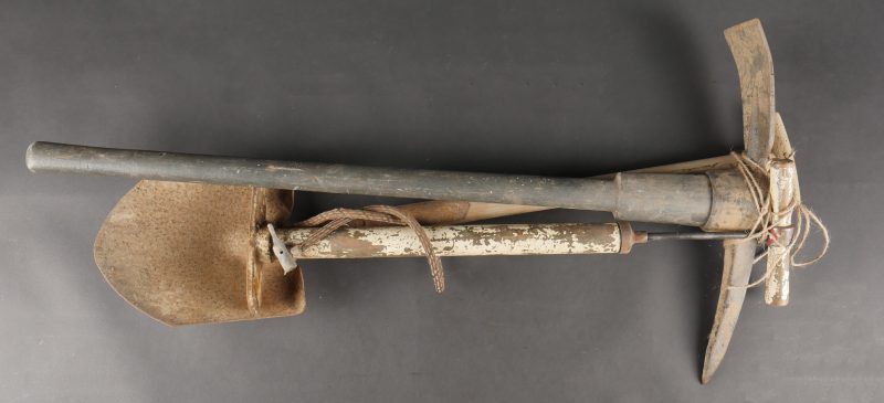 Lot d’outillage. Une pompe à air peinte en blanc, une pelle et une grosse pioche