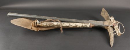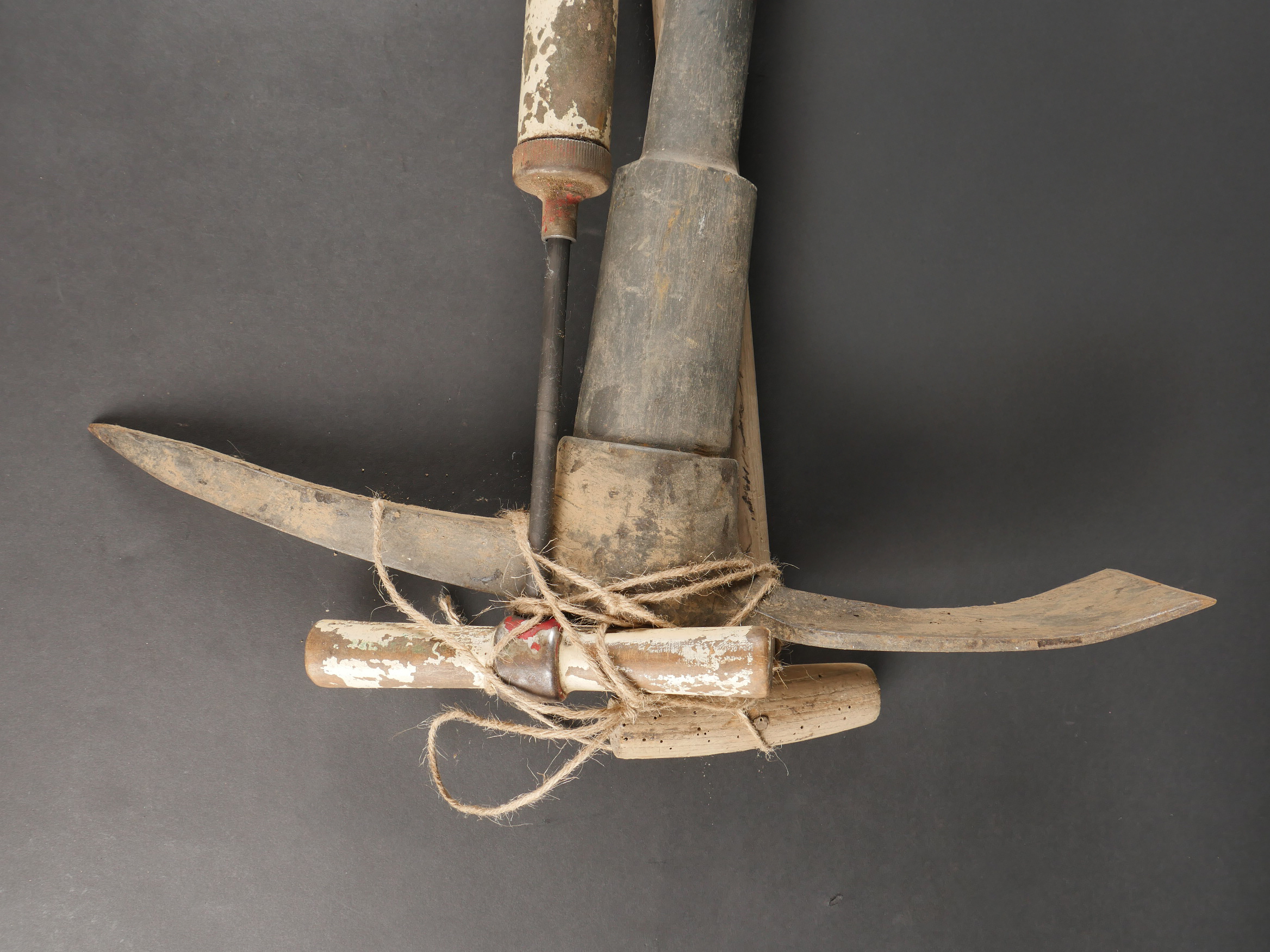 Détails de la vente >Lot d’outillage. Une pompe à air peinte en blanc, une pelle et une grosse pioche